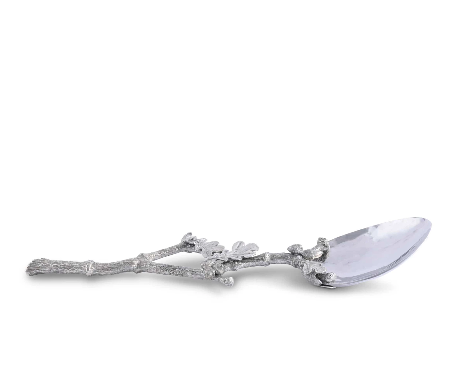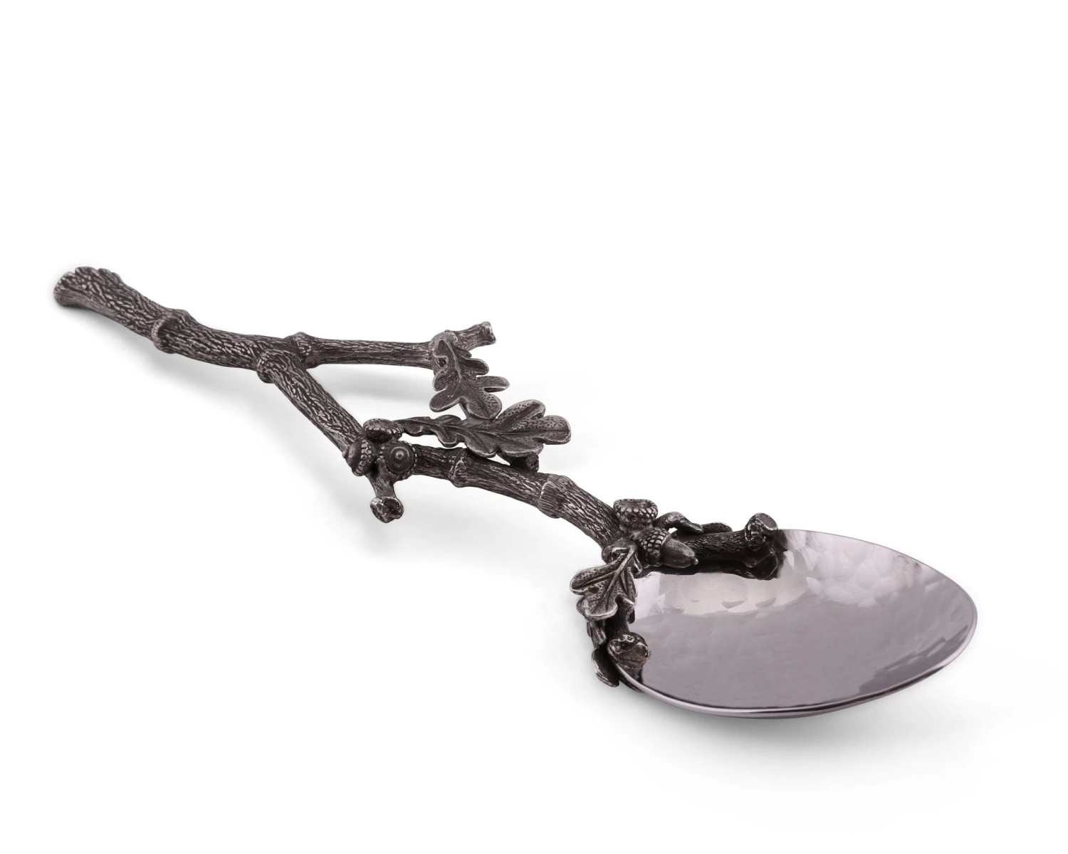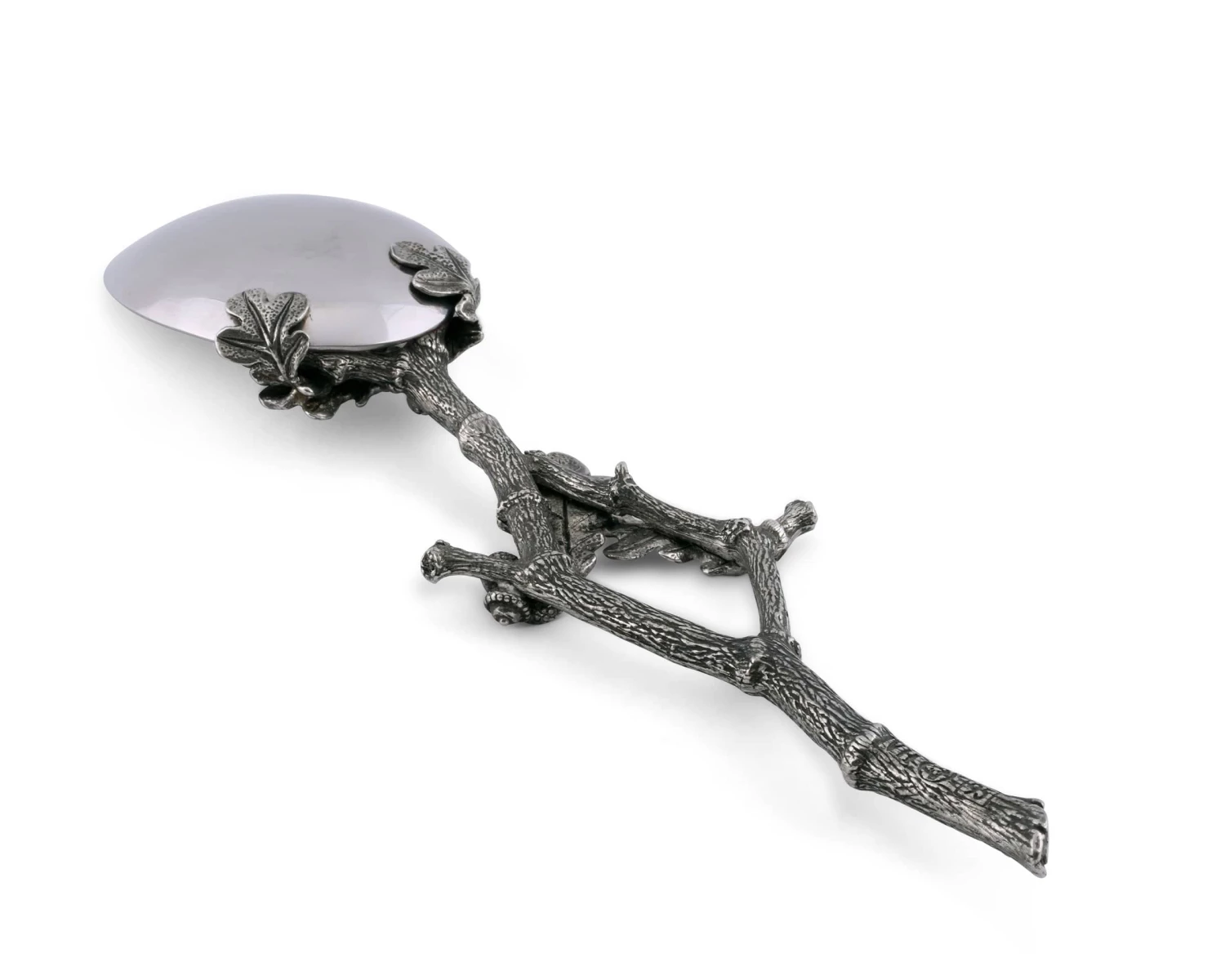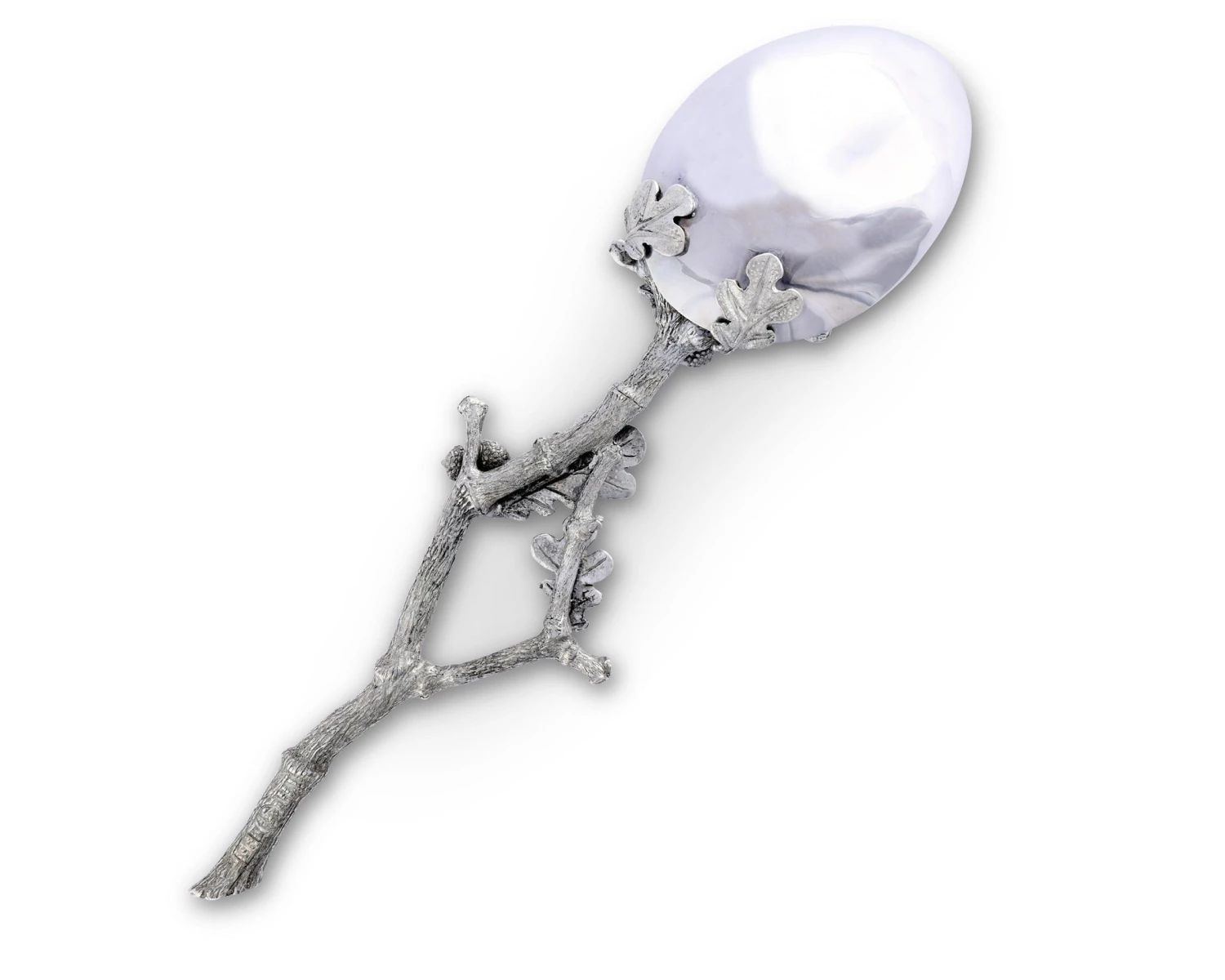 A slender, pewter twig of pewter laden with tiny oak leaves and acorns forms the handle of our unique Acorn & Oak Leaf Serving Spoon. The handle is lightly antiqued to highlight the detailed artwork. Finished with a high quality stainless steel bowl, the spoon is so pretty we love to show it off at buffets.