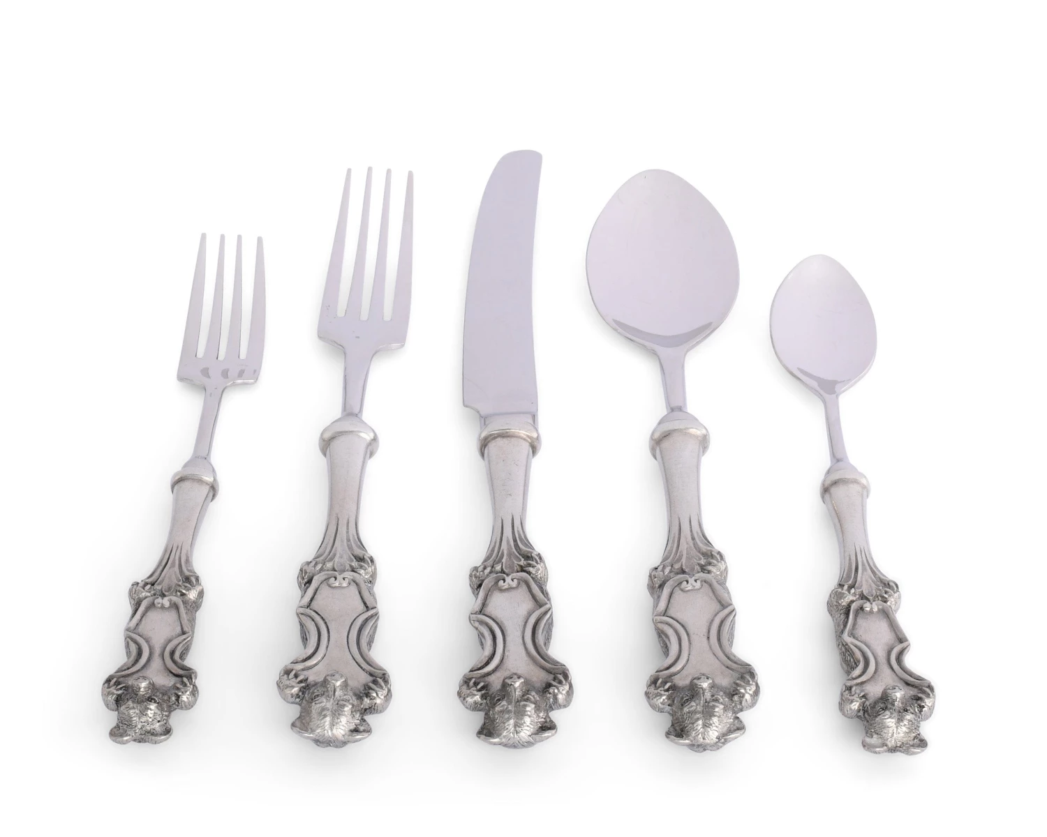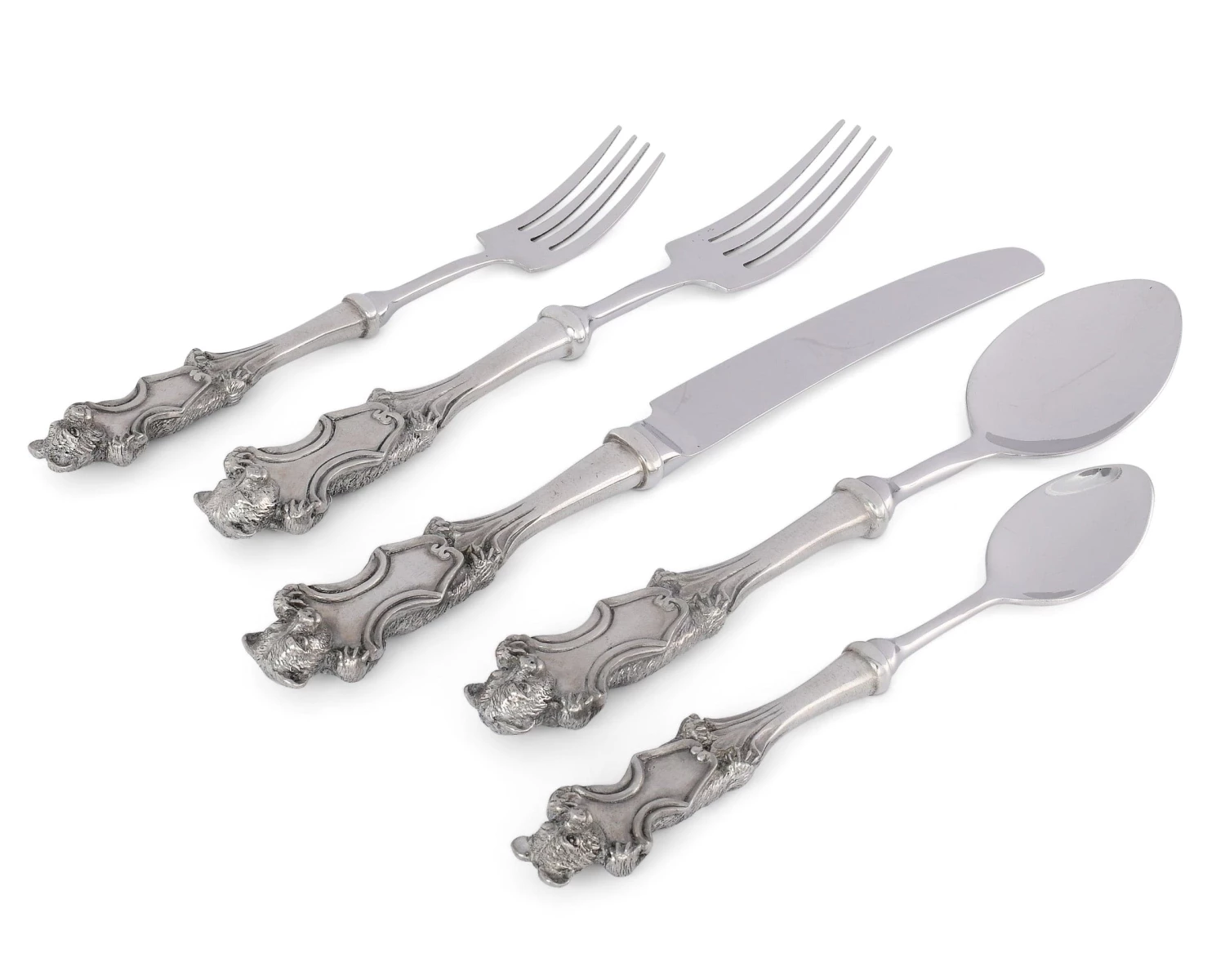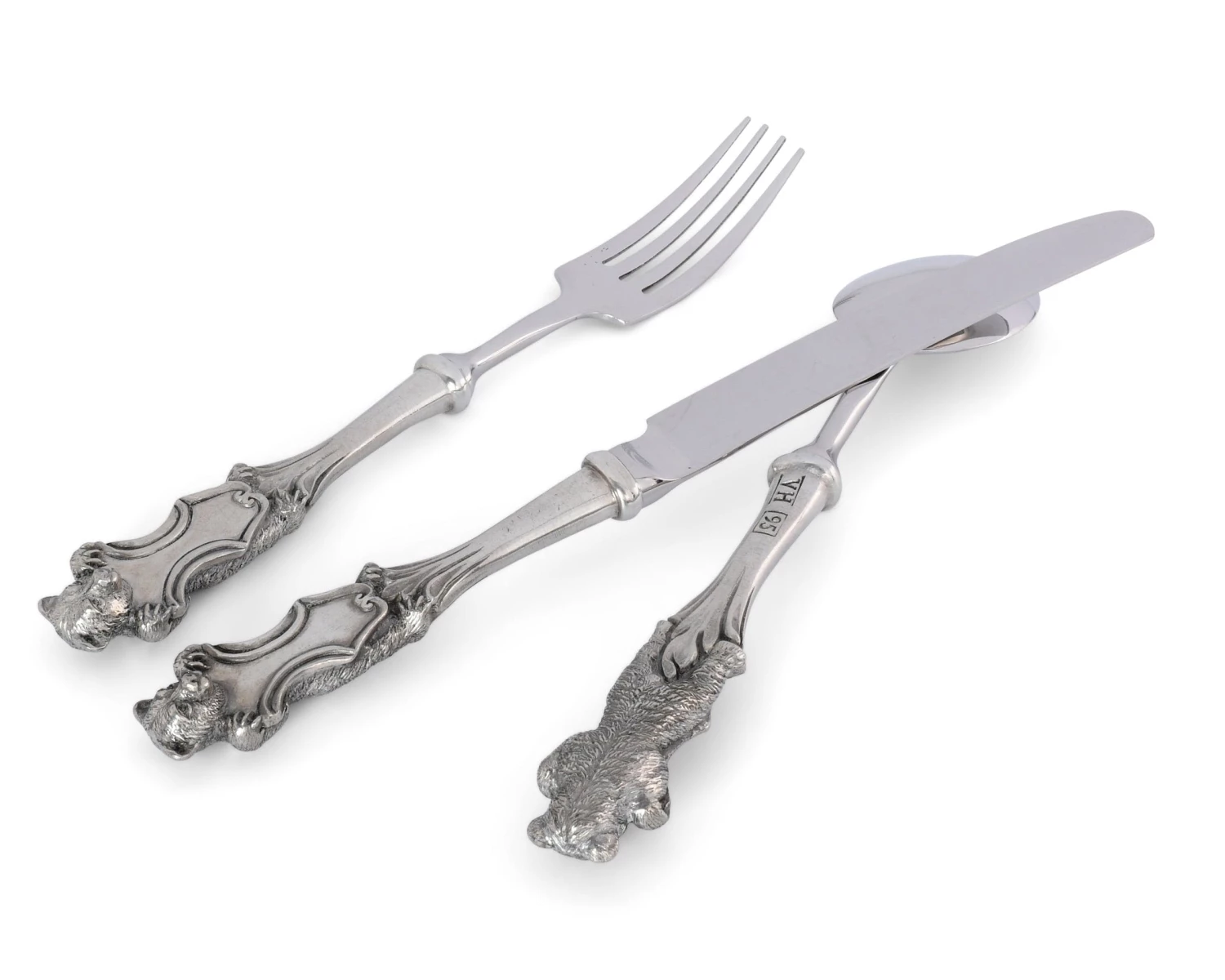 Put a fun spin on formal entertaining with the whimsical design of Vagabond House’s Bear Flatware Set. A curious bear pokes its head and paws out from behind a plate at the end of each pure-pewter handle. The remarkable definition within the animal’s face and limbs make it appear darker than the surrounding material. Stainless steel utensils offer an elegant finish as they emerge from each grip.