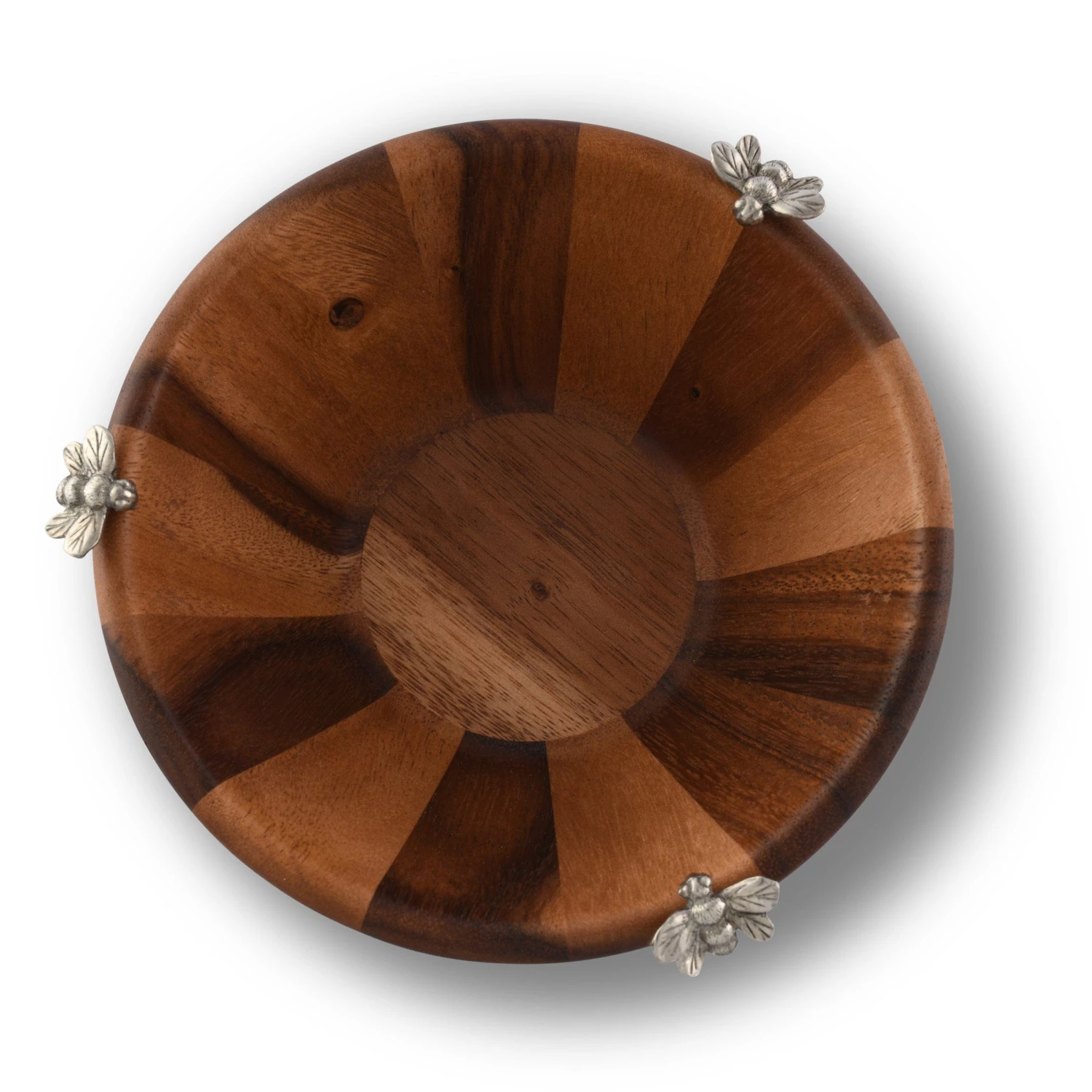 Three, tiny, detailed pure-pewter honeybees buzz along the edge of our hive shaped single-serve bowl. Hand-turned, extremely durable acacia hardwood has beautiful warm golden tones. Acacia is naturally chatoyant, color changing in different lighting. Stylish service for single salads and sides.