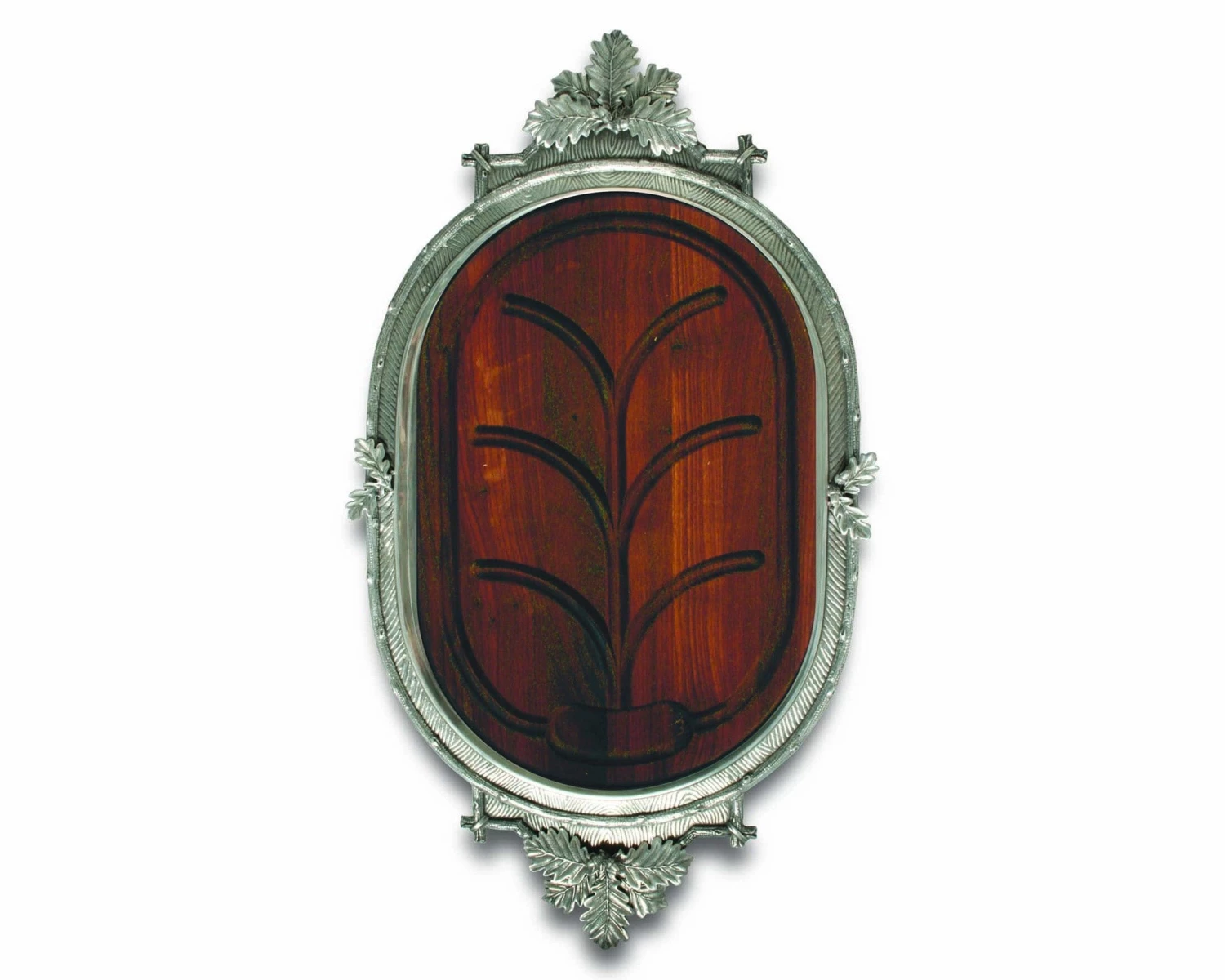 The pewter embellishment incorporates sprays of oak leaves accented with acorns on the handles and sides. The surrounding rim has hammer and beading details. We chose cherry wood for this majestic board because of its properties of strength and beauty. With age and use cherry wood darkens elegantly, enhancing the beauty of your heirloom carving board.