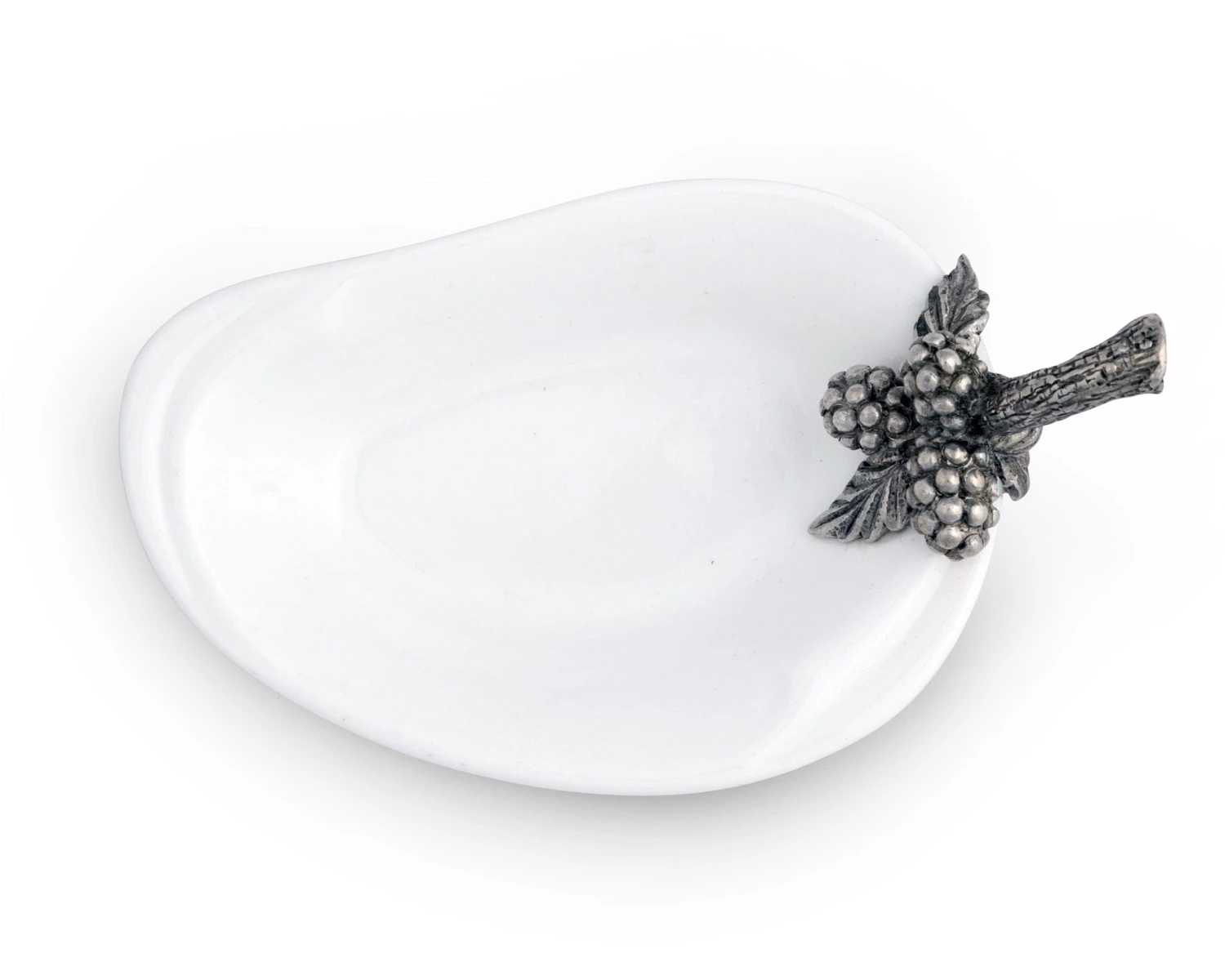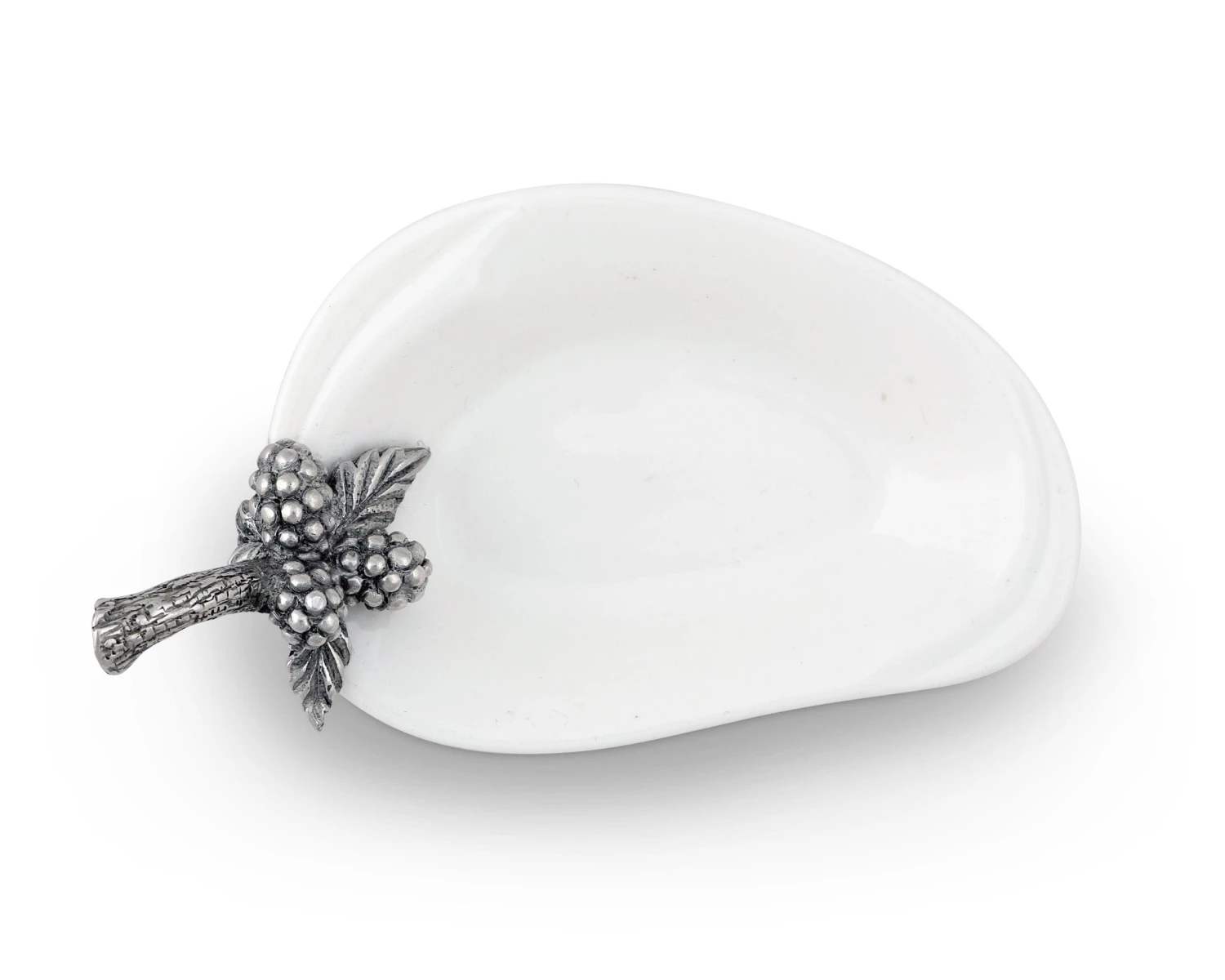 Vagabond House’s porcelain Blackberry Jam Server / Spoon Rest is truly multi-functional. Not only will it keep counters clean from messy spoons, it can also be a small serving plate for jam, berries and other toppings. The hand-glazed dish is finished with a detailed pewter spray of blackberries.