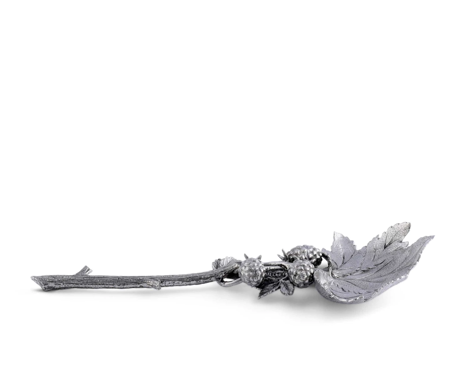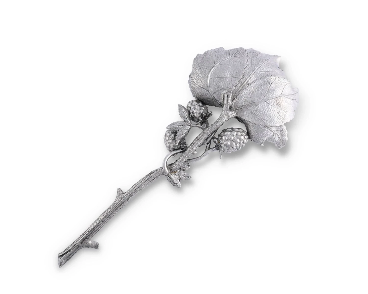 Vagabond House’s Blackberry Serving Spoon combines both form and function within its stunning design. Exquisitely detailed in luxury-grade pewter, this piece features a knobby branch as the handle and a wide, veiny leaf at the head. Blackberry vines twist around the spoon’s neck, while patterned fruit and foliage extend from the stems.