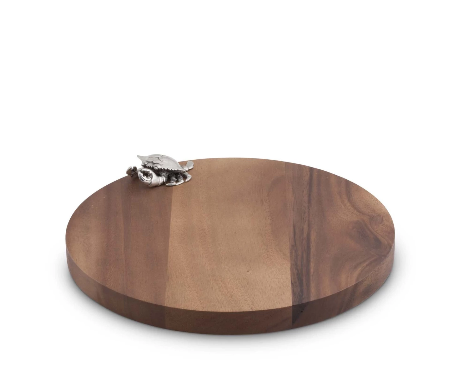 Present your carefully chosen cheese selection or seafood condiments on our lustrous, golden toned acacia cheese board finished with pewter Maryland Blue Crab embellishments. The board is crafted from naturally chatoyant, moisture resistant acacia wood.