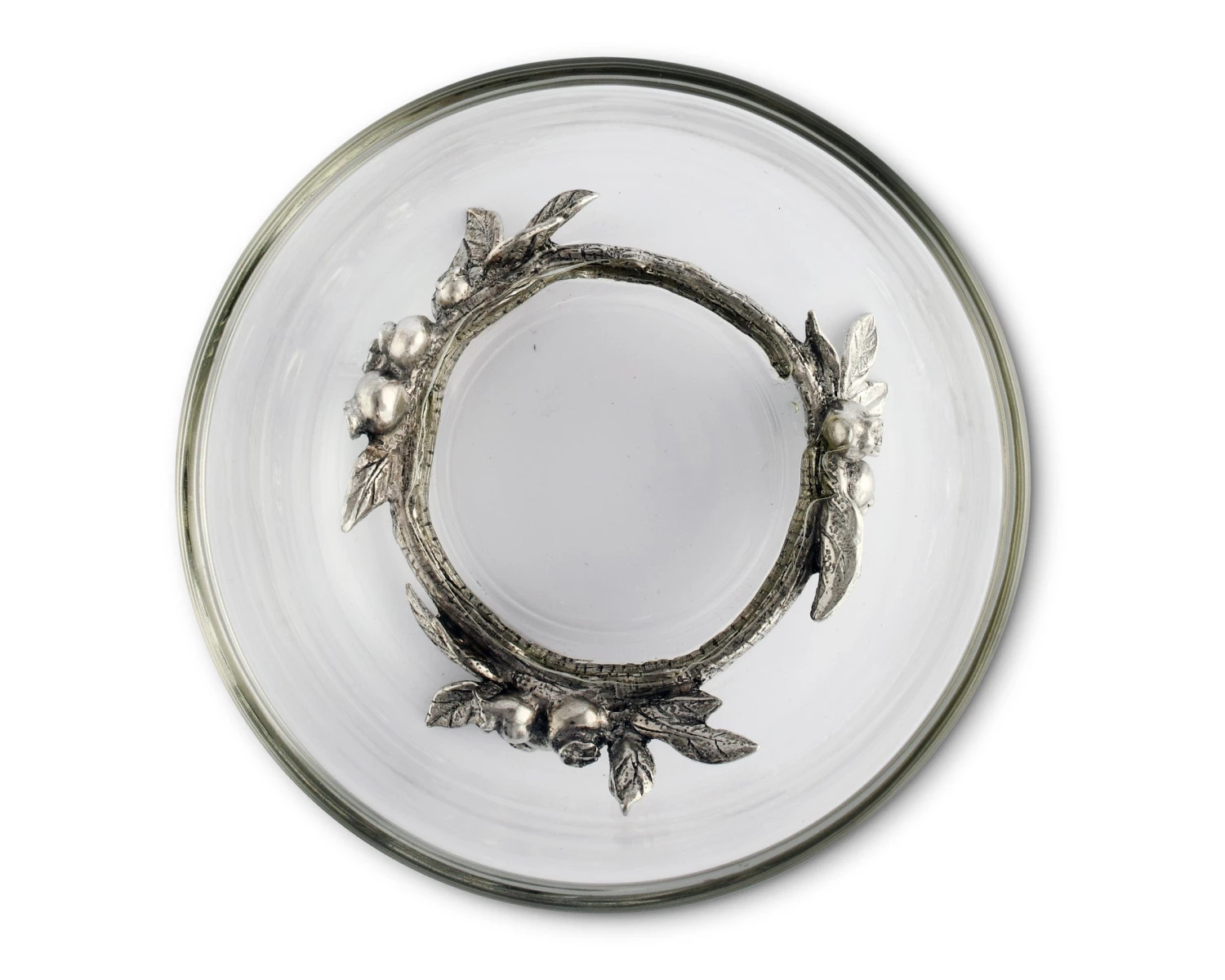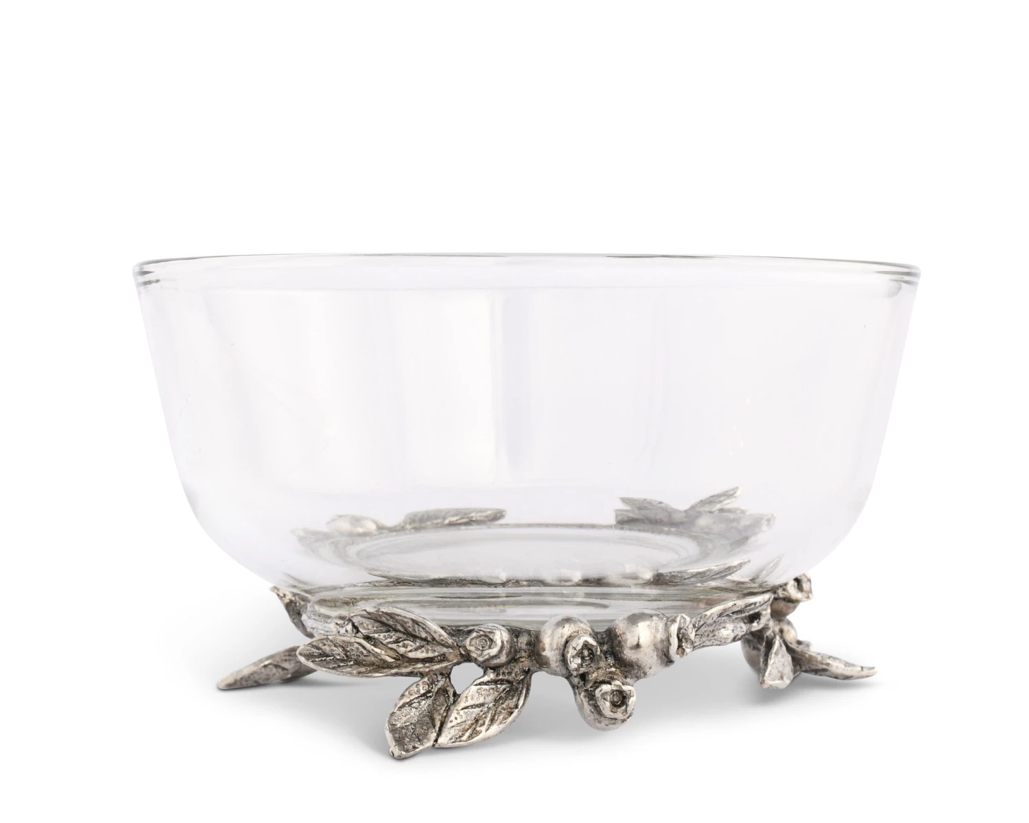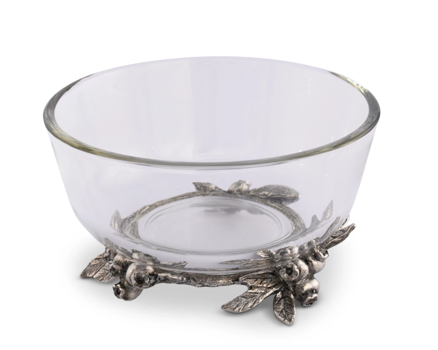 Clusters of blueberries and leaves function as legs for this piece as they combine to create a pure-pewter wreath underneath the bowl. The realistic definition within the fruit and foliage sticks out even when the glass is full.