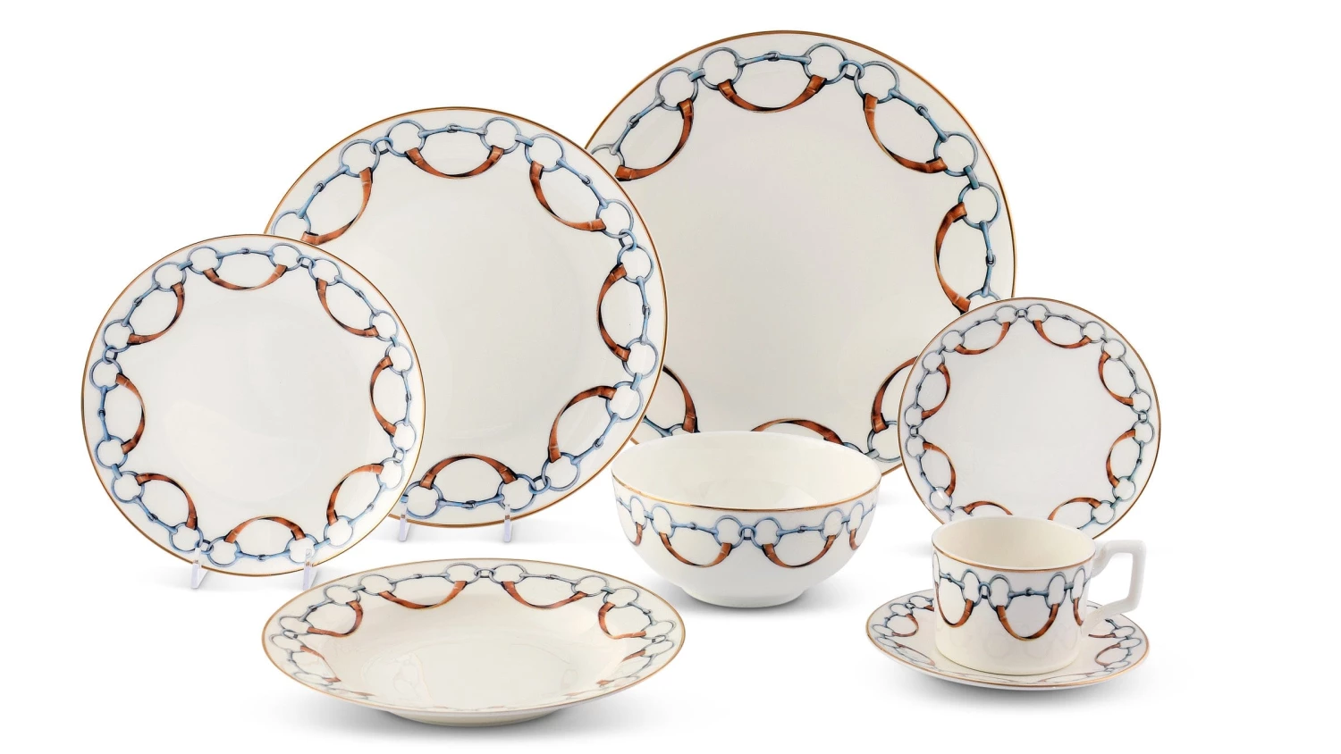 The Wellington Bit collection is a sleek twist on the iconic equestrian snaffle bit theme, taking it a step further into a striking Bone China dinnerware collection of polished sophistication. Whether tail-gaiting at the polo field or setting an elegant table for a formal dinner party, Vagabond House presents a statement of classic high style and is sure to garner attention and admiration. Fine Bone China was designed and hand-drawn by Vagabond House’s master artist Leesa Greenlee. Shiny Gold rimmed add a formal class and style