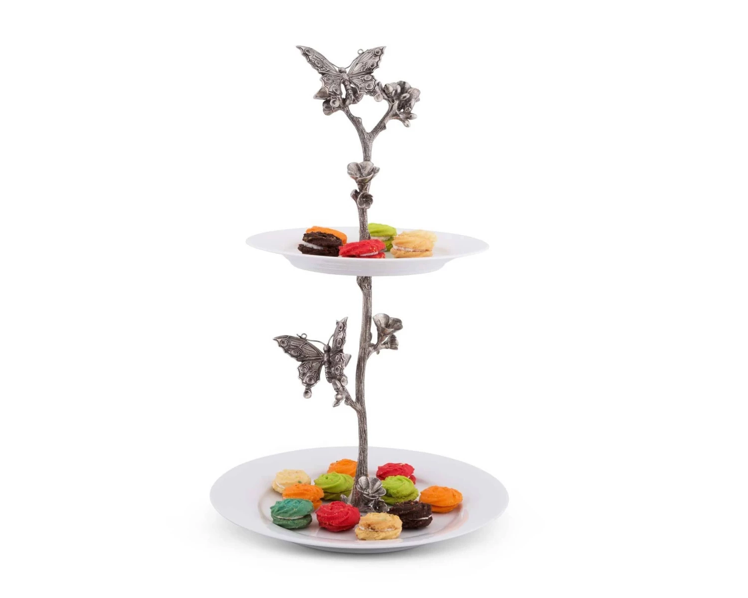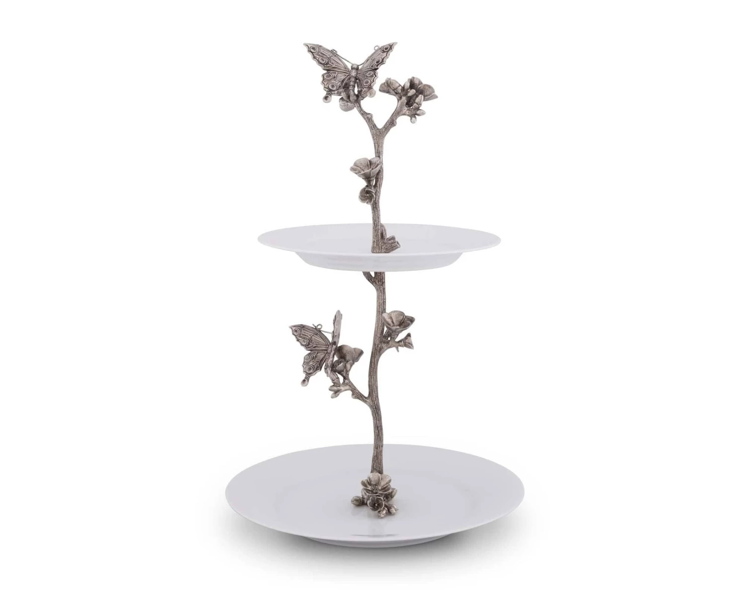 Beautiful butterflies flutter near delicate Dogwood blooms, decorating Vagabond House’s pewter and porcelain Butterfly Dessert Stand. Luxury grade pewter is hand-cast as a Dogwood branch embellished with blooms to form the support column for two porcelain dessert plates. Adding extraordinarily detailed butterflies fluttering near the blooms creates a small bites server that will be as talked about as the treats you serve on it.