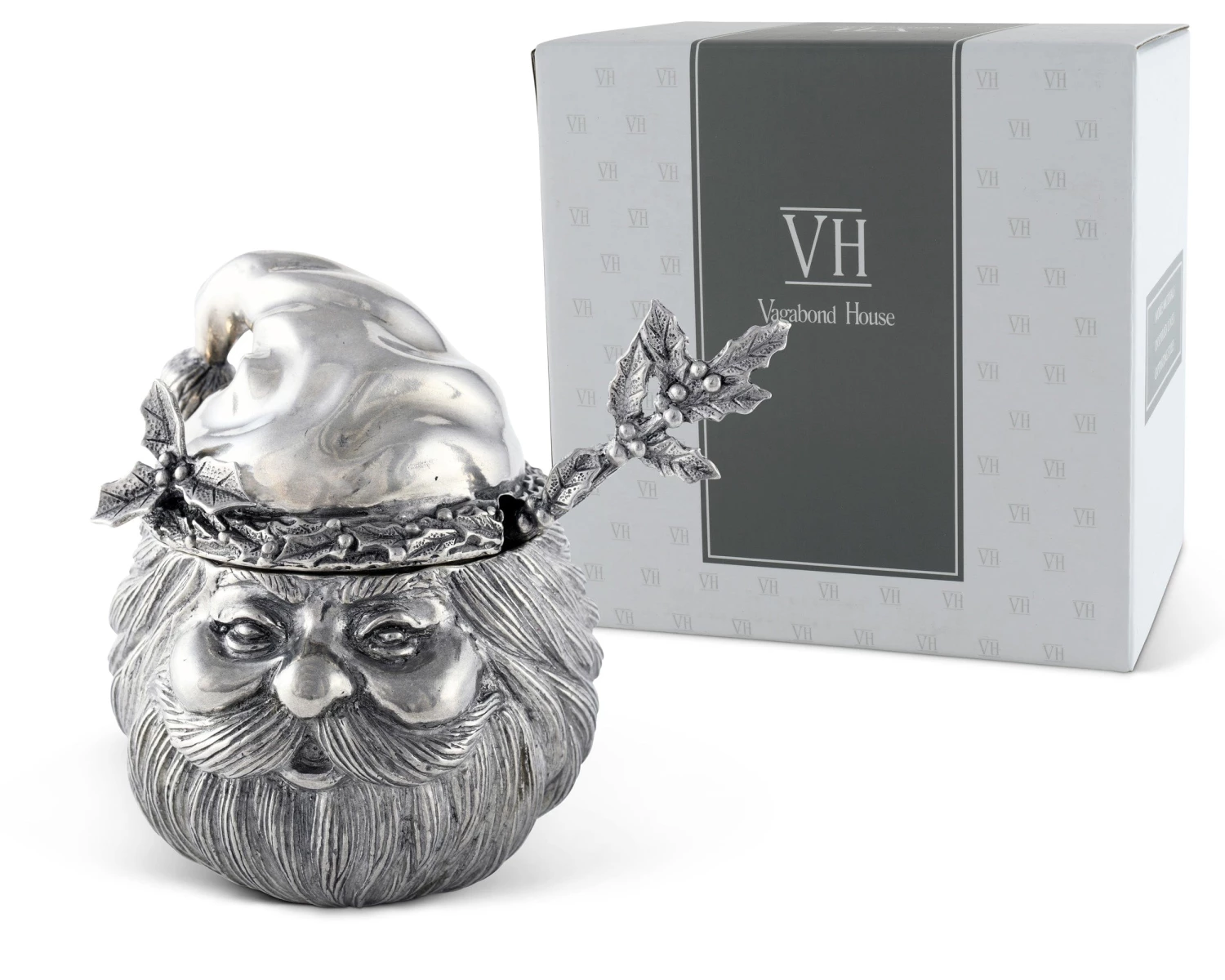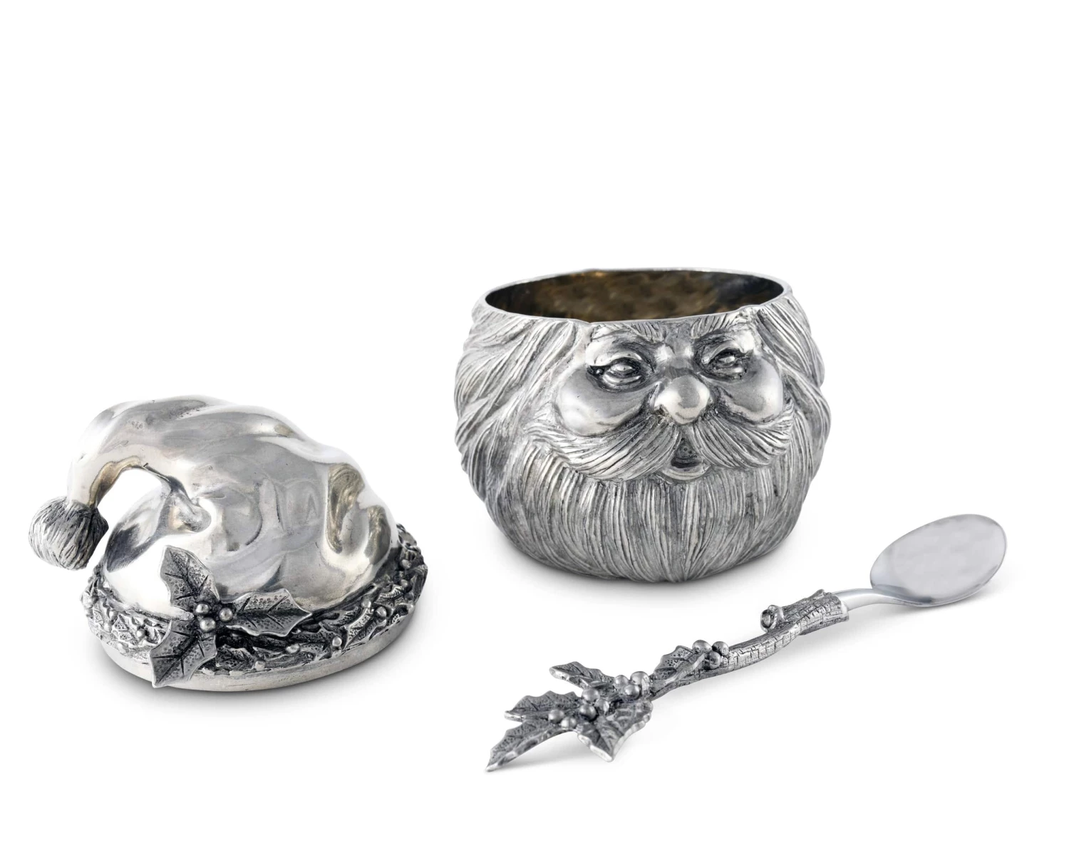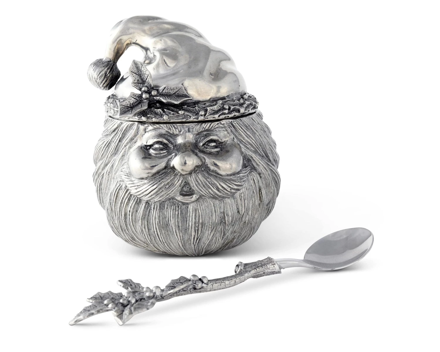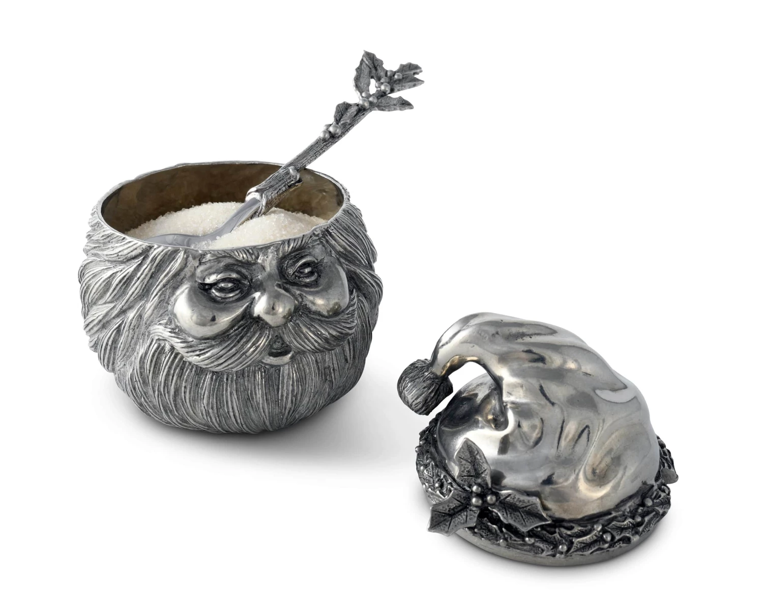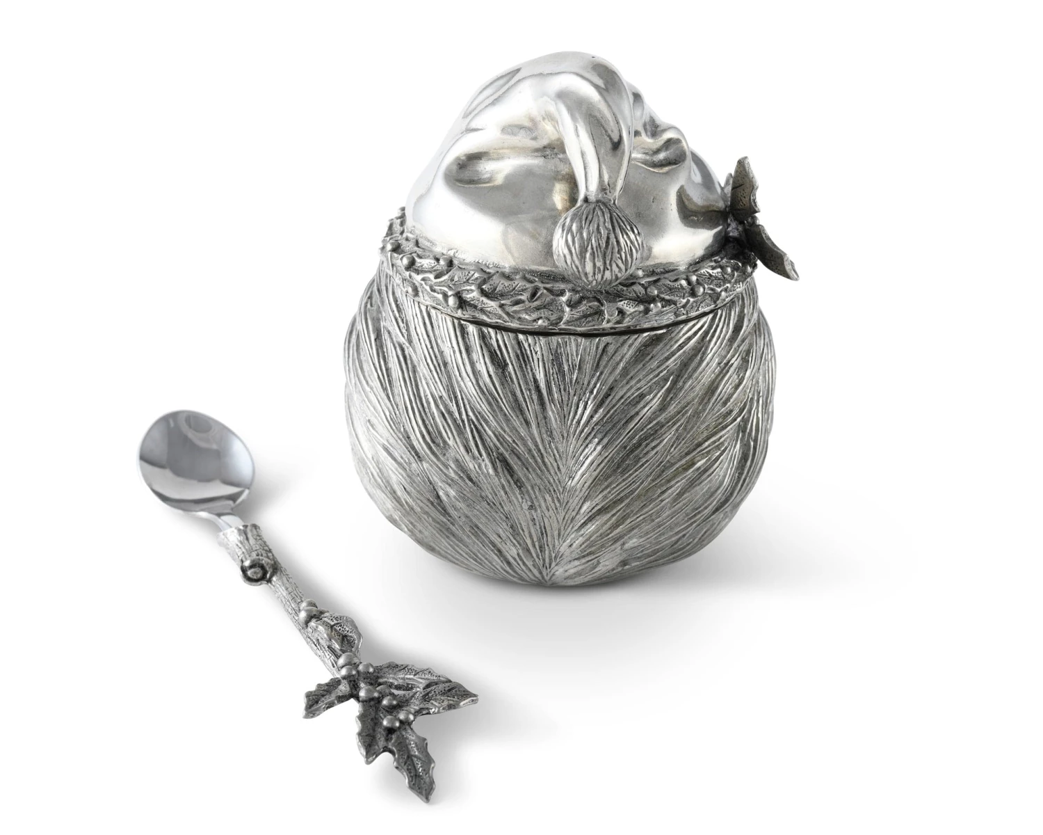 Crafted in the shape of Santa’s head, our sugar bowl captures his jolly spirit in pure-pewter form. Thick, defined hair covers much of St. Nick’s round face and head, while his hat droops with the weight of a pom-pom. A hand-painted holly branch injects some color into this exquisite design as it extends from the ornamental band on Santa’s hat. Spoon sold separately.