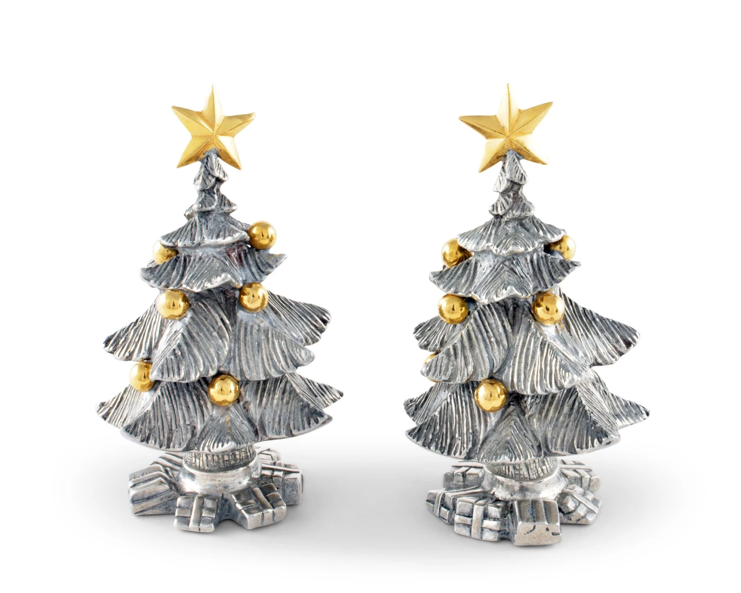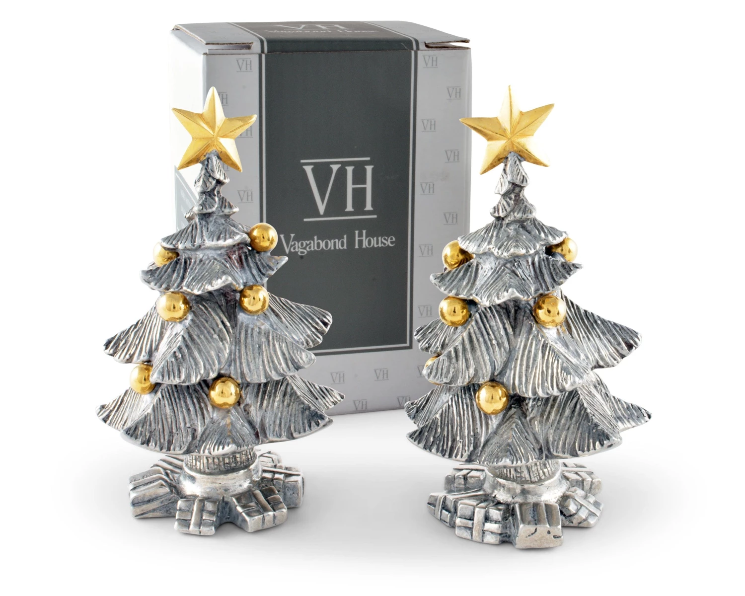 The Christmas salt and pepper shakers are finely crafted in pewter, its shaker holes are found among the intricately detailed tree branches and you can easily refill with Salt & Pepper by unscrewing the shaker bottom. Exclusively designed by Vagabond House.