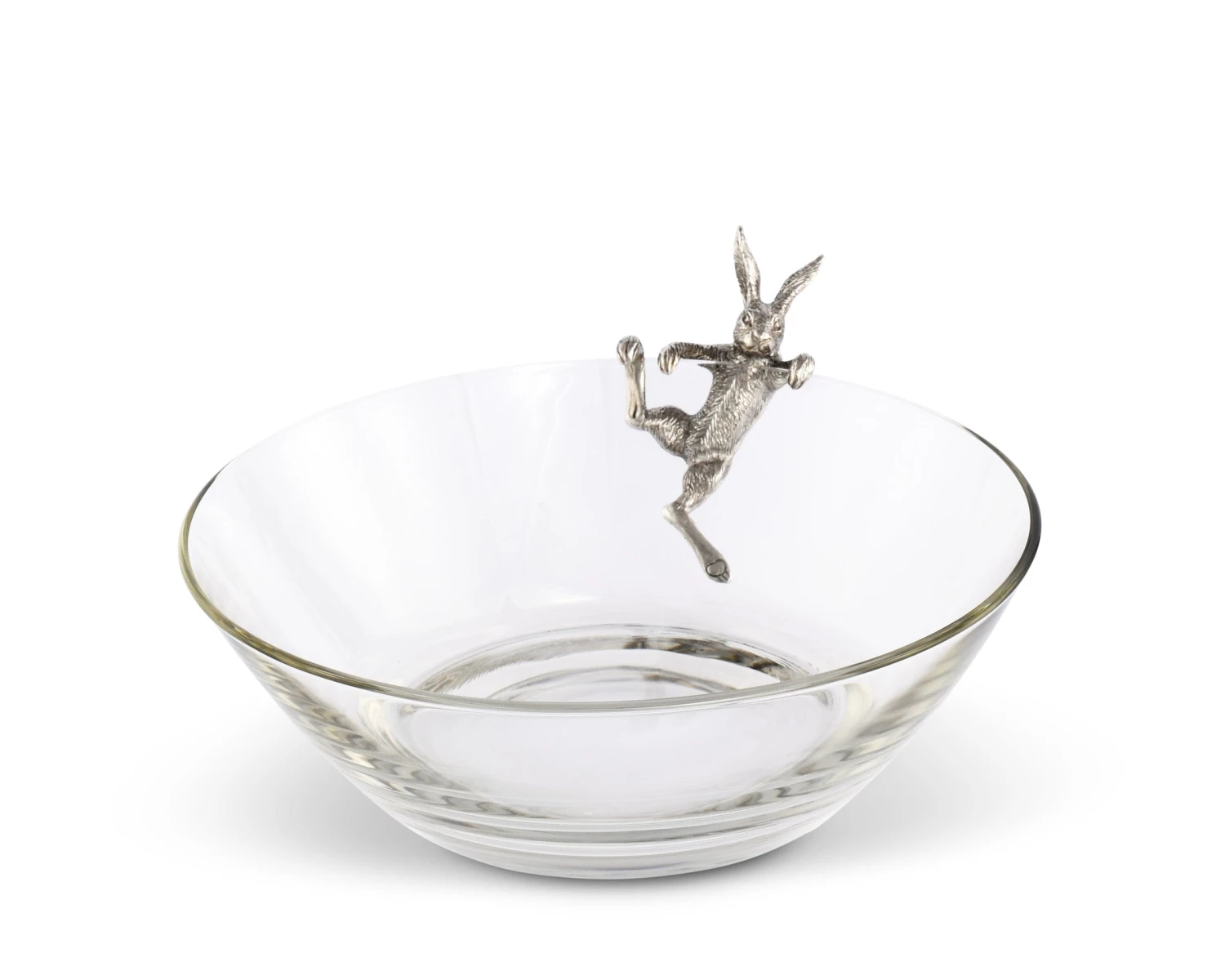 Bring the warmth of laughter to your home with the lighthearted style of this Vagabond House Climbing Bunny serving bowl. Handcrafted from the highest quality materials and covered in lifelike detail from the tips of his long ears to the toes of his dangling paw, this solid pewter bunny and his mischievous antics serve as the perfect conversation starter during Easter dinners or spring gatherings. Enchant family and friends with a tabletop display of bunny-shaped candies and cookies or a mantel centerpiece of beautifully dyed eggs. The clear glass of this generous 10 x 10 x 5-inch serving bowl creates a elegant presentation for your offerings. A natural choice for mixtures of colorful vegetables and salad dressings, its thick sides and adorably curious bunny transform even simple side dishes into table highlights.