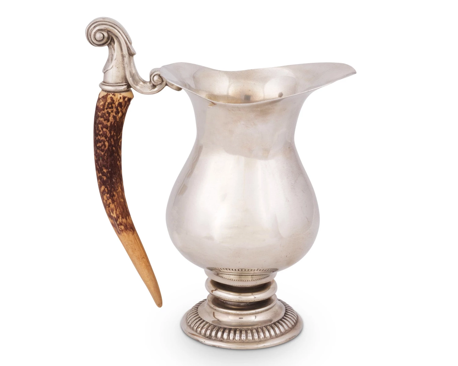 As if pointing out the banded patterns along the base, the unique grip of the handle curves down towards the bottom of the pitcher.