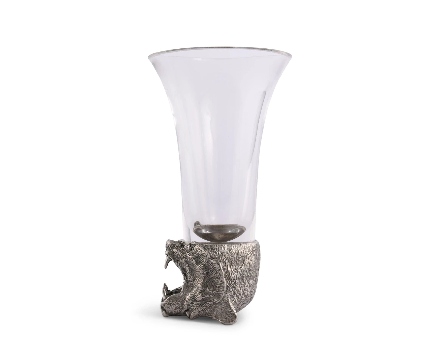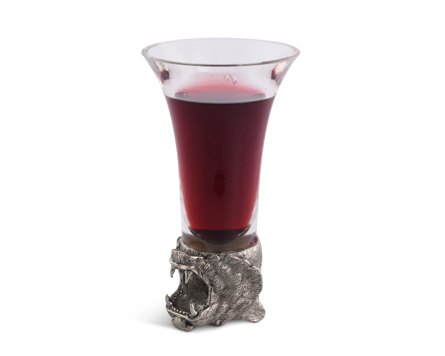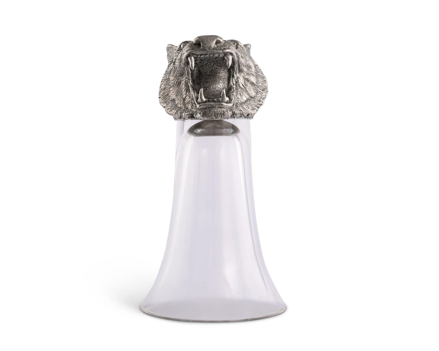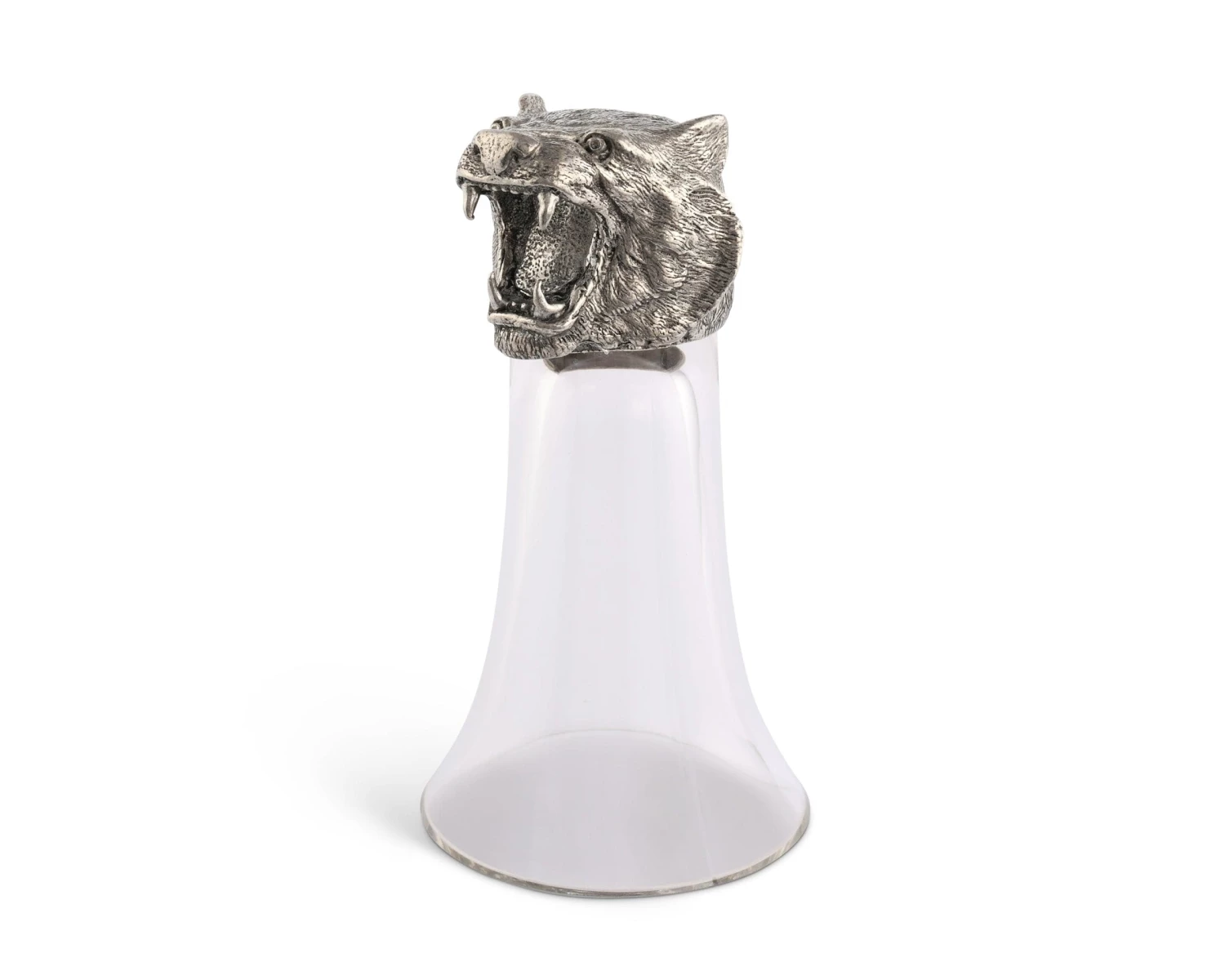 A magnificent cougar head is represented in luxurious, rich pewter detail on our clear glass stirrup cup. bra>Traditionally used after the hunt for farewell drinks of port or sherry, for modern guests, we suggest you consider using them to toast the beginning of a hunt, hike or other outdoor adventure.