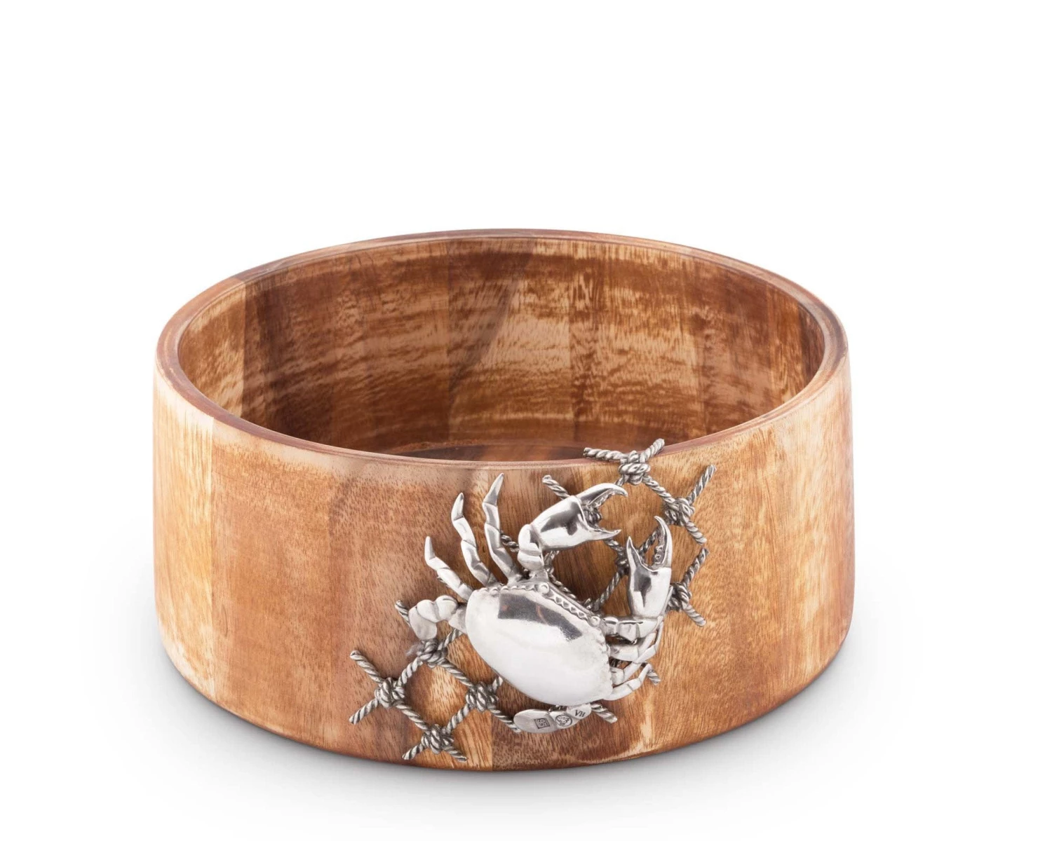 Vagabond Houses’ Crab in Net Salad Bowl is hand-crafted using the hard wood, Acacia. Warm golden tones in the wood contrast with the silvery luxury pewter “crab in a net” figural embellishment. Modeled from the Chesapeake Bay Blue Crab, this net climber sports many details, jointed legs, wicked claws and little round eyes, appearing wide with curiosity