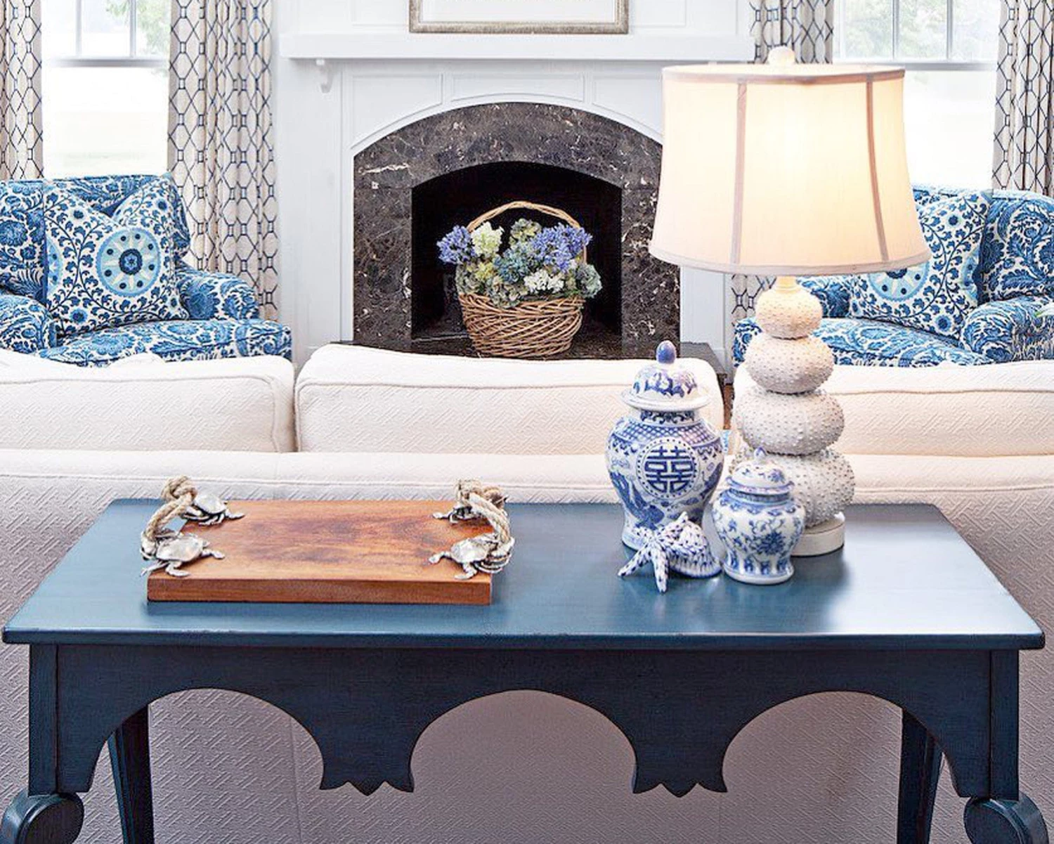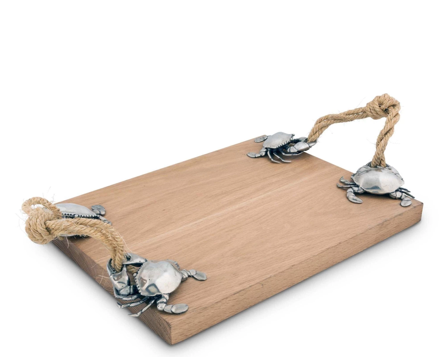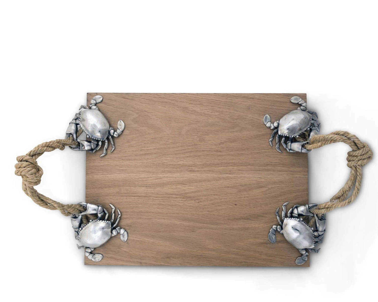 Crafted with a food safe, hand-finish, the Oak board is burled in rich tones of amber. The generously sized tray is finished with four intricately detailed, pewter crabs, each holding an end of the sturdy knotted marine rope handles firmly in their pincers.