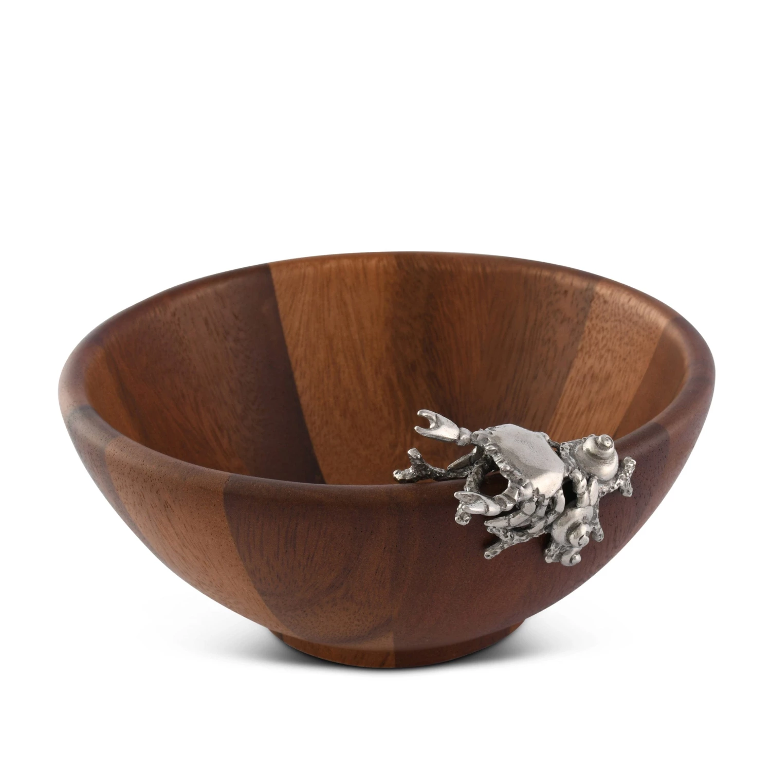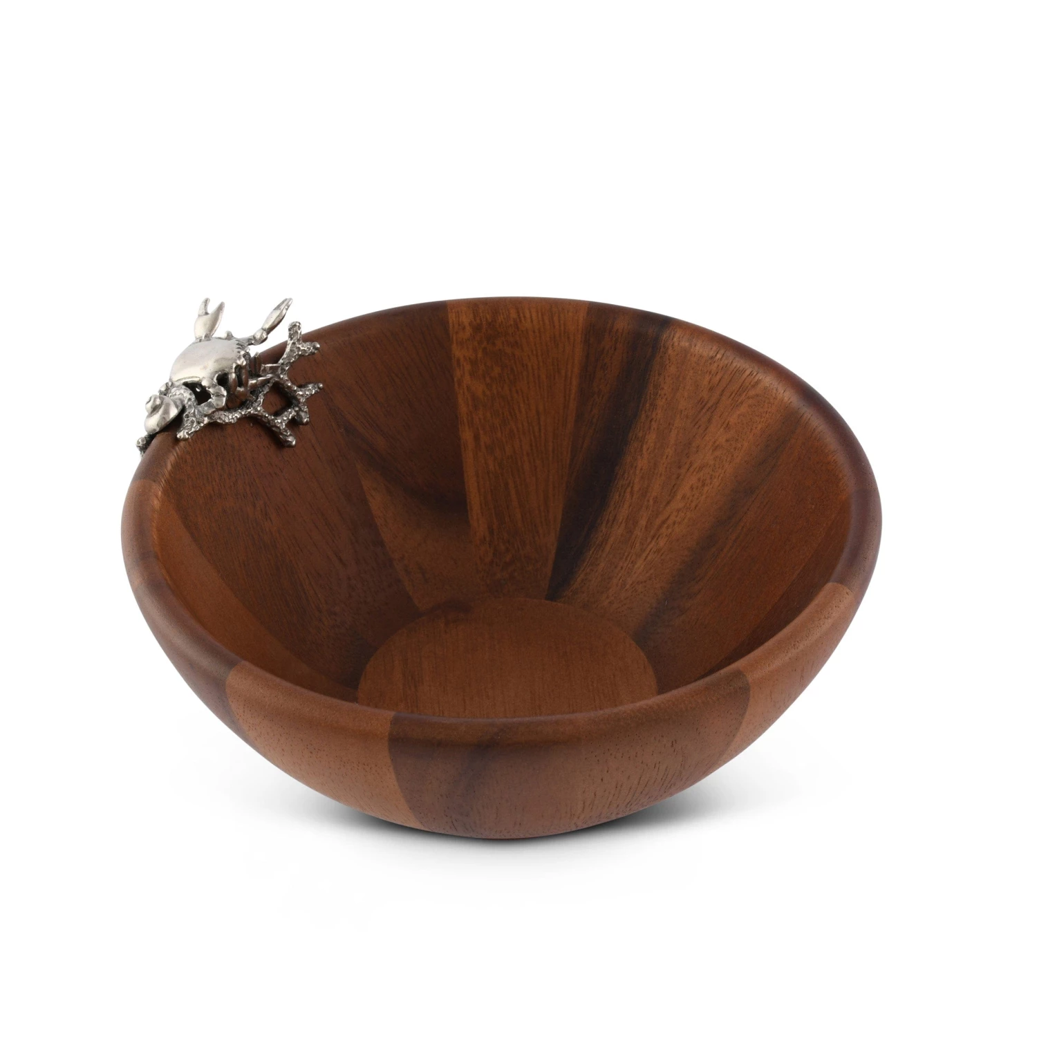 Vagabond House’s Crab Accented Acacia and Pewter Salad Serving Bowls are carved from beautifully burled acacia wood.