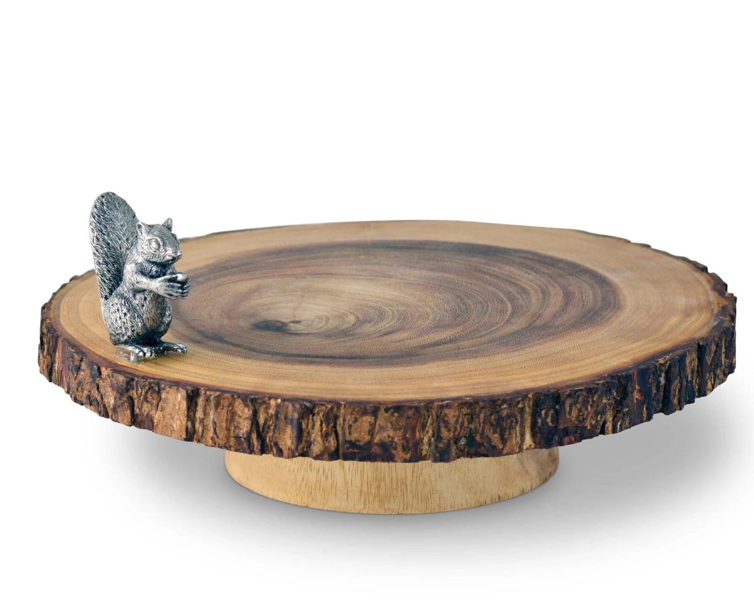 Our Vagabond House signature squirrel has a new perch on this unique cheese stand. Hand crafted and finished, our pewter squirrel looks over your carefully chosen cheese assortment displayed on a rustic “slice” of oak. The beautifully burled wood and clever squirrel create a unique service as remarkable as the tasty bites you serve on it. Hand-wash only, please. For best care, lightly oil wood only with olive or other food safe oil upon receipt and after a few uses. Wipe with damp cloth, disinfect the wood surface with a carefully applied natural antibacterial such as lemon juice or white vinegar. Use caution not to get acidic cleaning agent on the pewter squirrel, it may cause a darkening of the pewter.