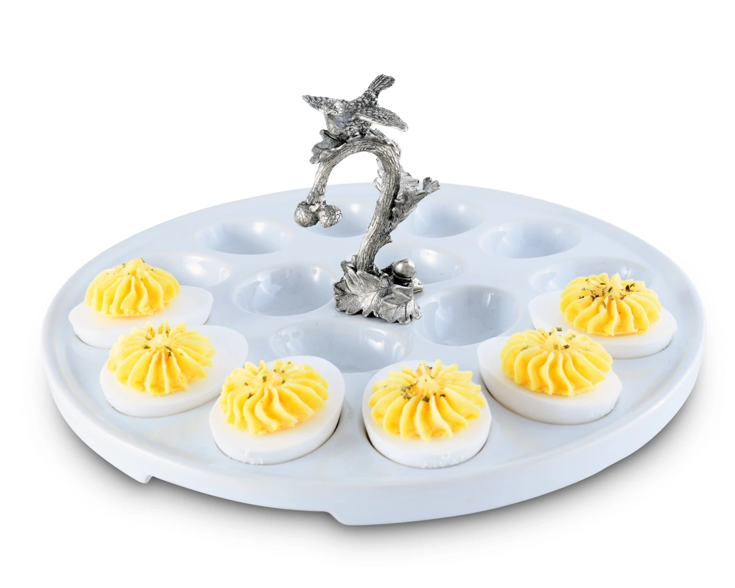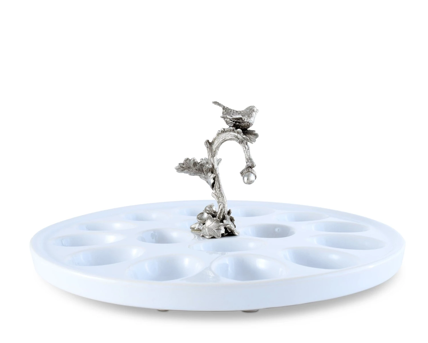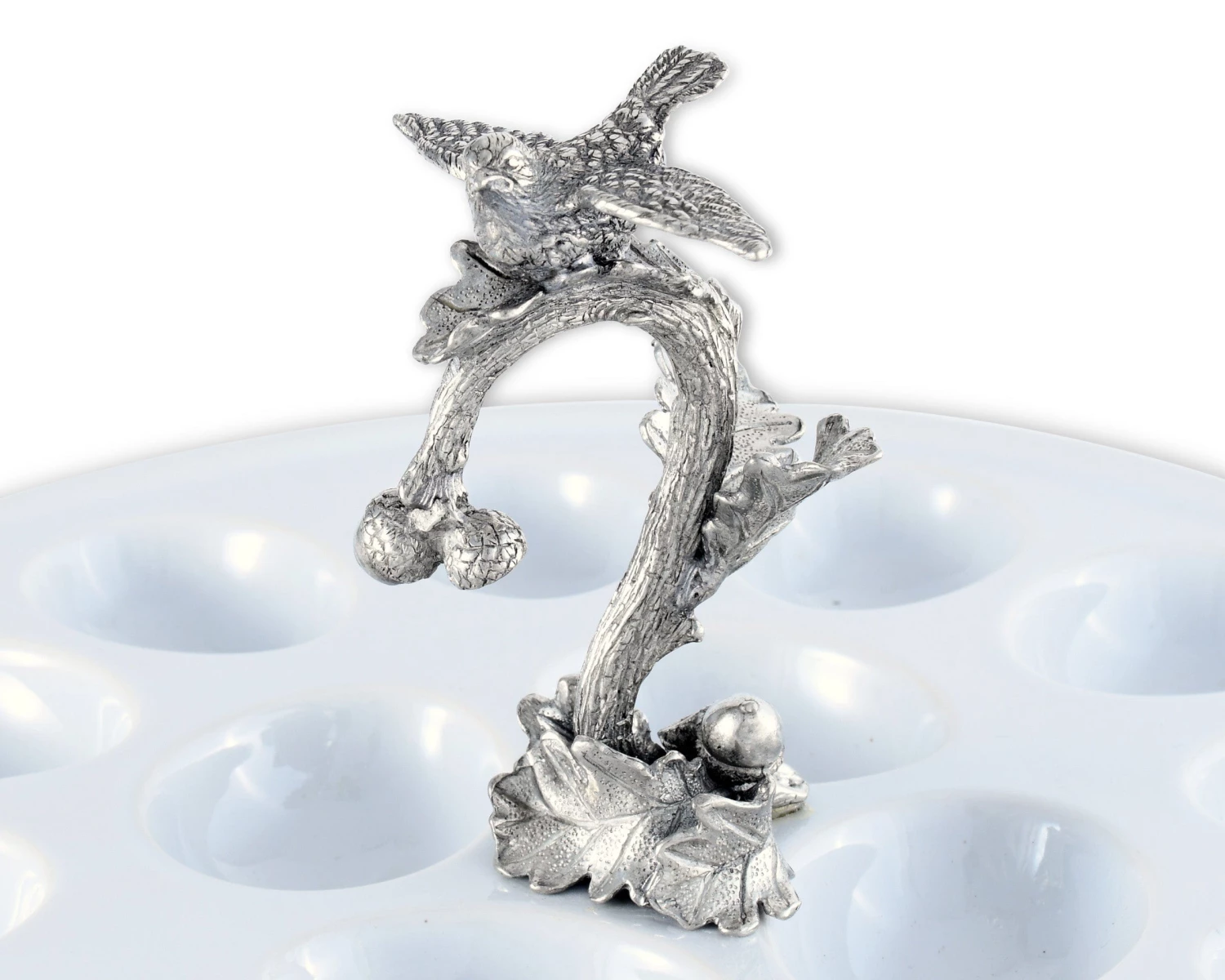 Watch dinner guests smile as they sample a tasty morsel from this Vagabond House egg tray. This small serving platter features a tiny songbird looking after its clutch of appetizers, and the lustrous, white finish provides a dramatic backdrop for eggs filled with a creamy yolk filling. Crafted using a hand-glazed, double-firing process, this stoneware tray’s 16 oval-shaped depressions keep your eggs nestled in place. The server measures 10.5 inches in diameter and 5 inches tall, and it works well among an array of dishes or alone as an intriguing accent piece. The handcrafted pewter tree limb is strewn with leaves for an inviting natural display, and its chirpy resident looks perfectly at home amid your delectable offerings. Let this distinctive serving piece add a sprightly ambiance to your festive gatherings.