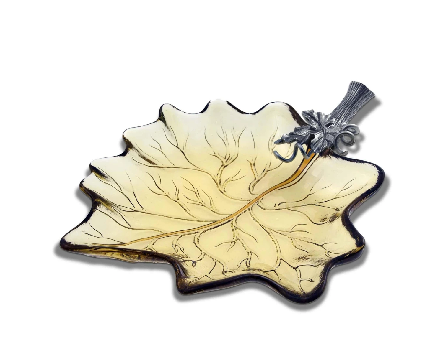 This mouth-blown piece features an intricate system of veins throughout its blades of amber-tinted glass. Adorned with a swirly vine and additional leaf, a pewter branch serves as the handle for this elegant plate.