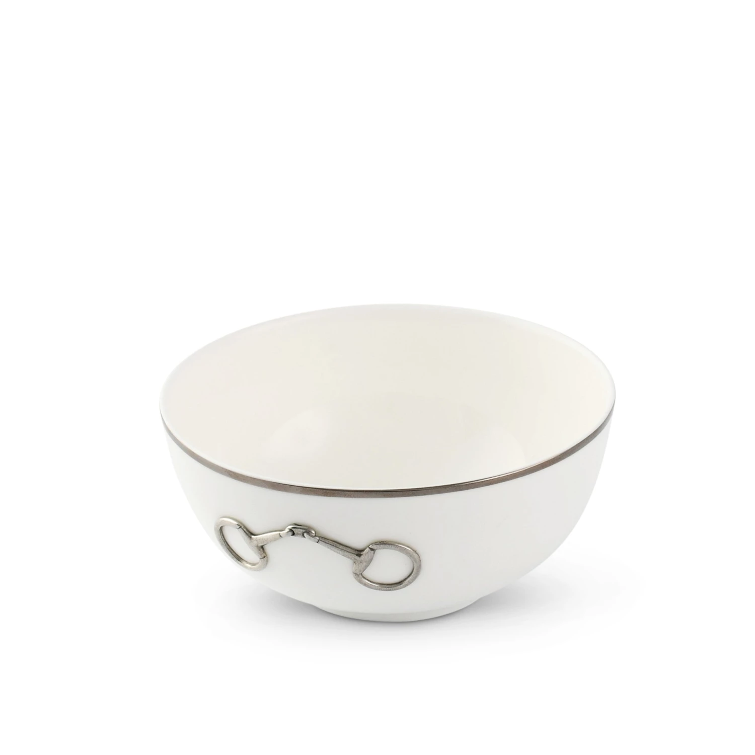 Add an equestrian-inspired touch to your space with this bone china cereal bowl. A shiny, beautifully detailed pewter bit adorns the front and matches its rim. This cereal bowl holds a generous serving of cereal, oatmeal or even ice cream.