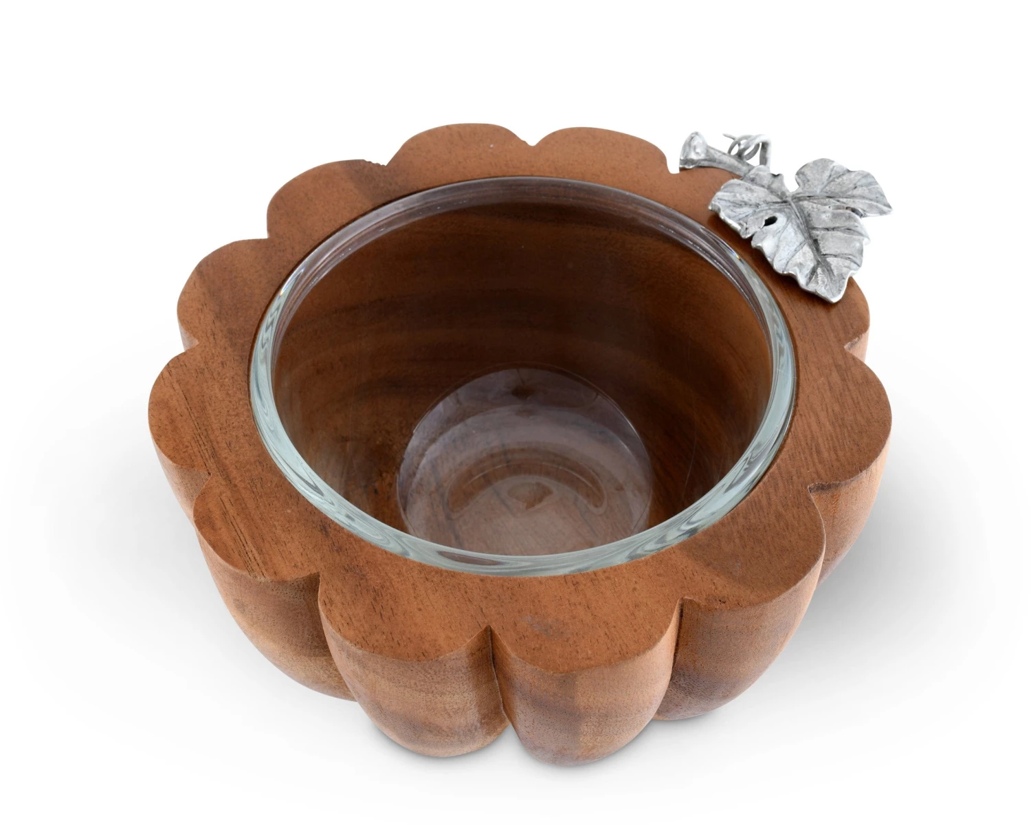 Depict the warmth and bounty of the harvest with Vagabond House’s Autumn Vine Dip Bowl. A beautiful, pure-pewter leaf and vine embellish the dish’s rim on one side, while a removable, glass bowl rests inside the wood. Colorful sauces look fantastic inside the richly colored acacia.