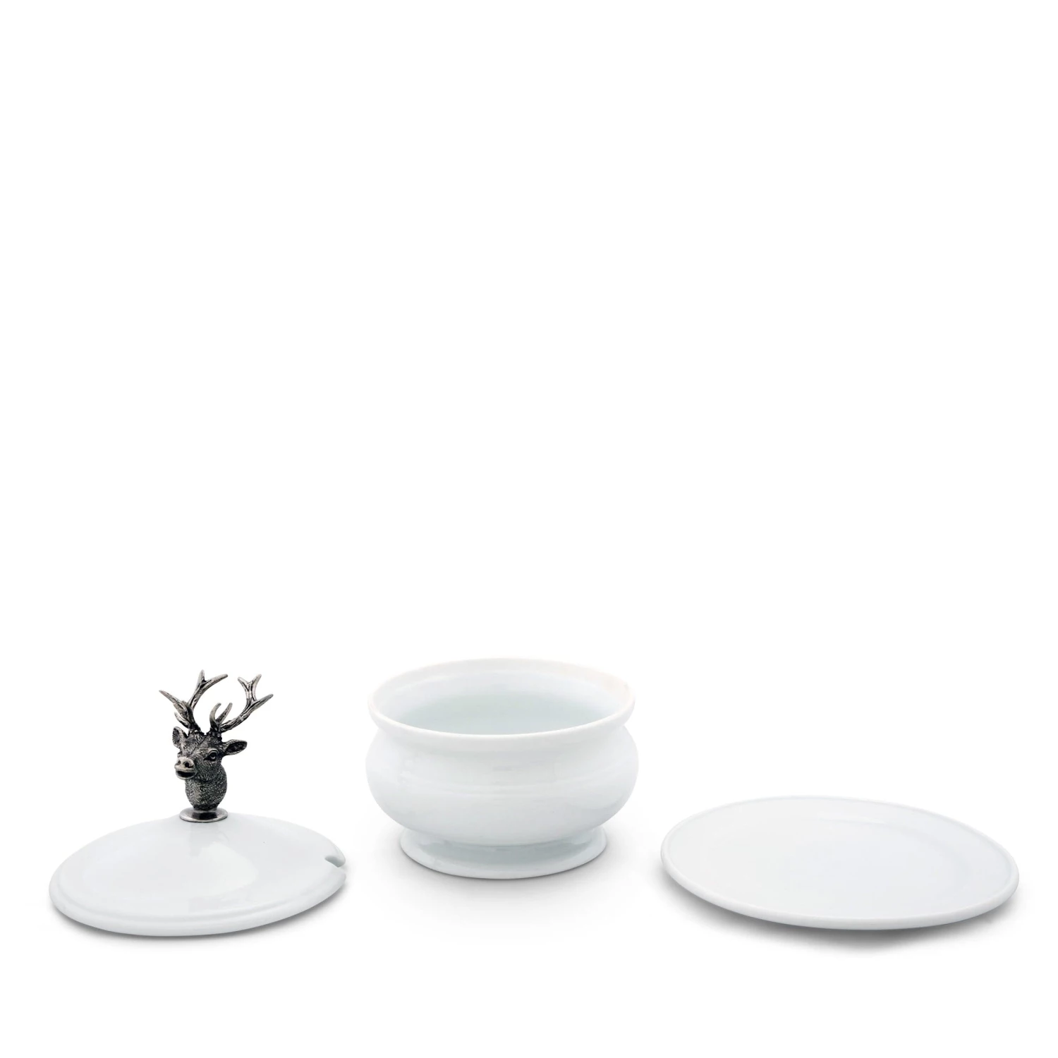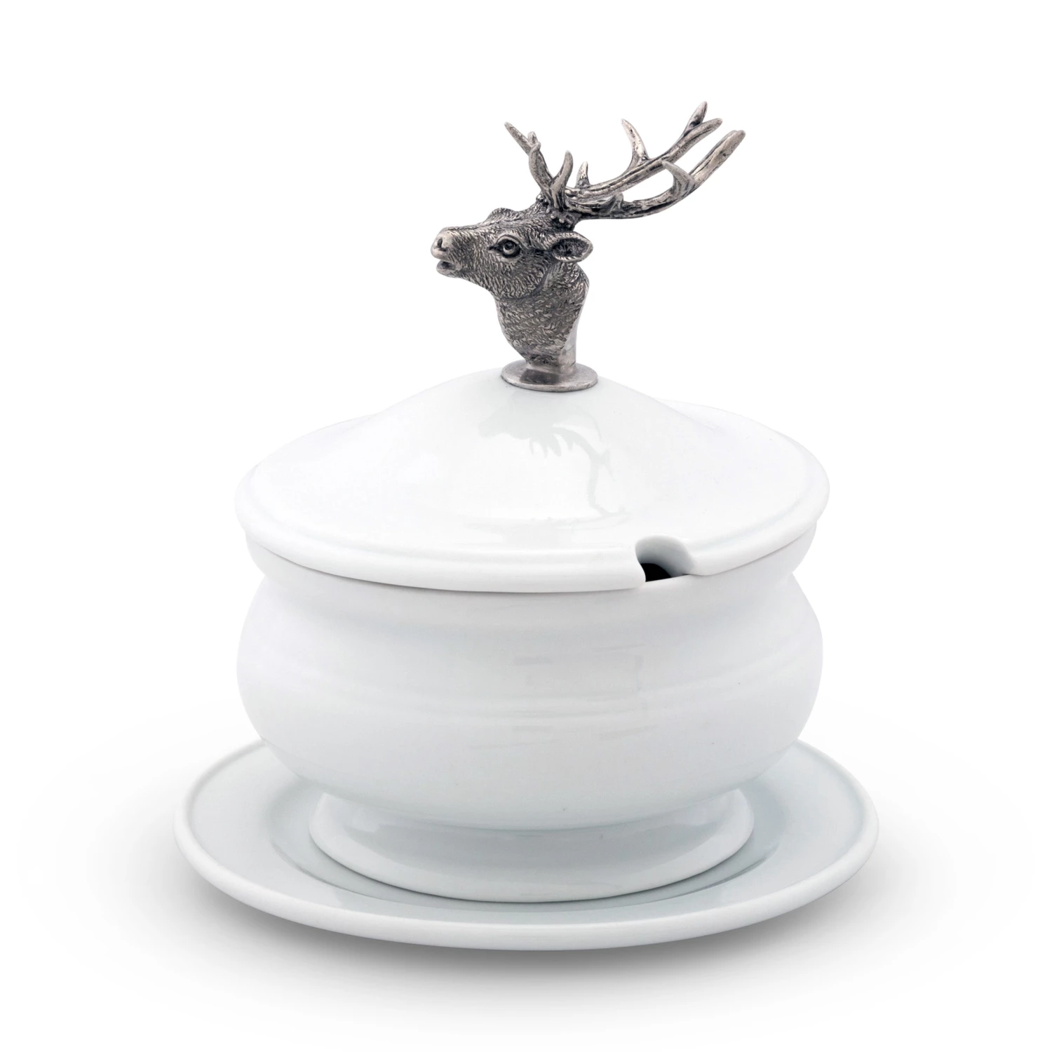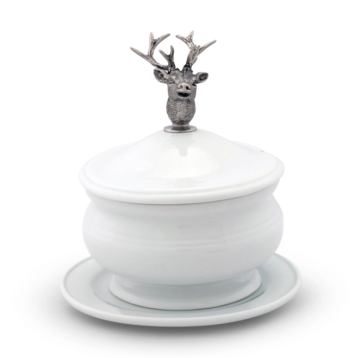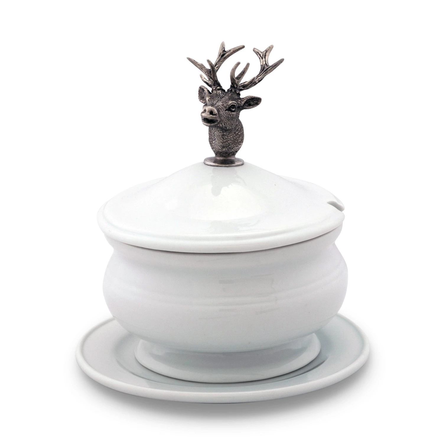 Vagabond House’s porcelain Lidded Elk Table Bowl ensemble has an embellished lid and matching drip plate. A majestic, incredibly detailed Elk Head finial, hand-crafted in pure, luxury pewter completes the set. Best for serving gravy, sauce, clarified butter with elegant panache.