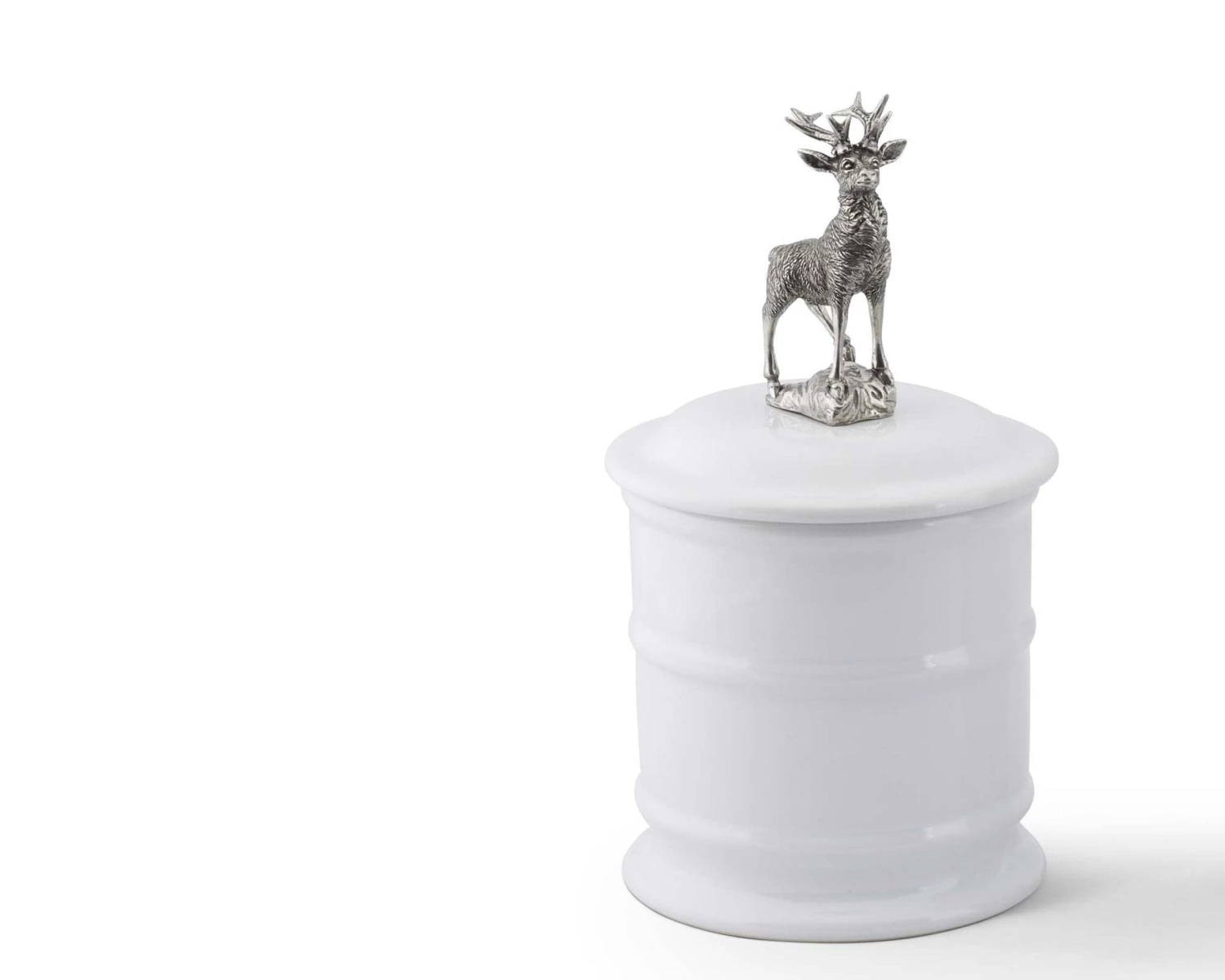 Vagabond House Elk Canisters feature a noble elk handle, in perfect detail topping the canister. The Elk is perched on a craggy rock, his full rack of antlers on proud display. The detail is so fine you can see the forelocks on his hooves. Crafted in fine stoneware, the canisters are double hand-glazed to a luminous, creamy white finish. Available in 2 sizes