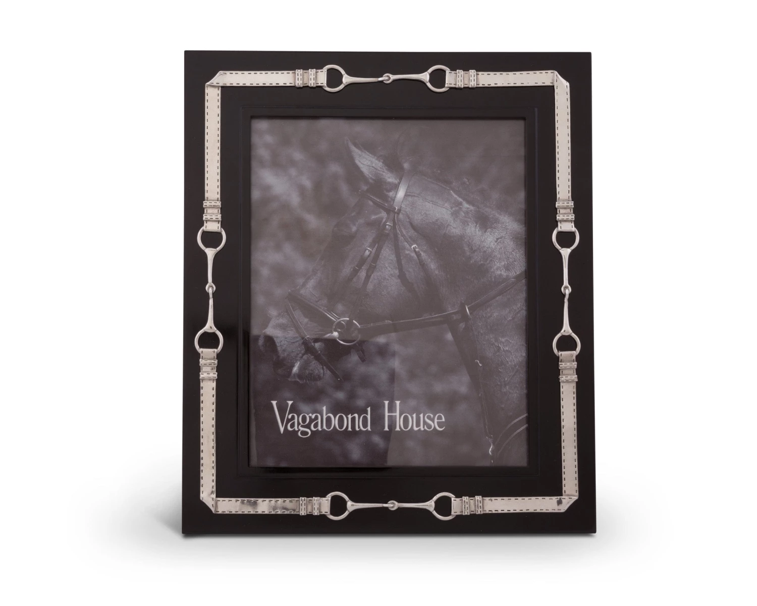 Frame your favorite Equestrian in our luxurious black wood photo frame embellished with pewter egg butt snaffle bits joined by detailed leather bridle straps in a repeating pattern. The versatile backing allows photo to free stand or be hung in a wall gallery.