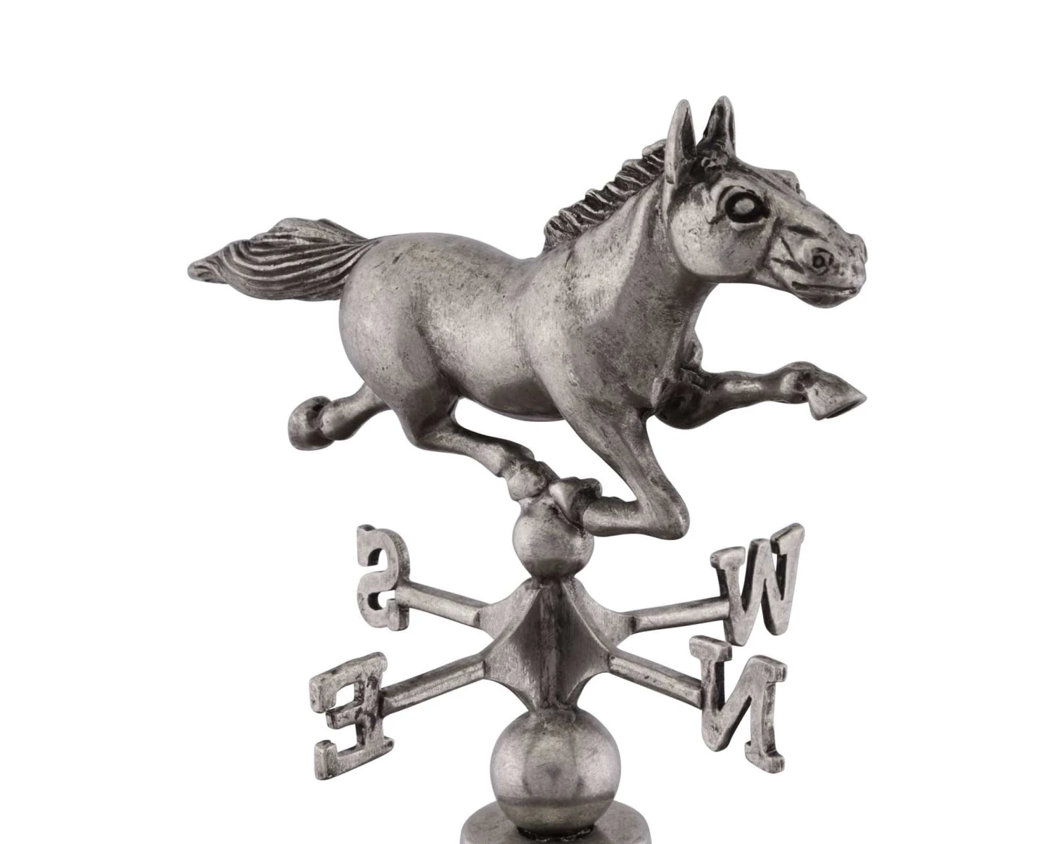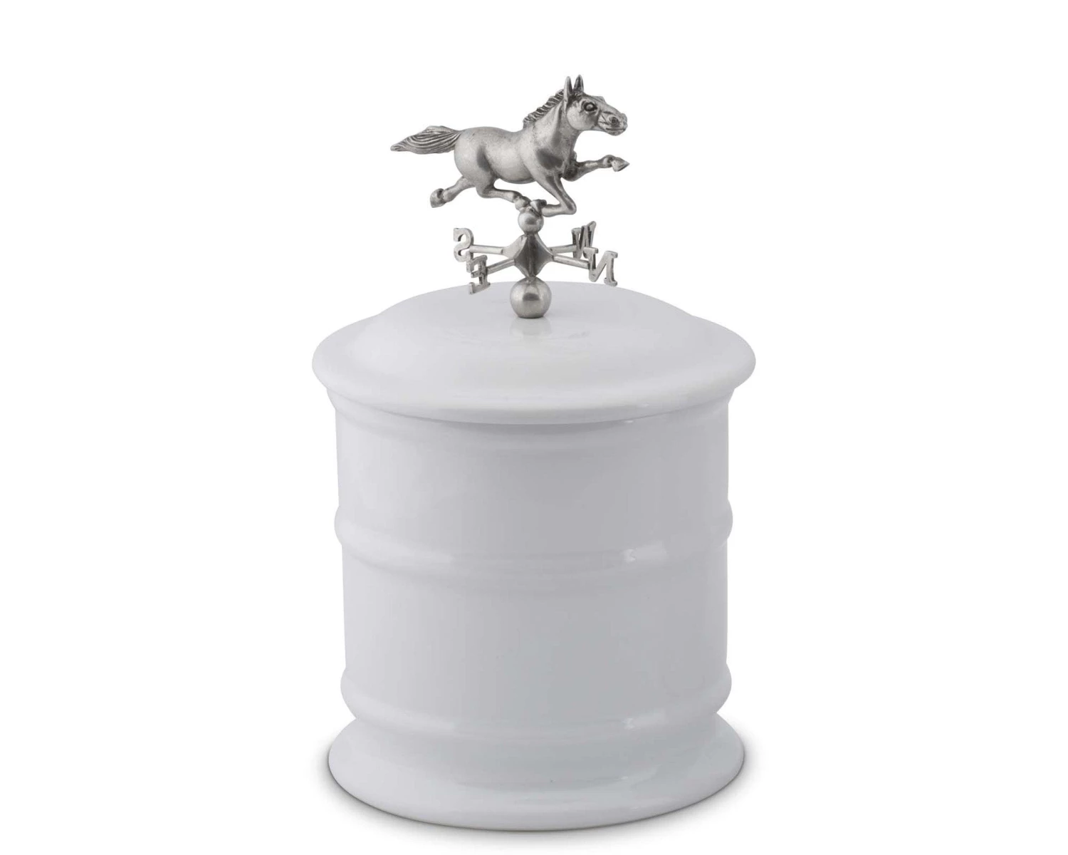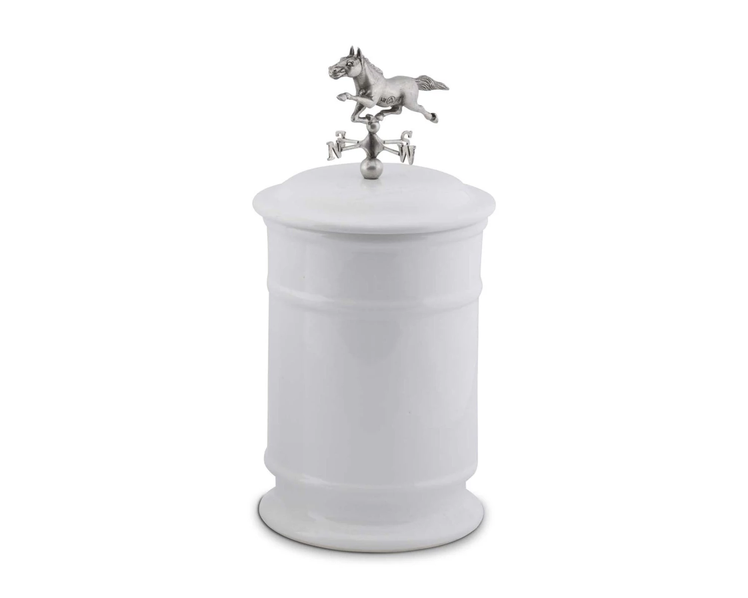 A galloping steed Weathervane finial, crafted from luxury pewter tops Vagabond House’s stoneware canister. This unique canister adds a perfect touch of equestrian country style to your kitchen. The canisters are perfect for sugar, specialty flours or sweet treats. Crafted in fine stoneware, the canisters are double hand-glazed to a luminous, creamy white finish.
