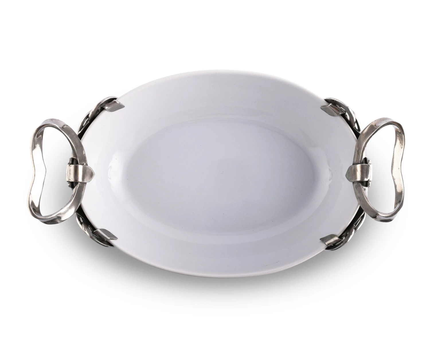 Complement your Equestrian Collection with this attractive Small Horseshoe and Bit Tray. Crafted in luxury-grade pewter, snaffle bits, horseshoes and cinches combine to create innovative handles on this oval piece. These gorgeous designs offer the perfect accent to our elegant stoneware.