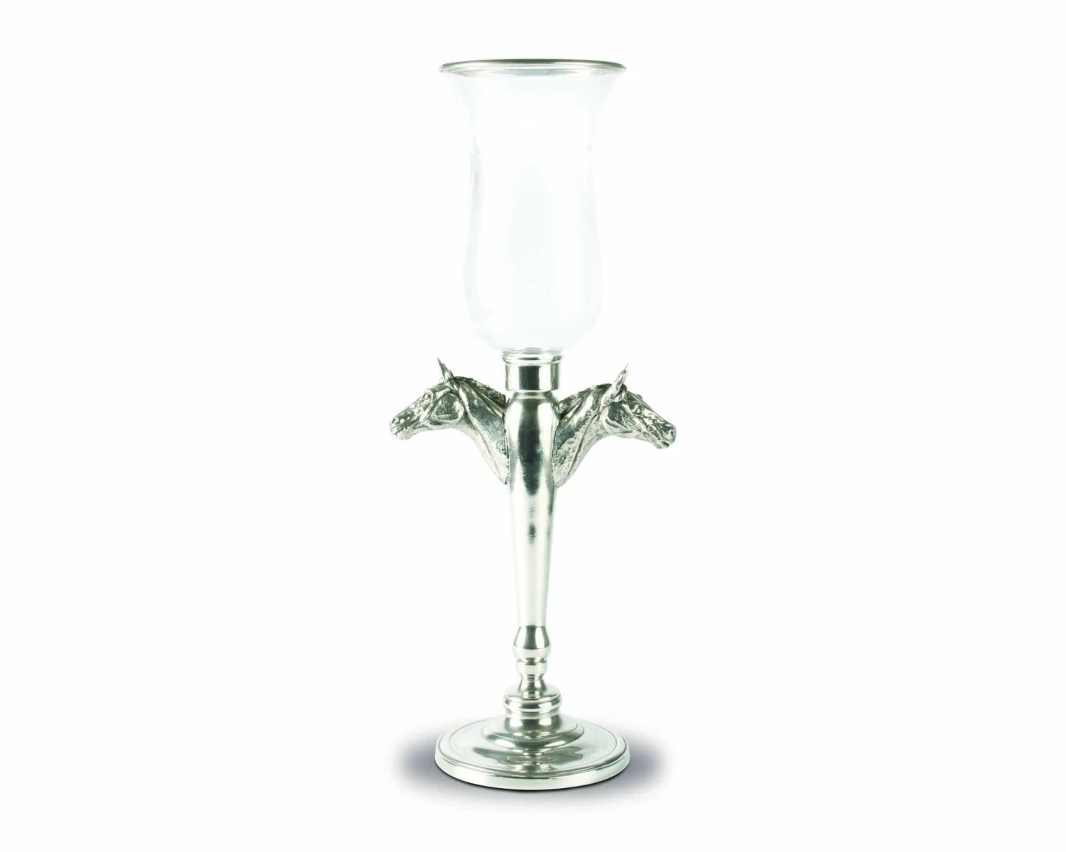 Esteemed horse heads emerge from the shaft of Equestrian Hurricane Taper just below the glass. These pure-pewter thoroughbreds show incredible definition in their muscular physique and realistic facial features. A pewter rim embellishes the glass to give this 21-inch piece an elegant finish.