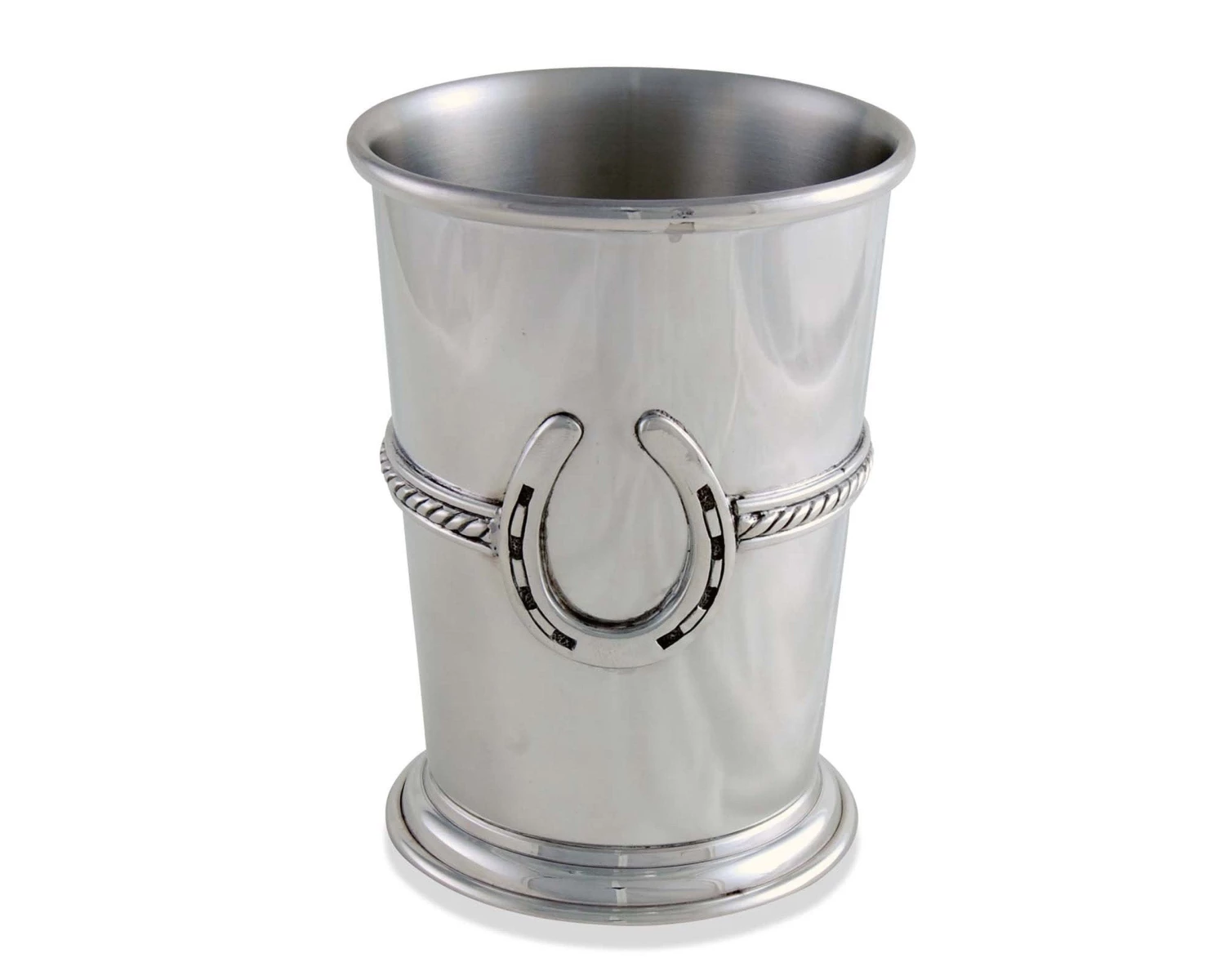 A ropy band wraps around the middle of this piece before settling against both sides of a realistic horseshoe. The cup’s sturdy, pure-pewter design keeps your drink properly chilled within its distinguished form.