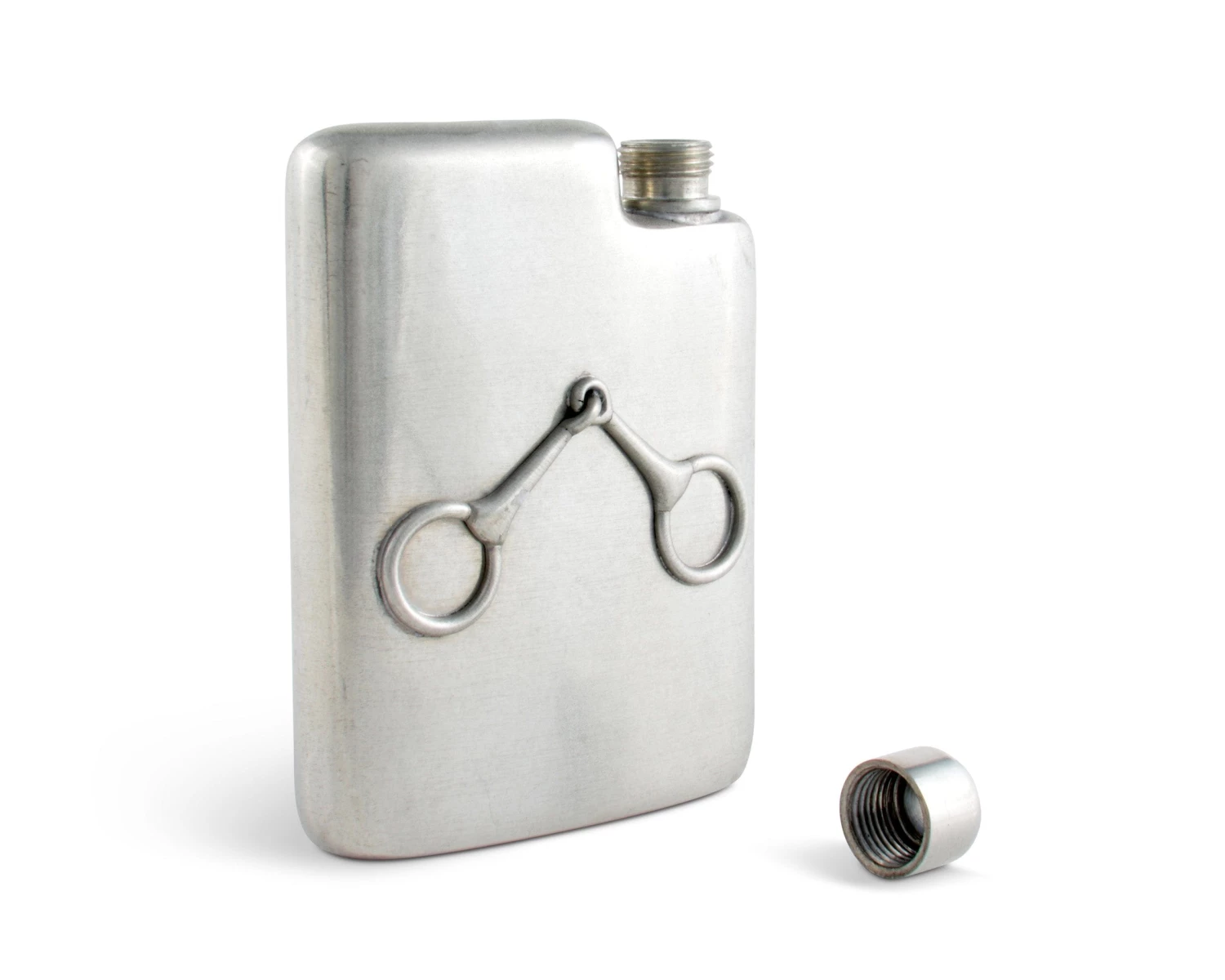 Long days on the trail are set right when you have a wee nip of your favorite drink in your pocket. Ride and drink in style with our O ring snaffle bit embellished, pewter hip flask. The smooth curved design is attractive and pocket-friendly, and the beauty of the pewter is evident at first glance. Perfect as a gift to your favorite equestrian, its excellent build quality and great design are deeply appreciated by the horsey set. Our quality flasks will last a lifetime and you may even pass one down to your kids. Â