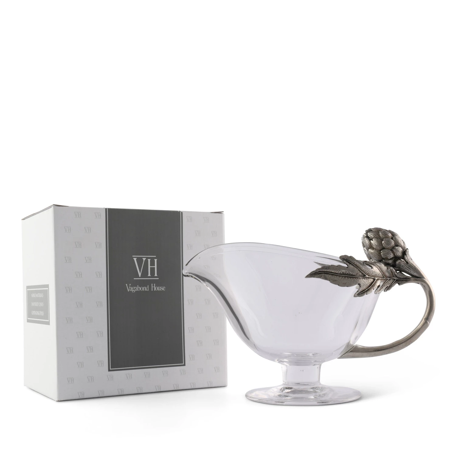 Impress guests at holiday feasts with this artichoke gravy boat from Vagabond House. This serving piece has a classic pedestal and is crafted from handblown glass featuring an elegant spout, so you can easily pour gravy over meat or sauce onto pasta dishes. The handle is designed of handcrafted pewter that rises to the upper lip of the gravy boat in the shape of a tiny artichoke with two leaves extended on either side, providing a graceful touch to this functional server.