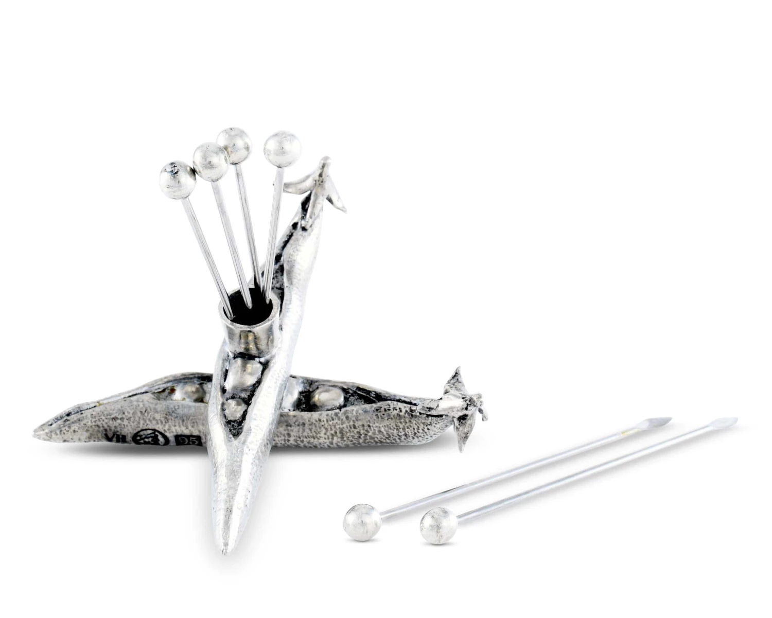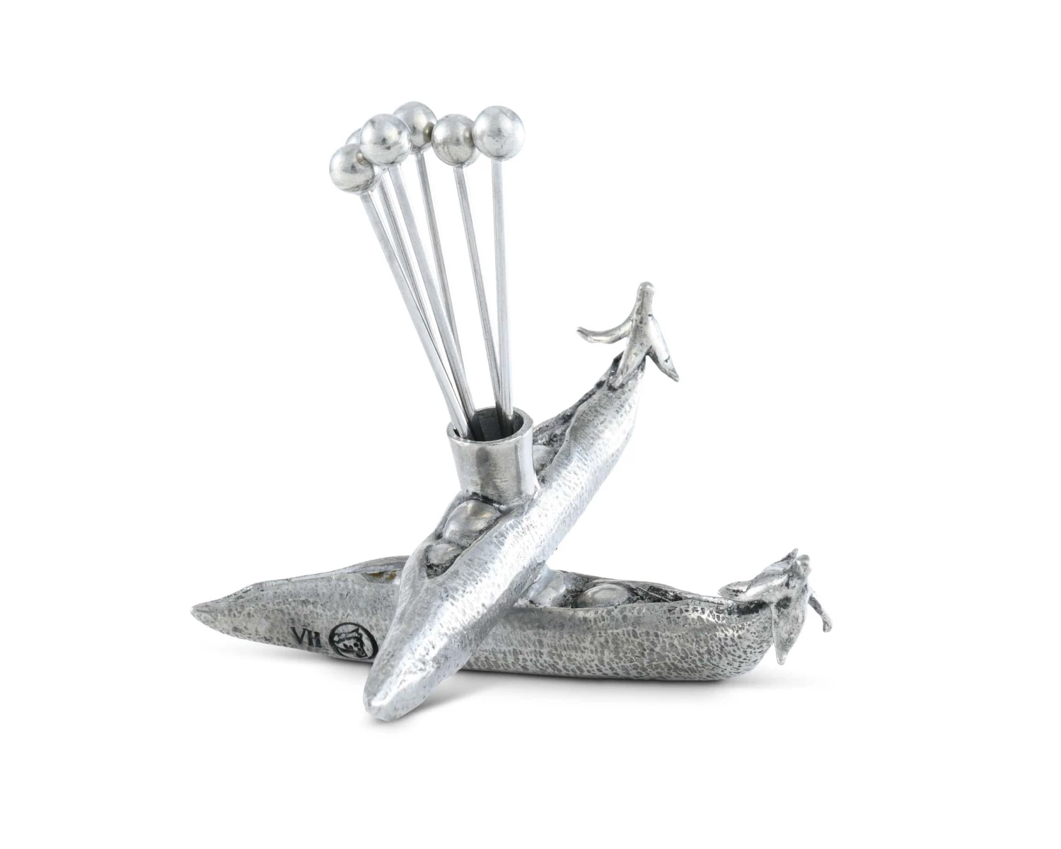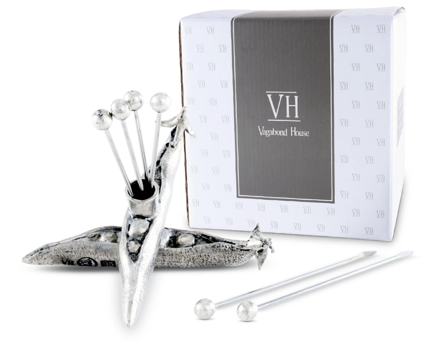 Why Vagabond House’s Pea Pod Cheese Pick Set is just as cute as picks in a pod! Two very detailed pewter pea pods, artistically joined form the base and holder for 6 cheese picks, each topped with a little pea. This set adds fresh fun to any cheese or crudité service and makes an excellent gift for gardeners.