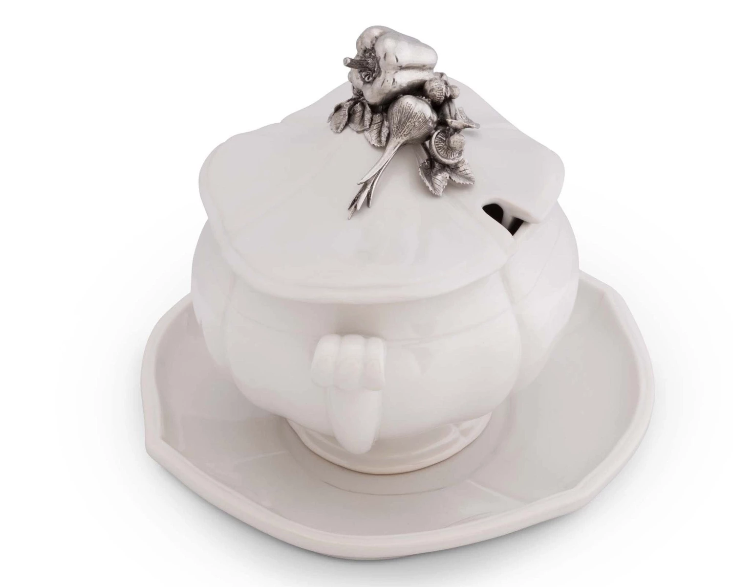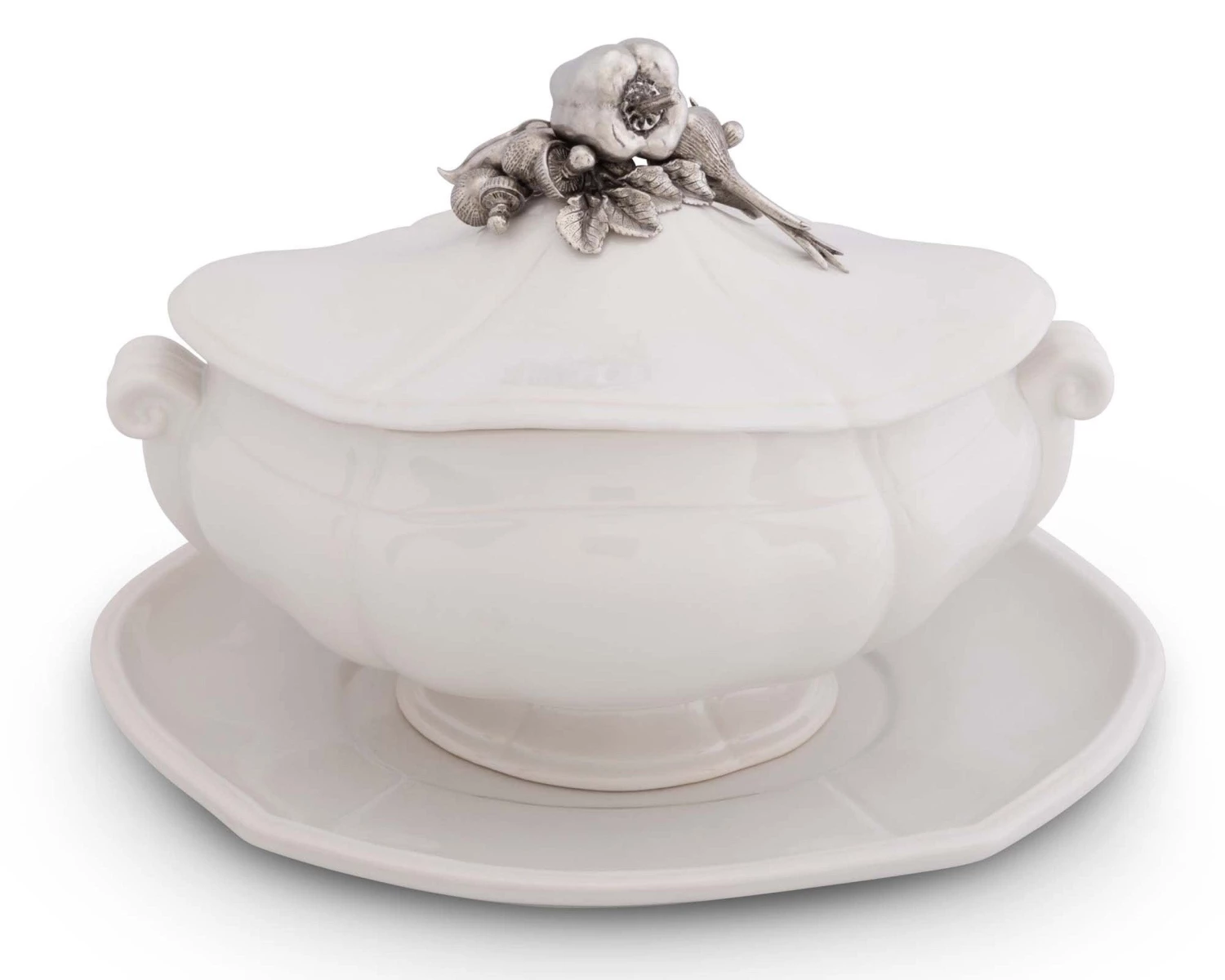 A veritable mélange of miniature pewter veggies is artfully arranged as the finial handle on the lid of Vagabond House’s Veggie Fresh Tureen. The classic footed tureen is crafted from fine stoneware, double hand-glazed to a luminous, snowy white finish.