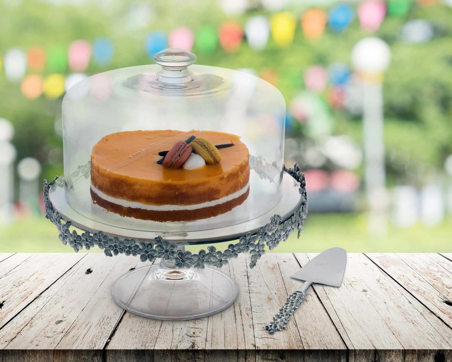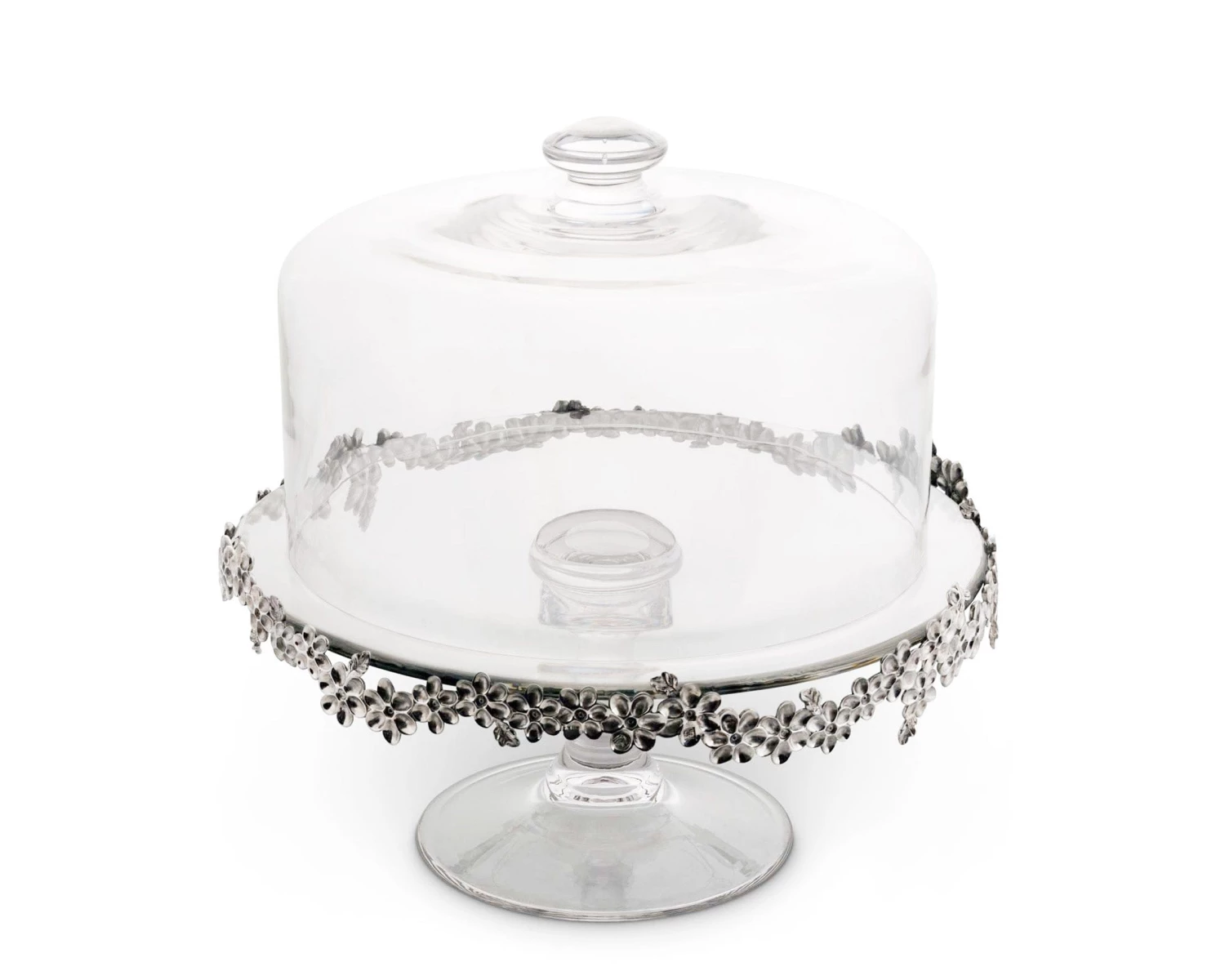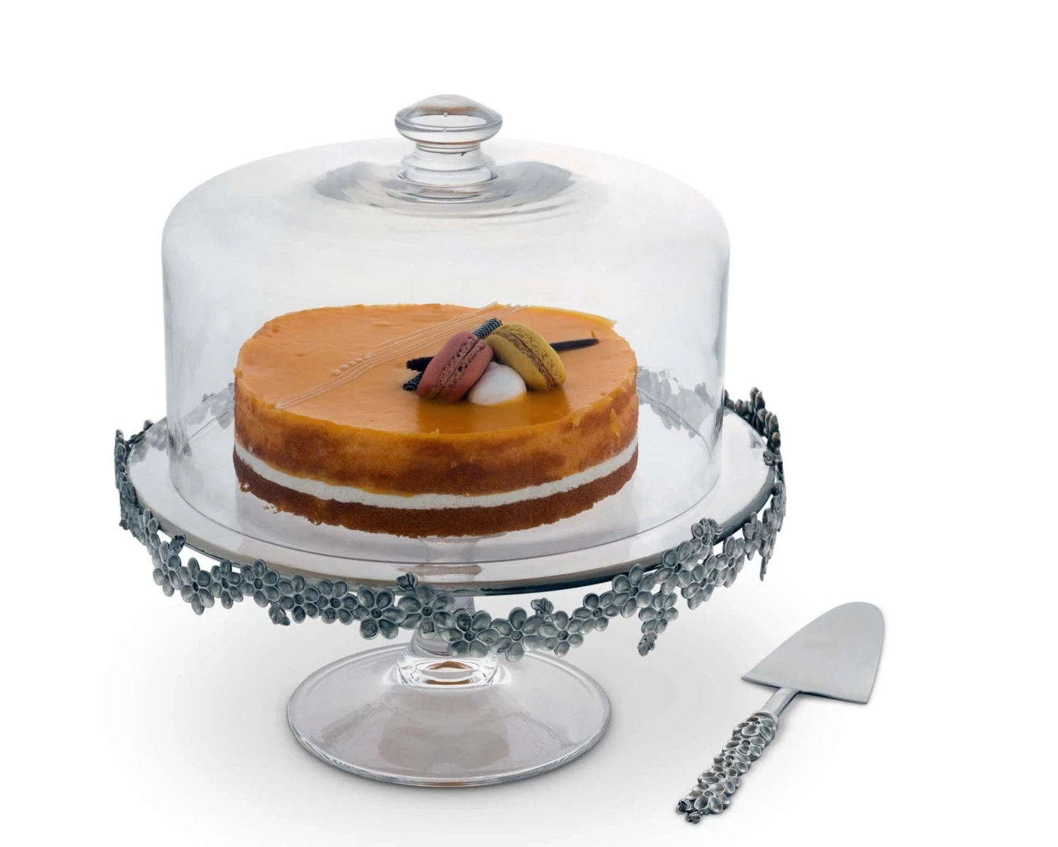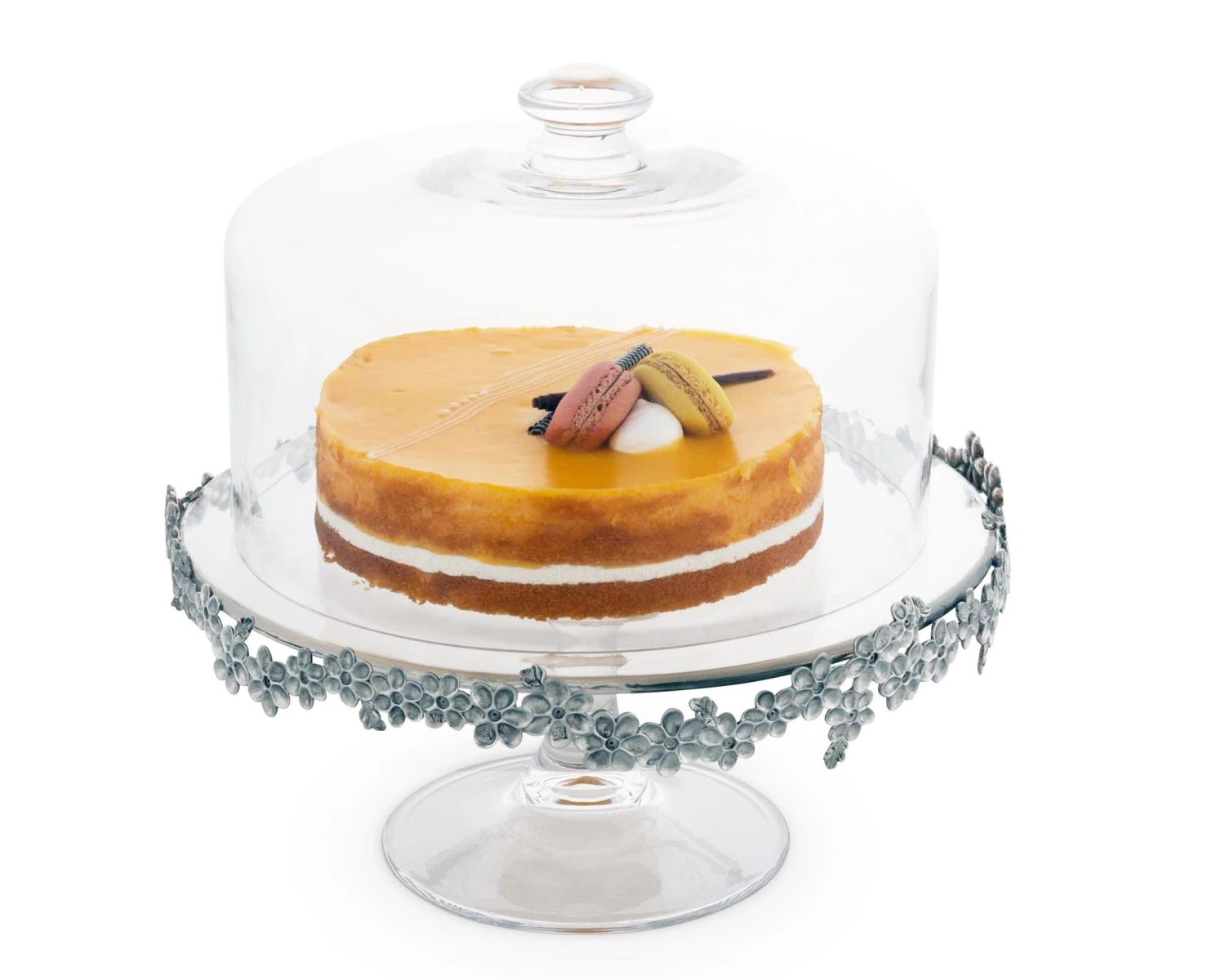A merry garland of pure pewter lilacs rings the footed plate of Vagabond House’s crystal clear Lilac Covered Cake Plate. This lovely, heavy domed server is beautiful on your counter every day, keeping pastries or breads fresh and ready to serve for a day or two after baking.