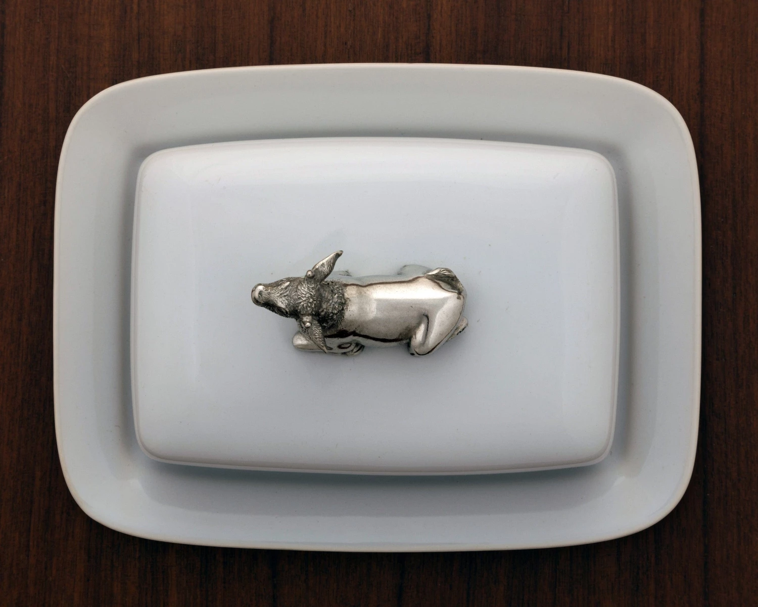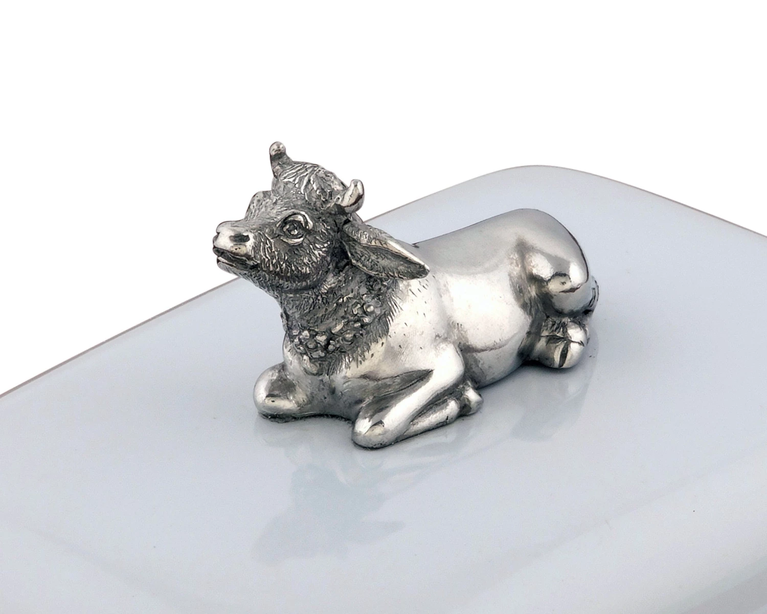Show off your love for the country life while keeping your butter at room temperature with this Vagabond House butter dish topped with Mabel the Cow sitting comfortably on top. The double-glazed stoneware dish and cover have a smooth, warm white finish that matches any kitchen or dining room decor. Mabel the Cow is made of luxury pewter and sits content on top of the cover with a ring of flowers around her neck. The stoneware butter dish holds one 8-ounce or two 4-ounce butter sticks, and the lid rests comfortably over the butter to keep dirt, heat, and cold out. Set butter on the counter or table instead of the refrigerator so it spreads easy and remains the best temperature for baking.