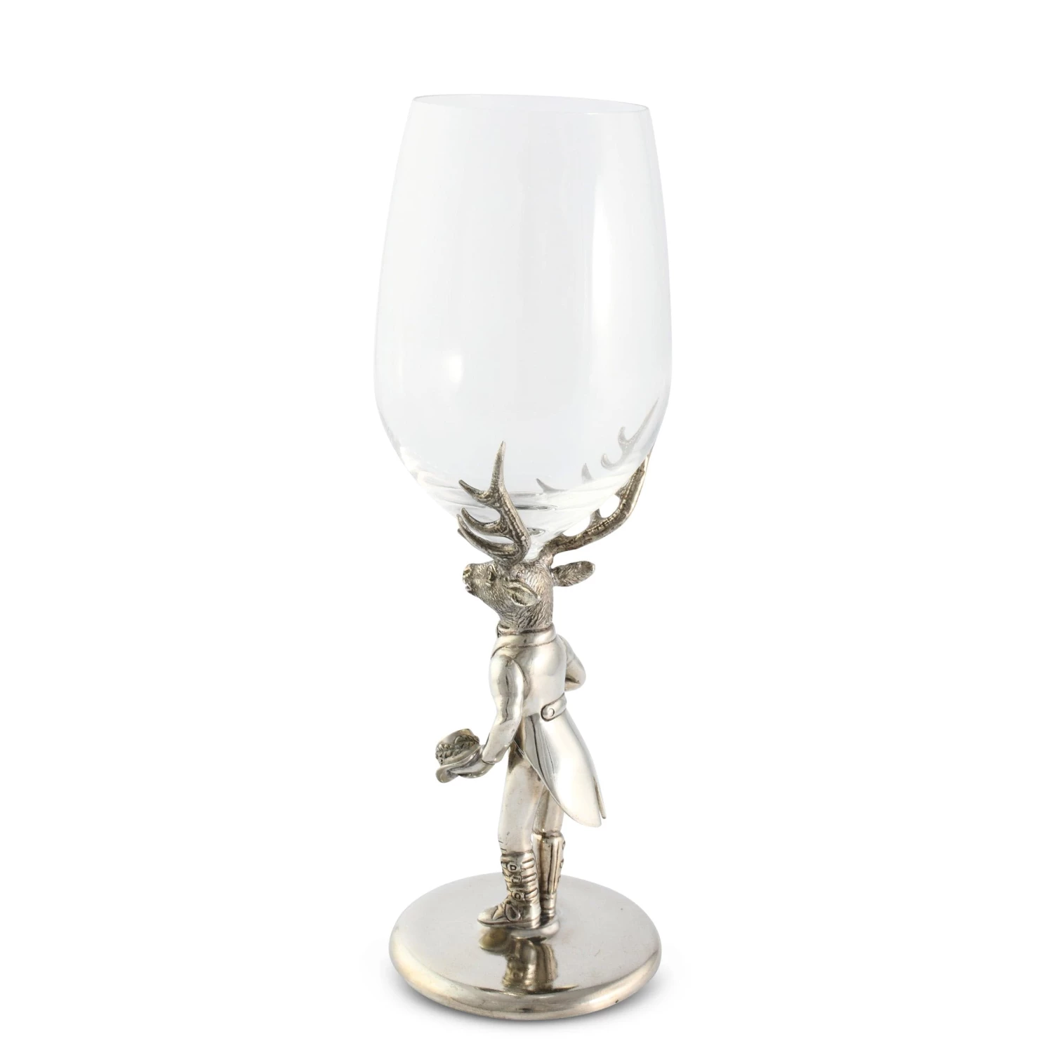 Celebrate holidays, special occasions or the end of the day with this whimsically elegant pewter wine glass. Our gentleman elk is finely dressed in equestrian attire and looking rather pleased to buck a luxurious, handblown crystal glass atop his antlers.