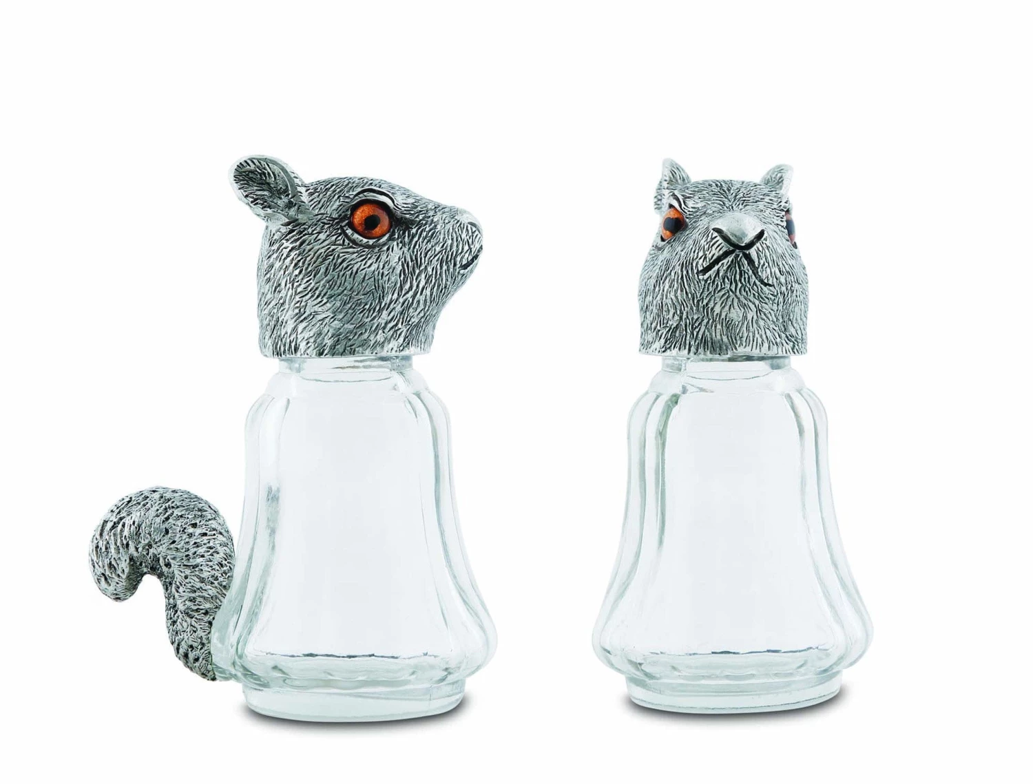 We took dash of retro, a pinch of kitsch, added a handful of whimsy and a splash of fun and “cooked” up our very cute Glass Squirrel Salt & Pepper Set. Great for gifting, the set has exquisitely detailed pewter heads with lovely bronze eyes. We added a bushy pewter tail to each shaker, just for fun.