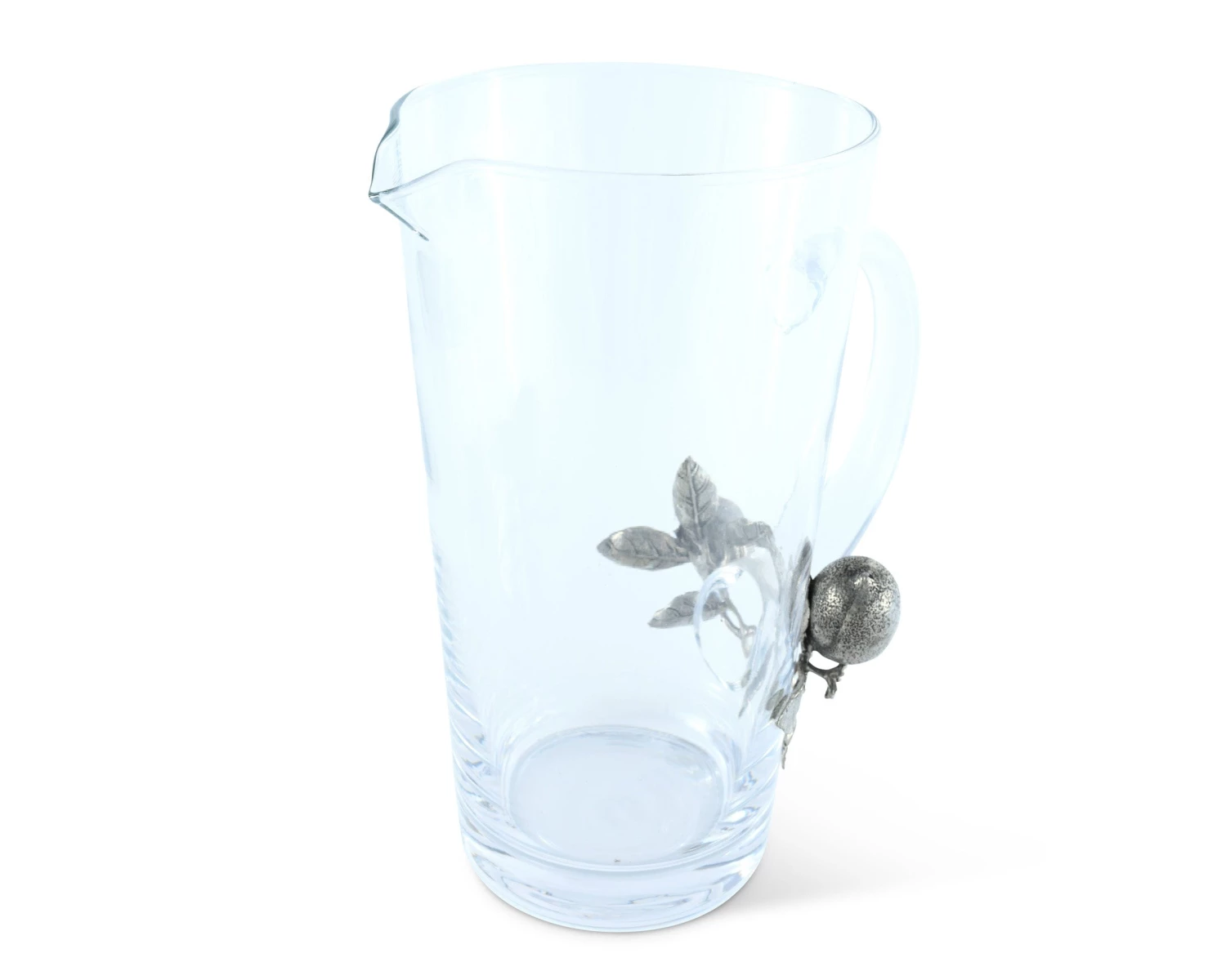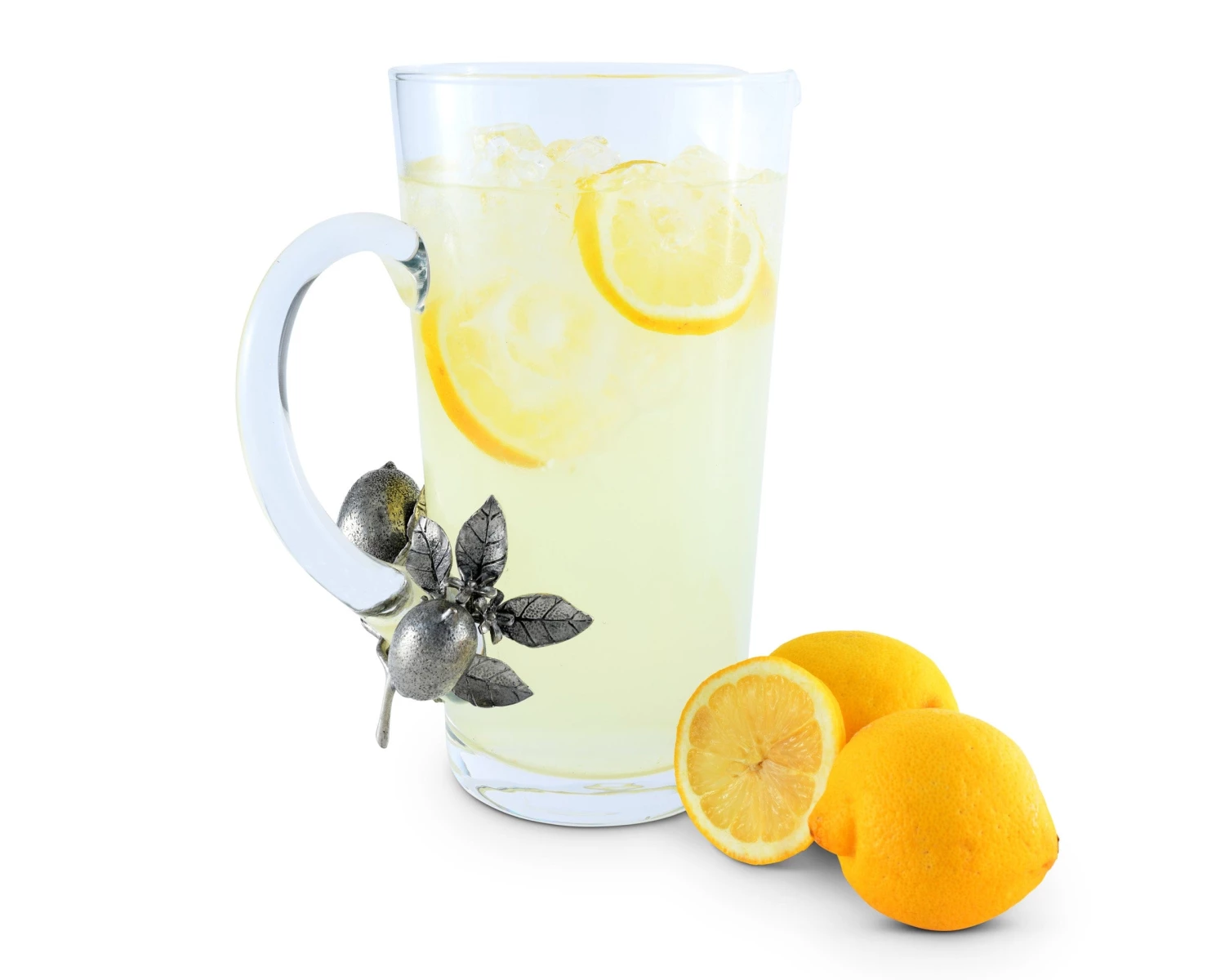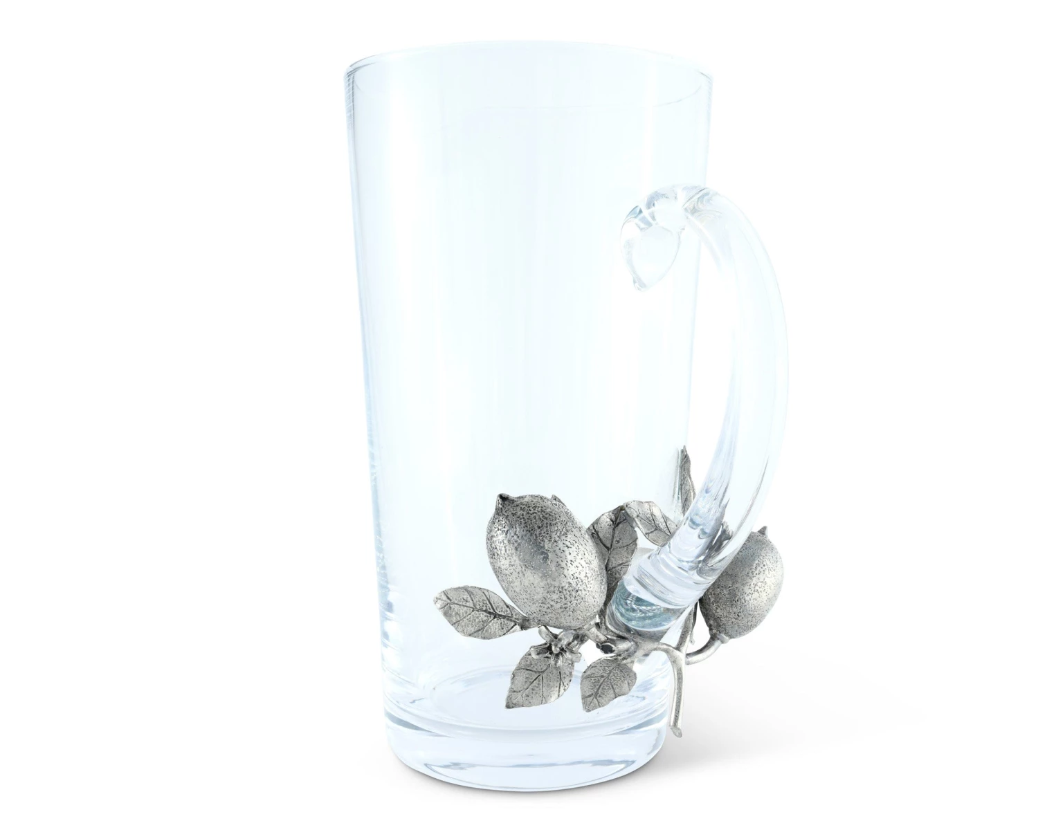 A sculptural bouquet of pewter lemons, leaves and flowers encircles the handle of our straight sided, heavy Italian glass table pitcher. Hand-crafted with extraordinary detail, the lemon bouquet adds an aura of luxury and a soupçon of citrus cheer to your table.