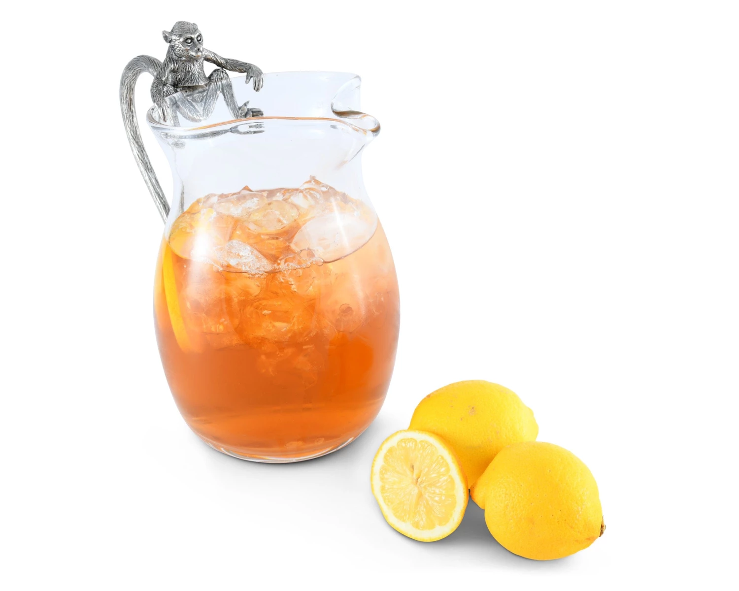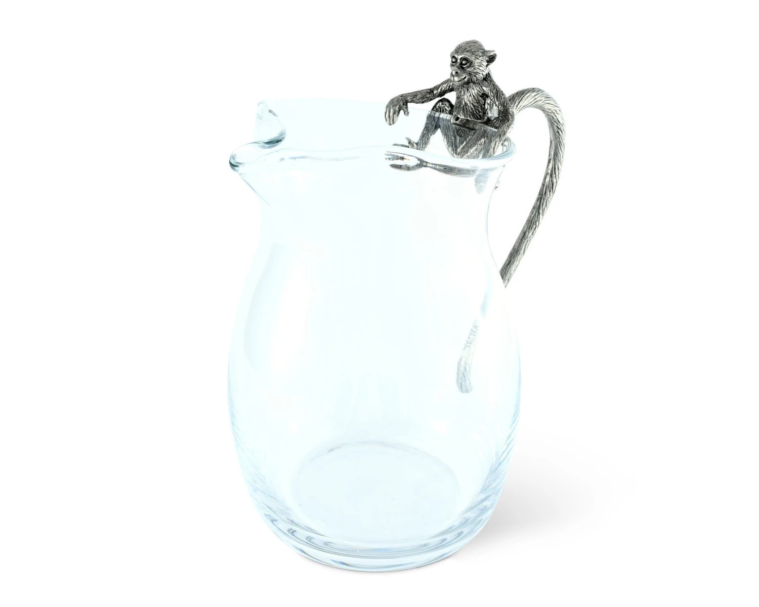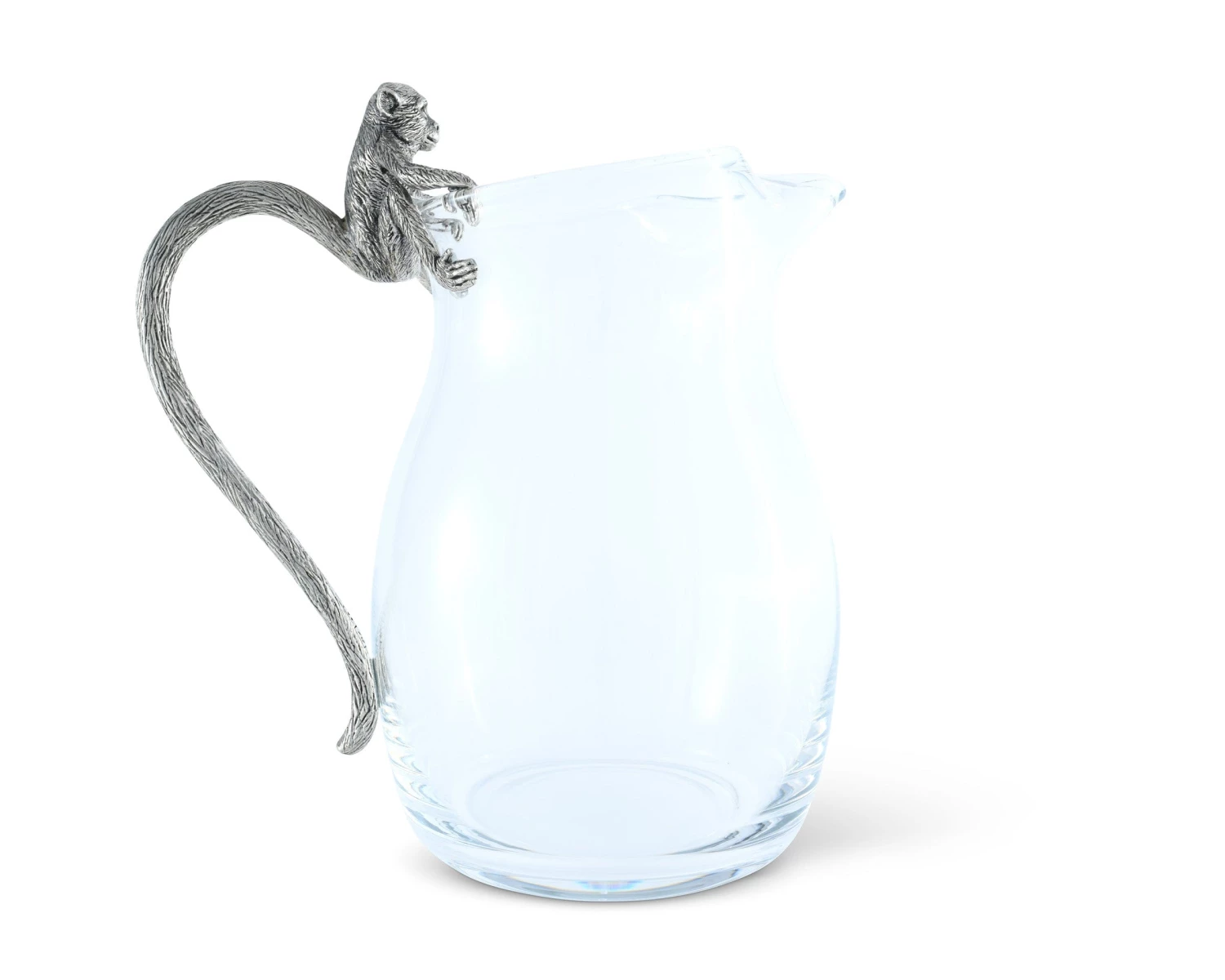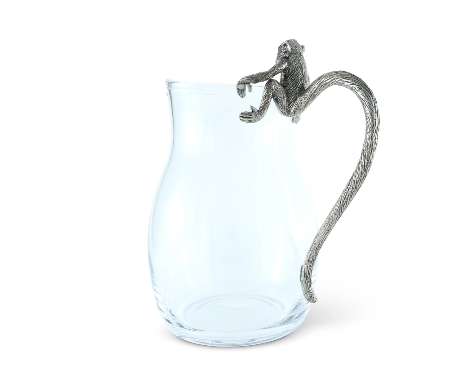 Unique, distinctive and detailed, an agile pewter monkey, inspired by an African Vervet peers curiously over the edge of Vagabond House’s African Monkey Pitcher. Our clever designers have interpreted his dexterous tail to act as the handle of our classic shaped glass pitcher.
