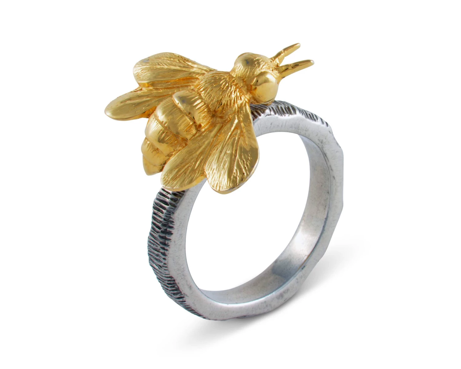 Create a welcoming atmosphere with this charming pewter napkin ring that features a gold bee crafted with intricate details fixed to a metal ring carved with rustic finishes around the circle—exclusively designed by Vagabond House.
