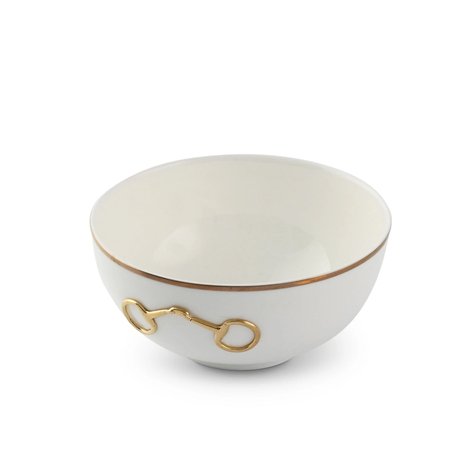 Impart high-end style to the breakfast table with this gold bit cereal bowl made from fine bone china and adorned with a gold-tone pewter bit and a matching rim. The 6.5-inch diameter makes this bowl a versatile option for cereal, side dishes and snacks.