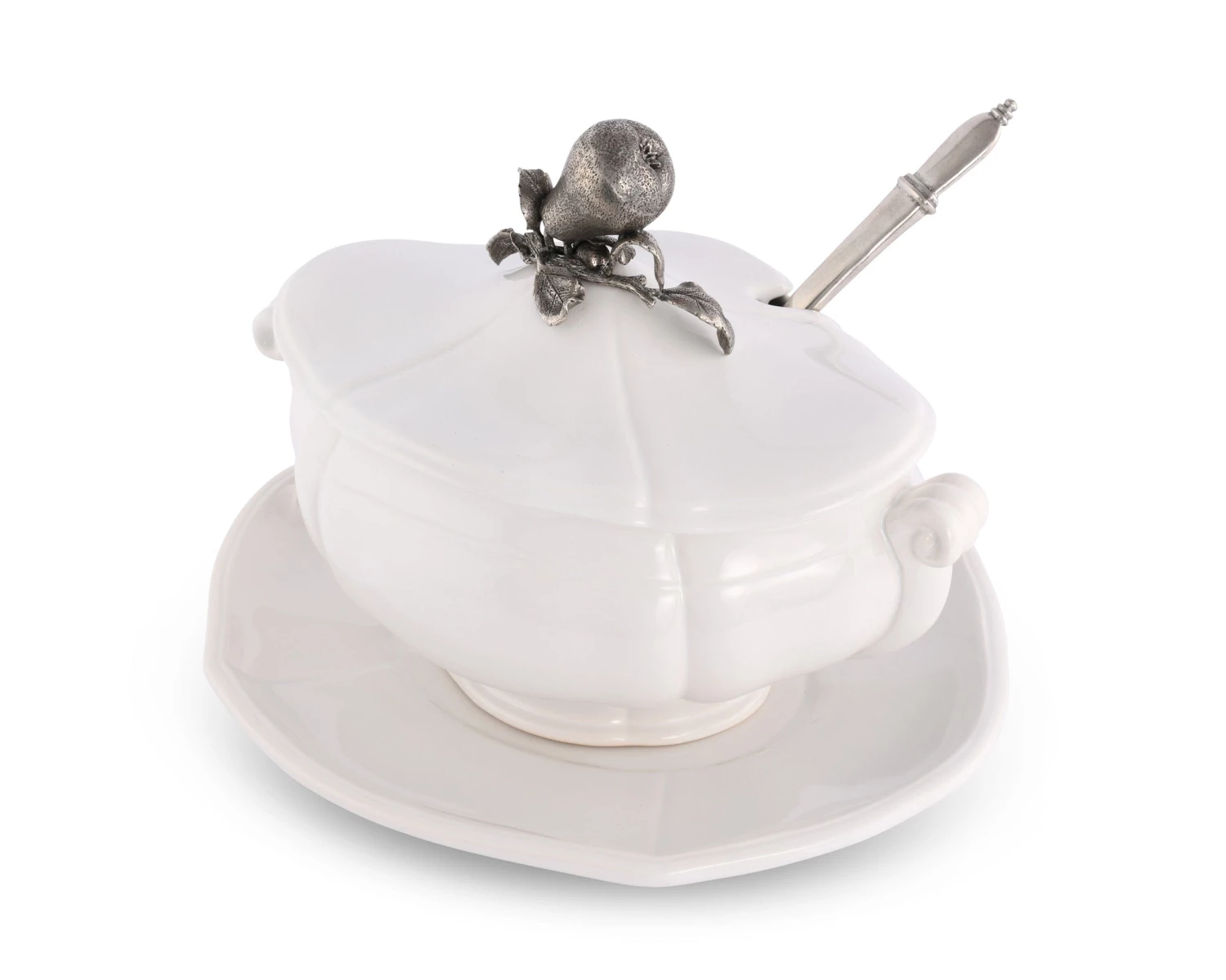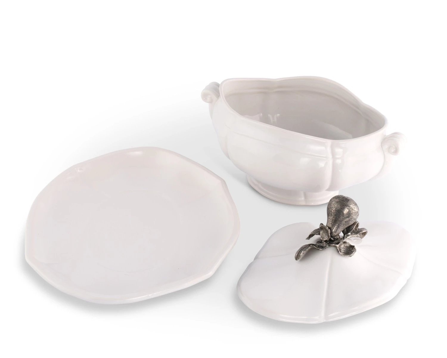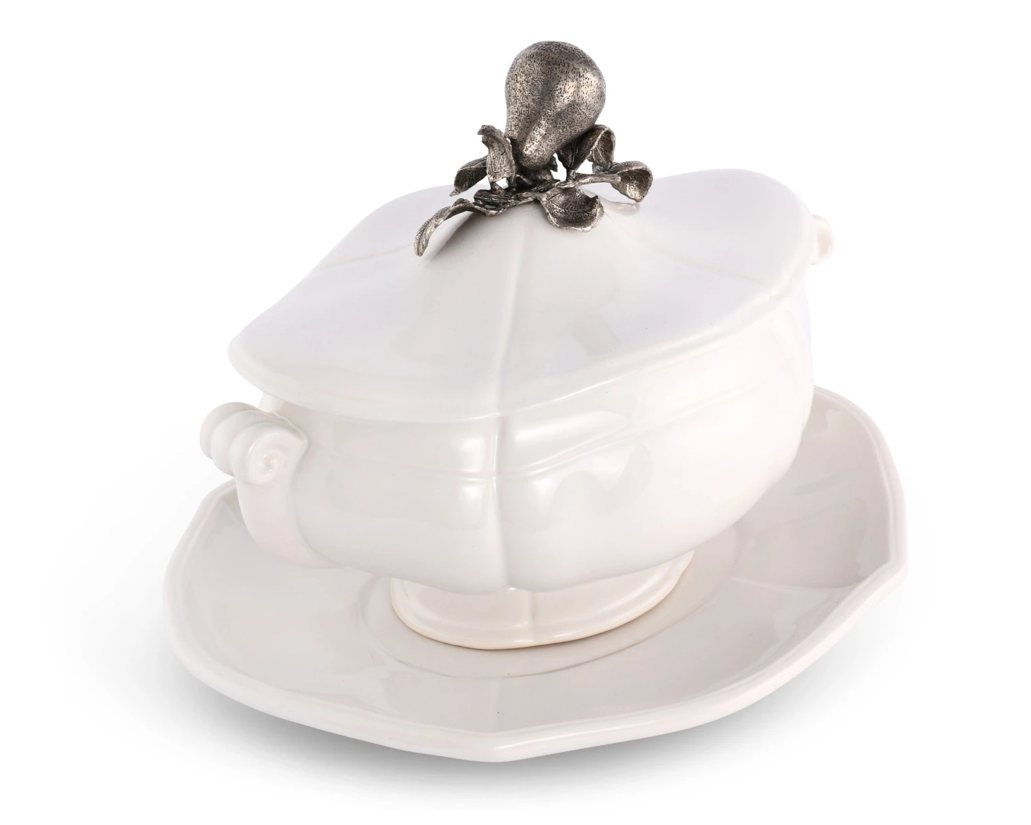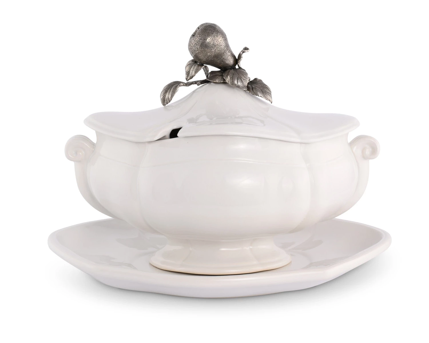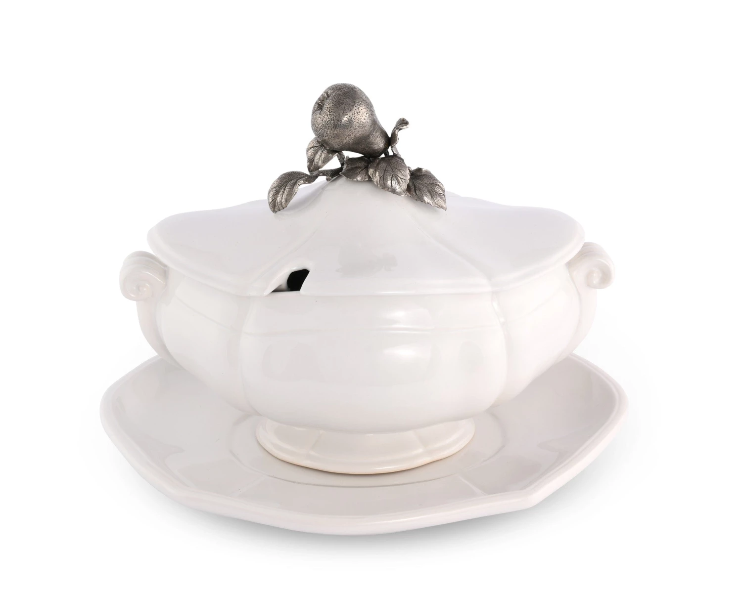 Memories of orchard visits are conjured by the figural pear extending off a leafy branch forming the finial handle of this unique tureen. Crafted in fine, Vagabond House pewter, the realistic fruit and foliage display exquisite craftsmanship. The detailed metal artwork is beautifully framed by the white, hand-glazed finish of our stoneware. The 3 piece tureen set includes the stoneware dish and tray along with the metal decorated lid.