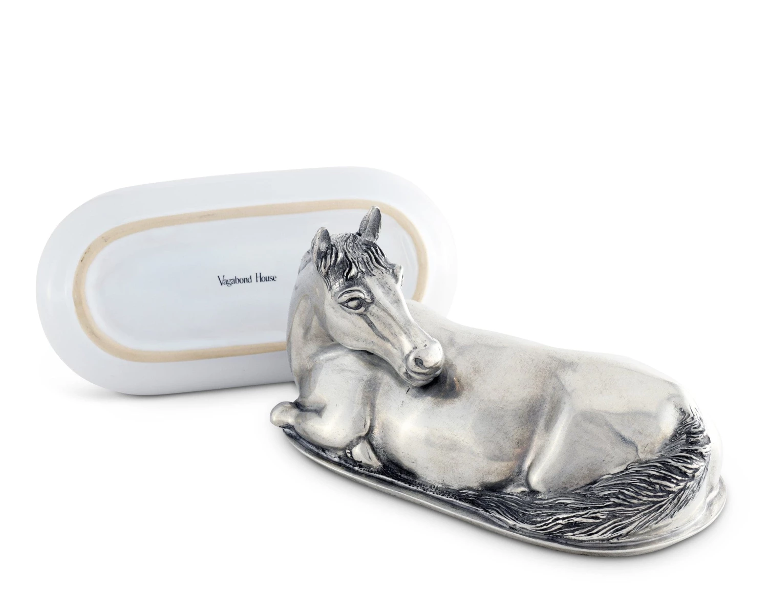 Inject equestrian style into your table setting with this magnificent Horse Butter Dish from Vagabond House. A gorgeous, pure-pewter thoroughbred curls up to rest on top of a stoneware butter plate. Displaying a well defined physique, this beauty seems to look at something off in the distance.