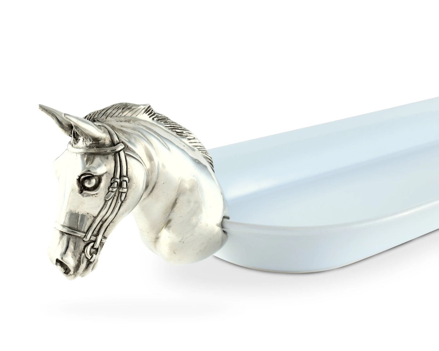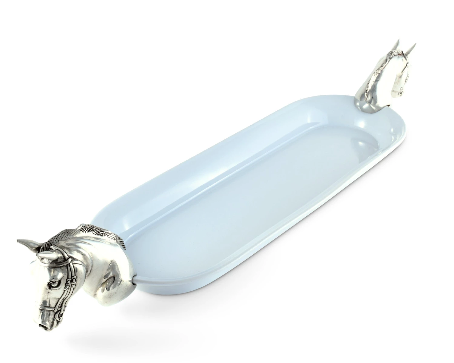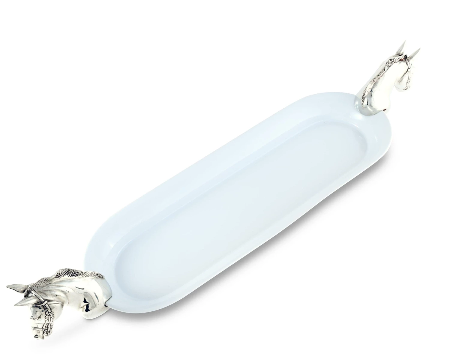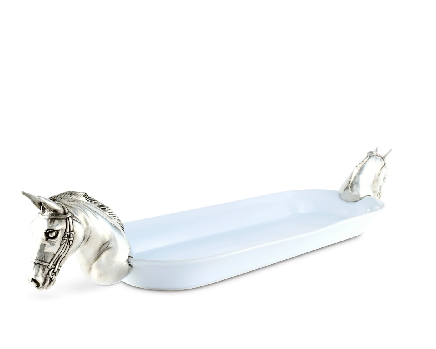 Level up your food presentation with our lovely oval serving tray with a horse accent. The long tray is handcrafted with intricate details in pewter and white stoneware glazed for a perfect rustic finish. It’s an exclusive horse design by Vagabond House.