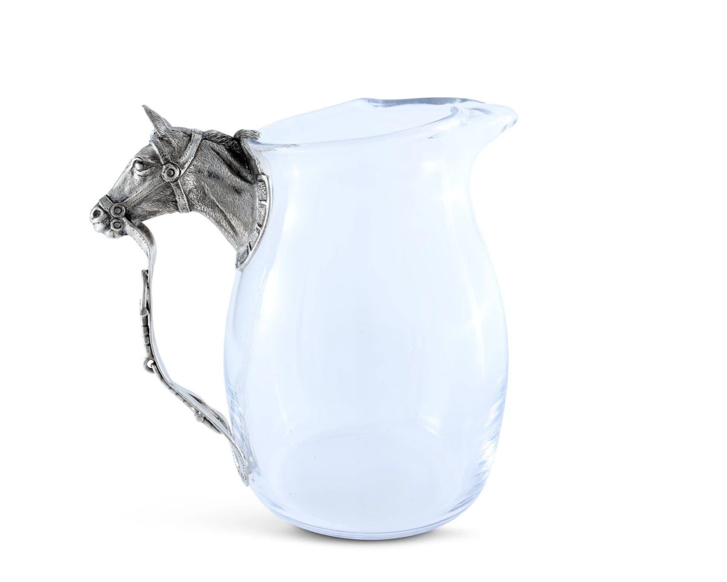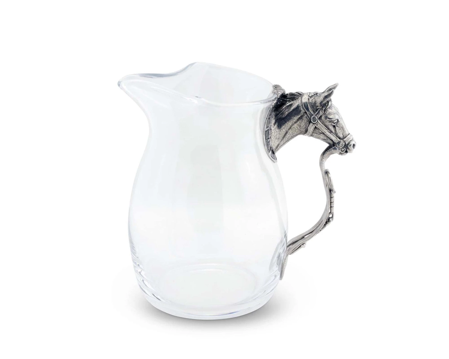 A thoroughbred’s head extends horizontally from the glass as its intricate mane wraps around the pitcher’s rim. A thick, figural strap attaches under the horse’s muzzle before winding towards the base to complete the handle. The pure-pewter design displays incredible realism in its exquisite form.