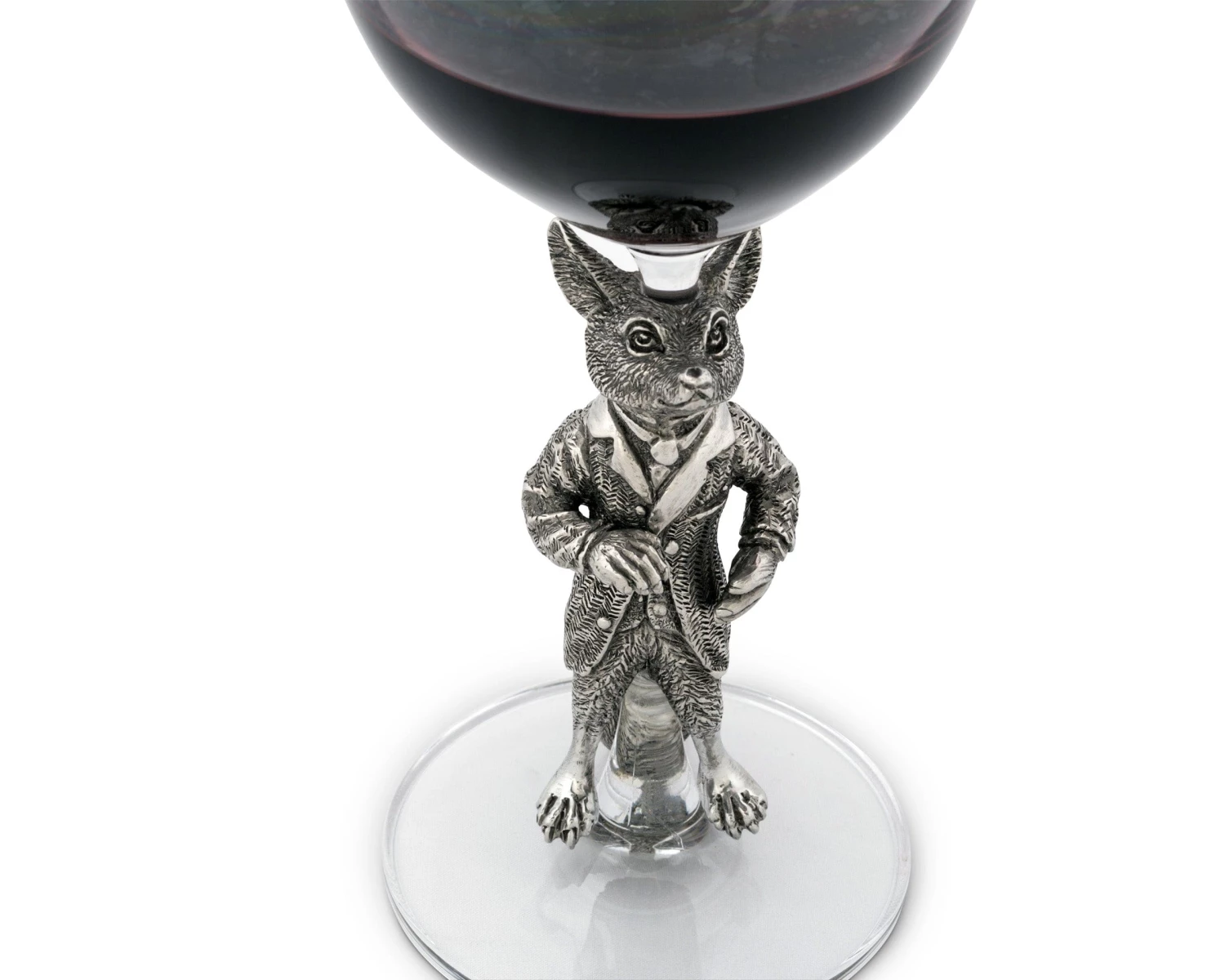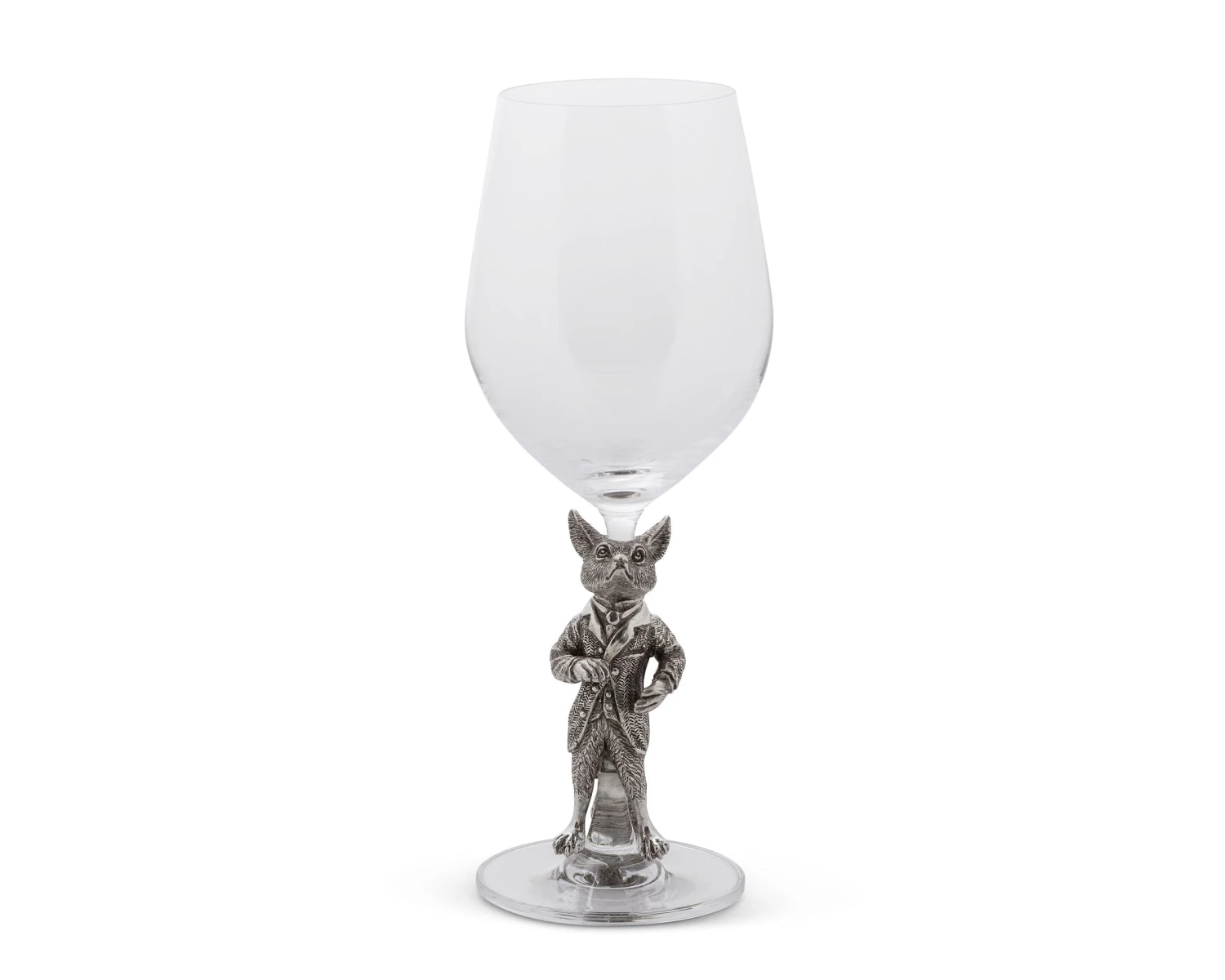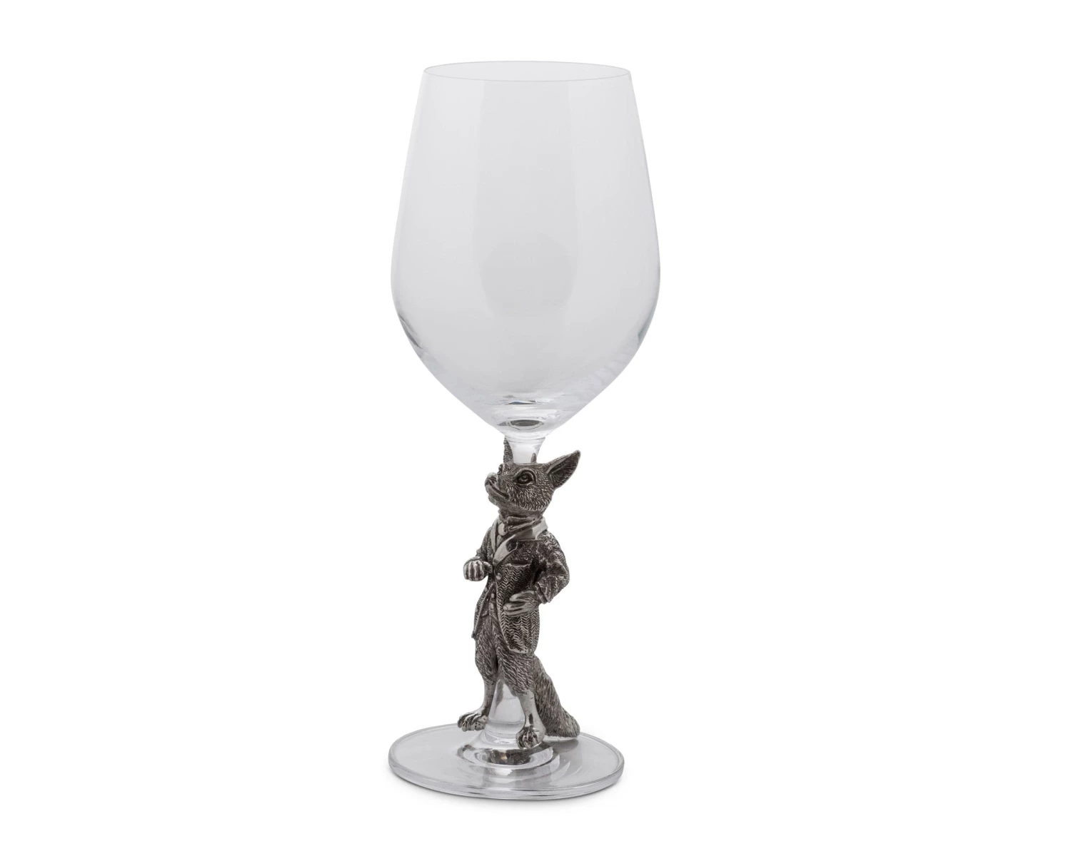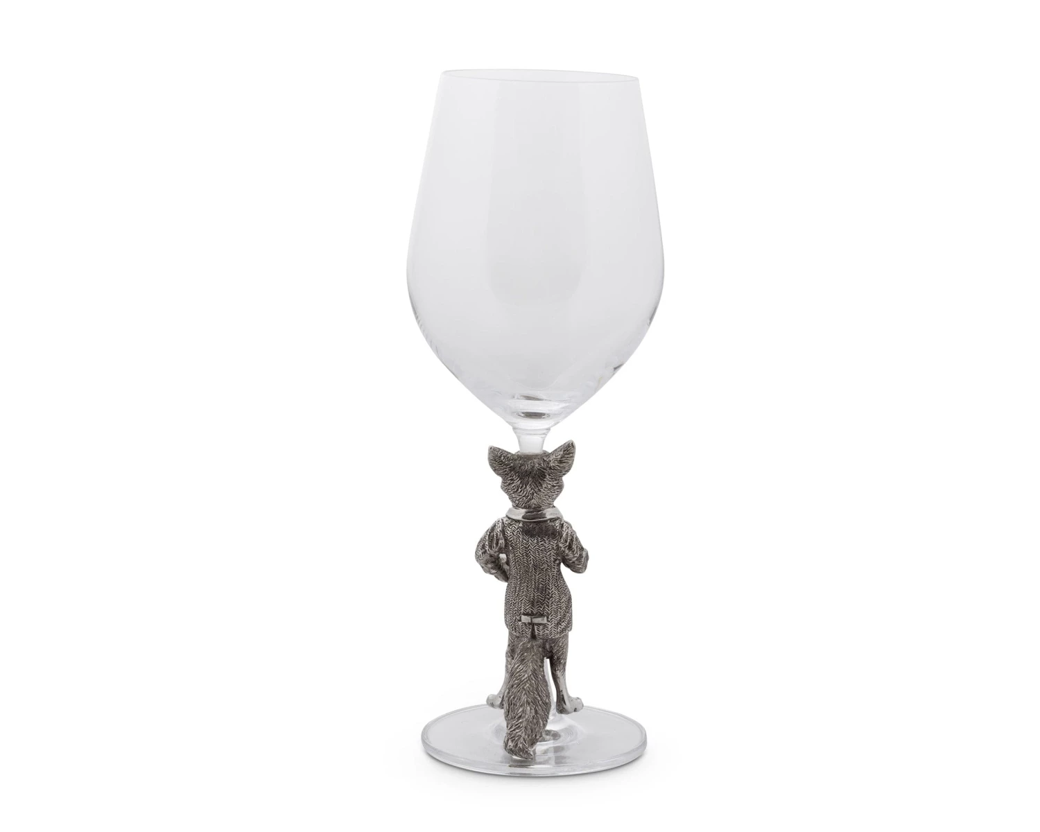 Pour a glass of your favorite vintage in this Vagabond House white wine glass. The stem sports a dapper dressed fox, who is cast in pewter for staying power. Above, the bowl of the glass is shaped to ensure the best presentation and taste of sweet, crisp or dry white wines. Serve chilled dessert wines right out of the fridge, or warm things up with a mulled wine recipe you can sip with guests next to a fire or on an autumnal patio. The glass measures 3 x 3 inches and stand 9.5 inches, so it’s also the right size for integration into most table settings. The fox accent adds a whimsical conversational touch, and you can pair the glass with other nature-inspired dinner and drink ware for a comprehensive statement.