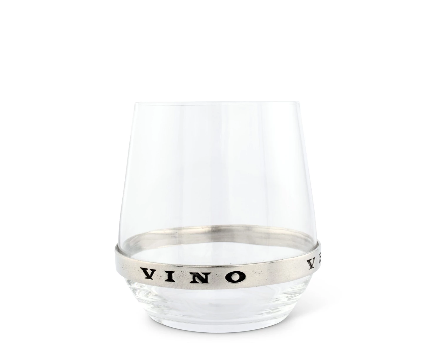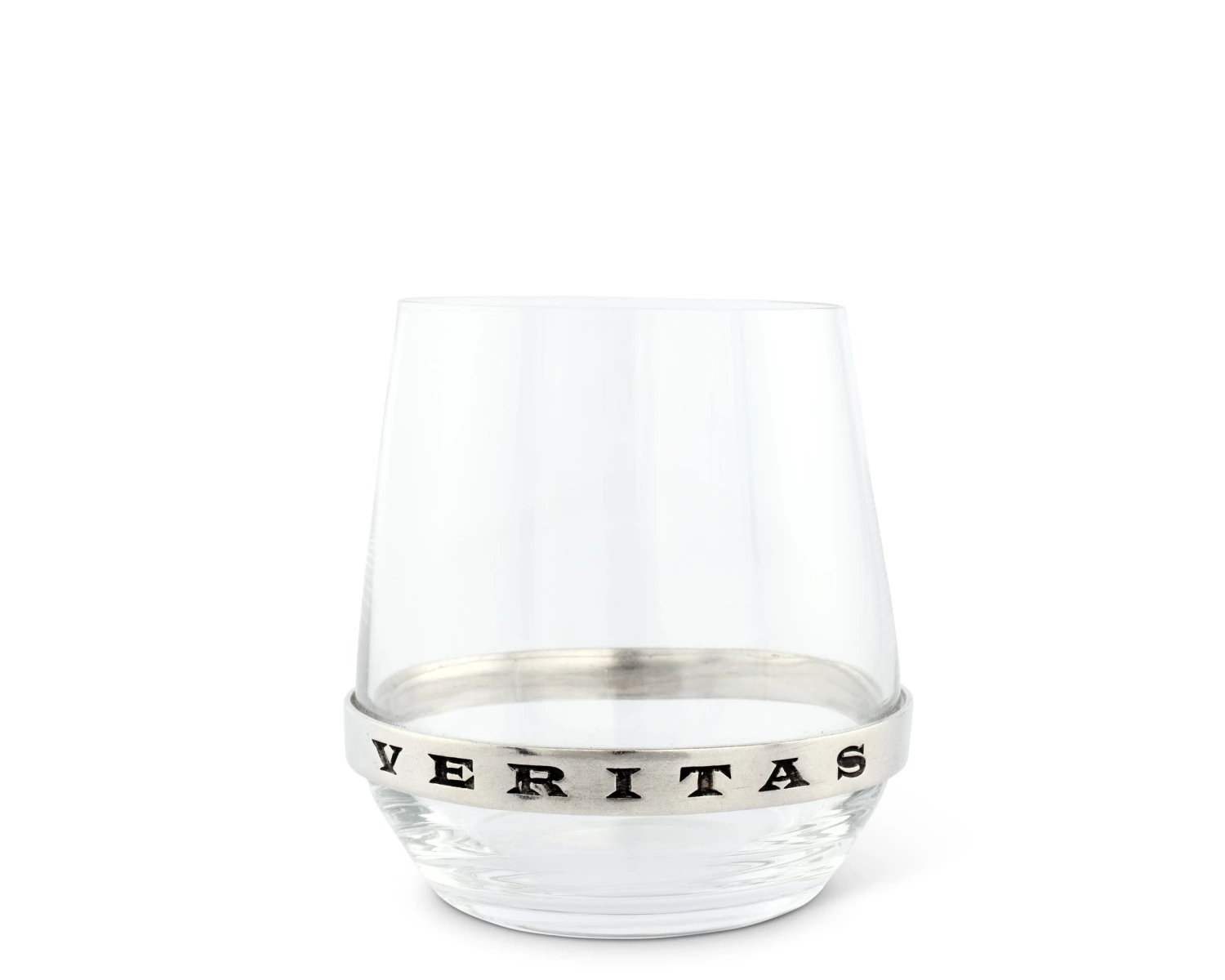 IN VINO VERITAS the Latin homily translating as “In wine, there is truth.” is inscribed on a polished pewter band encircling our Italian glass Stemless Red Wine glass. Designed specifically to enhance the red wine experience, the pewter band with the Latin phrase adds old world charm to modern, casual and fun wine service.