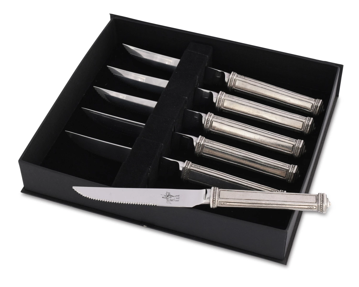Crafted in luxury-grade pewter, the handles are column-style, with beaded banding and stylized leaf engravings. The architectural handle shape contrasts beautifully with each knife’s sleek, stainless steel blade. This set includes six knives.