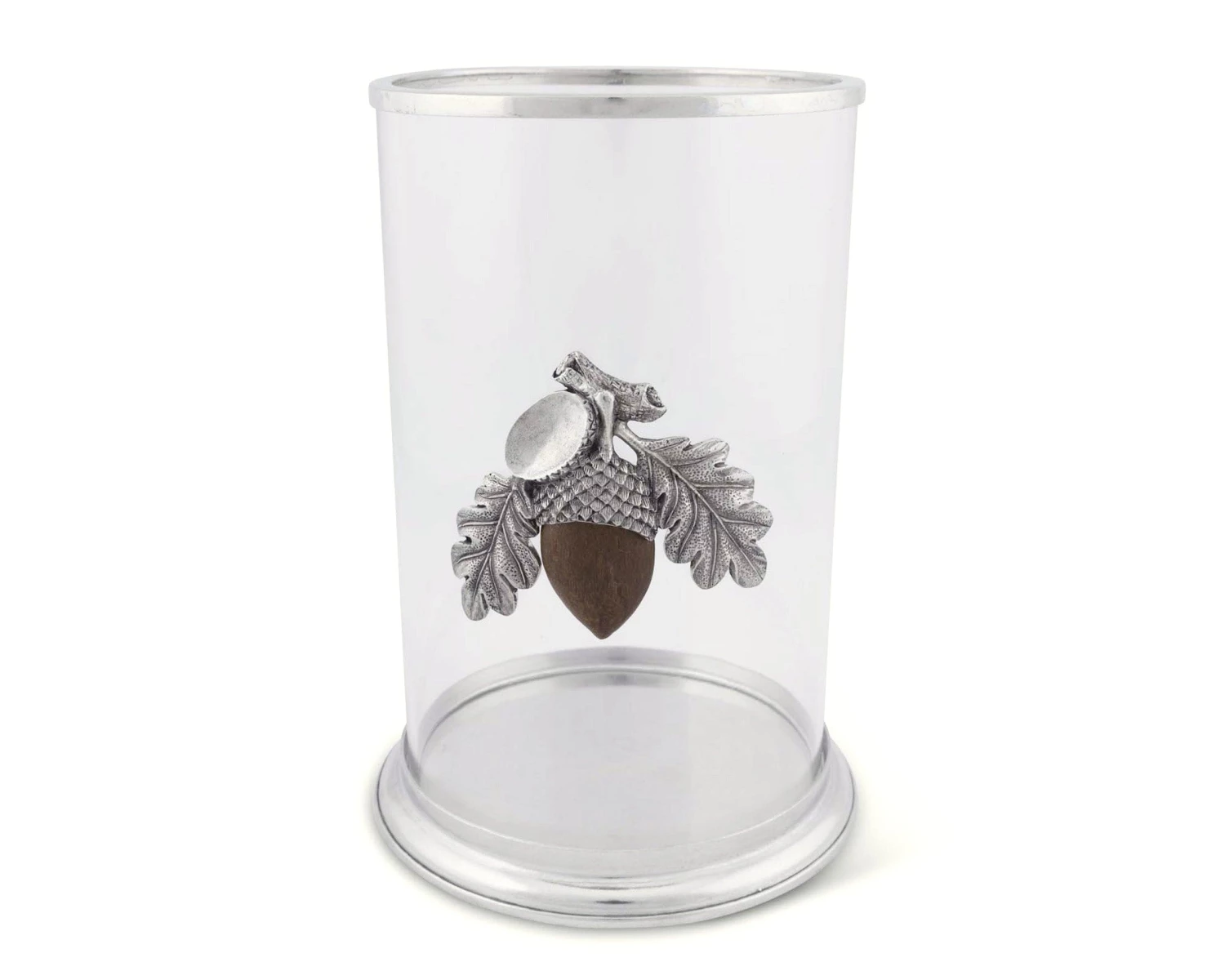 A dark, wooden nut attaches to a pure-pewter cupule in the center of this Large Acorn Pillar Candle Holder. The divided acorn hangs from a branch in the center of the glass as intricate leaves and an empty cupule extend from the surrounding stems. The clear, glass holder accentuates the remarkable definition within each of the pewter designs.